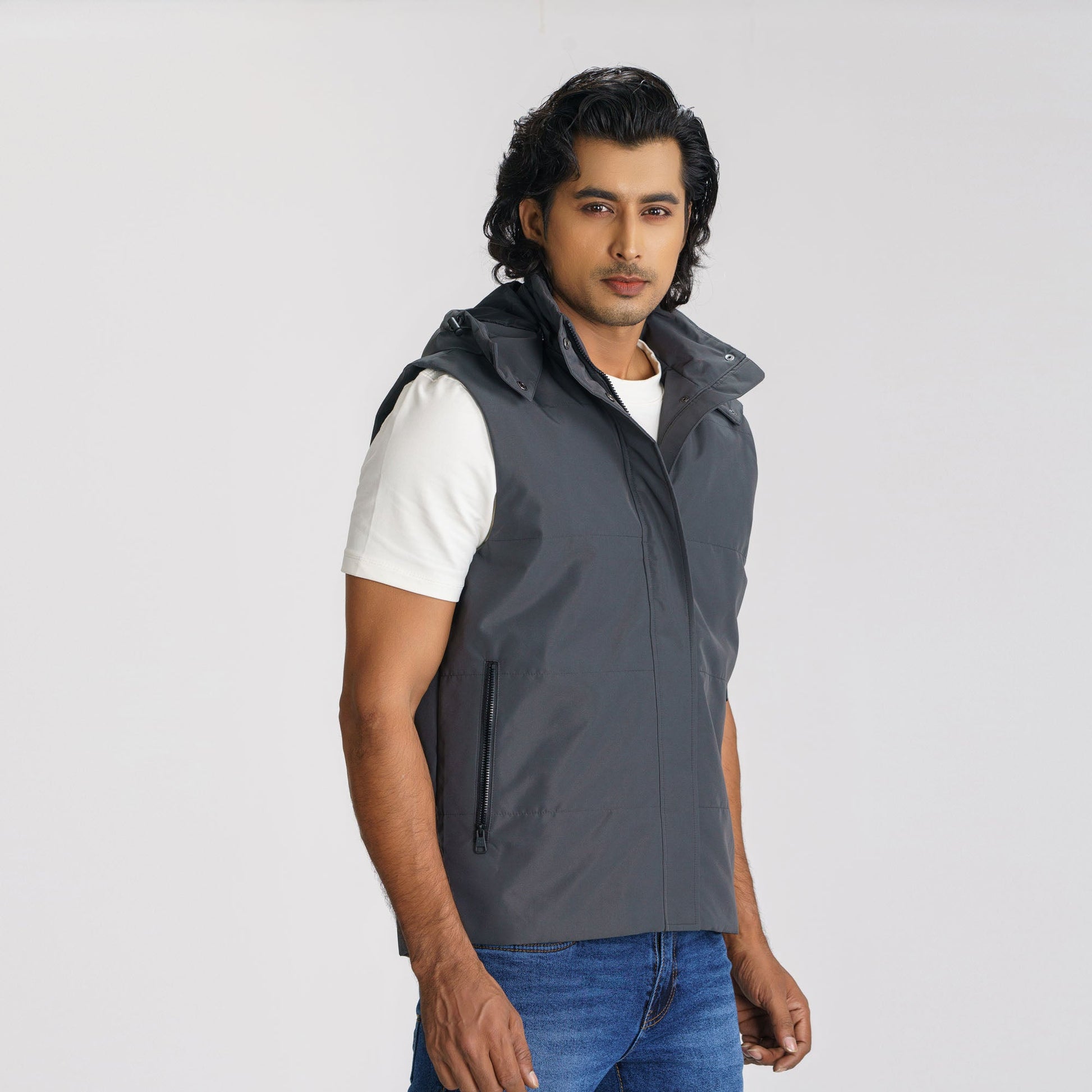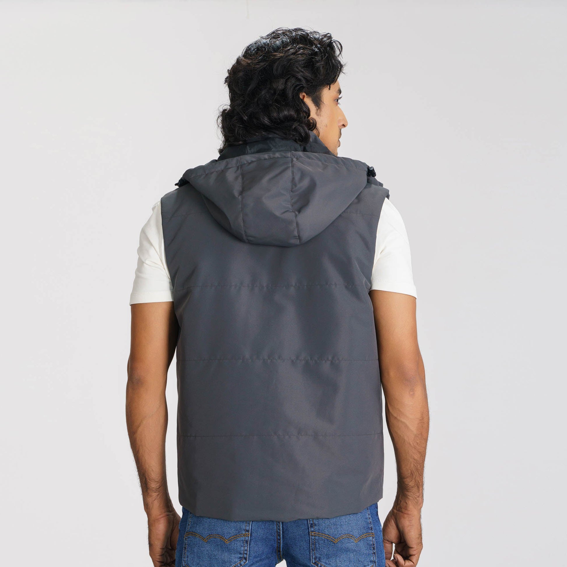 Gear up for the chill with this dark gray sleeveless padded jacket. Designed with a detachable hood, zip closure, and two functional pockets, it offers versatility and warmth. Made from 100% polyester with a solid lining, it ensures comfort and a regular fit. Ideal for layering in cooler weather.