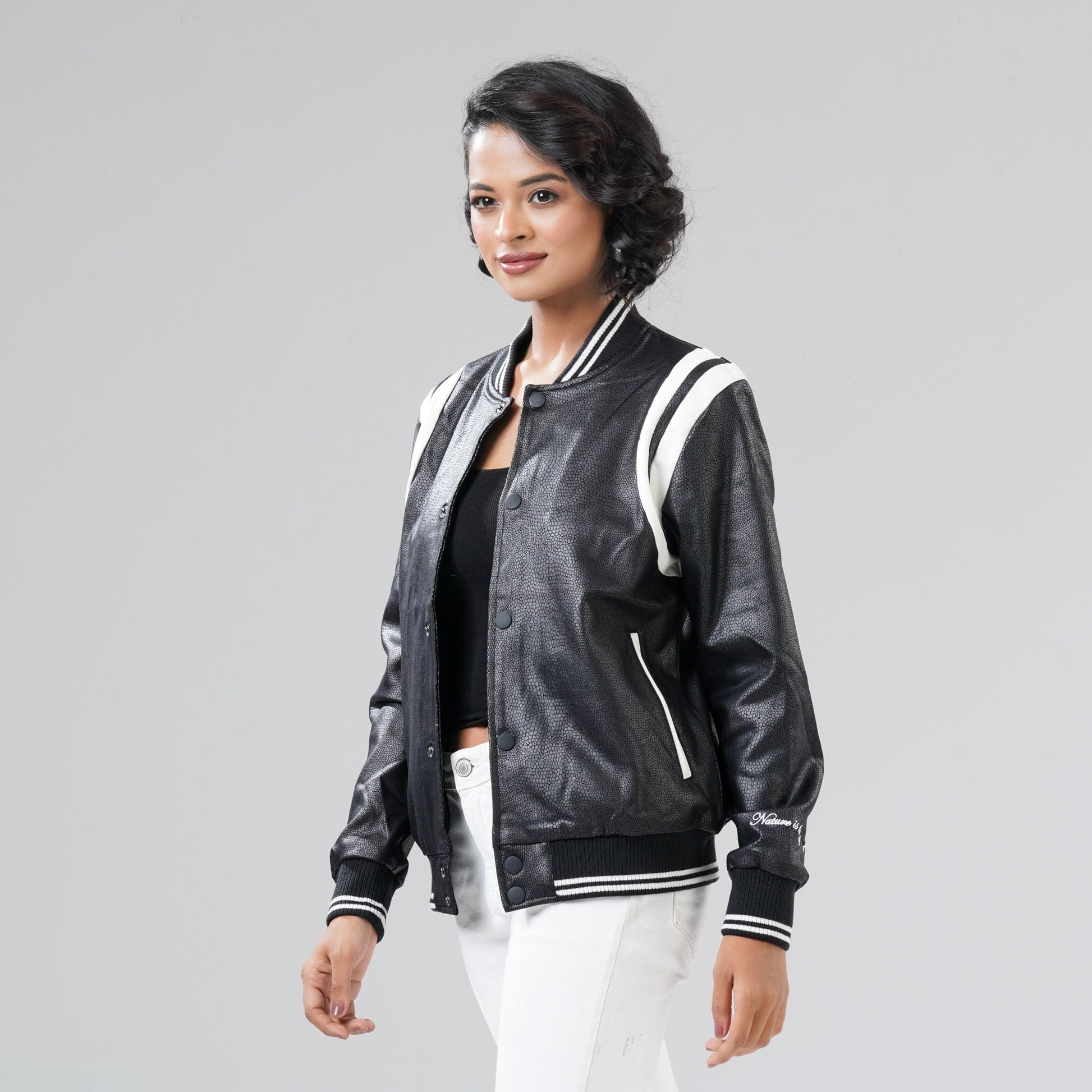 Elevate her winter wardrobe with this women's black and white PU jacket, designed in a regular fit for a classic, comfortable look. Crafted from durable PU fabric it offers a sleek style without padding. Perfect for layering during the winter season.