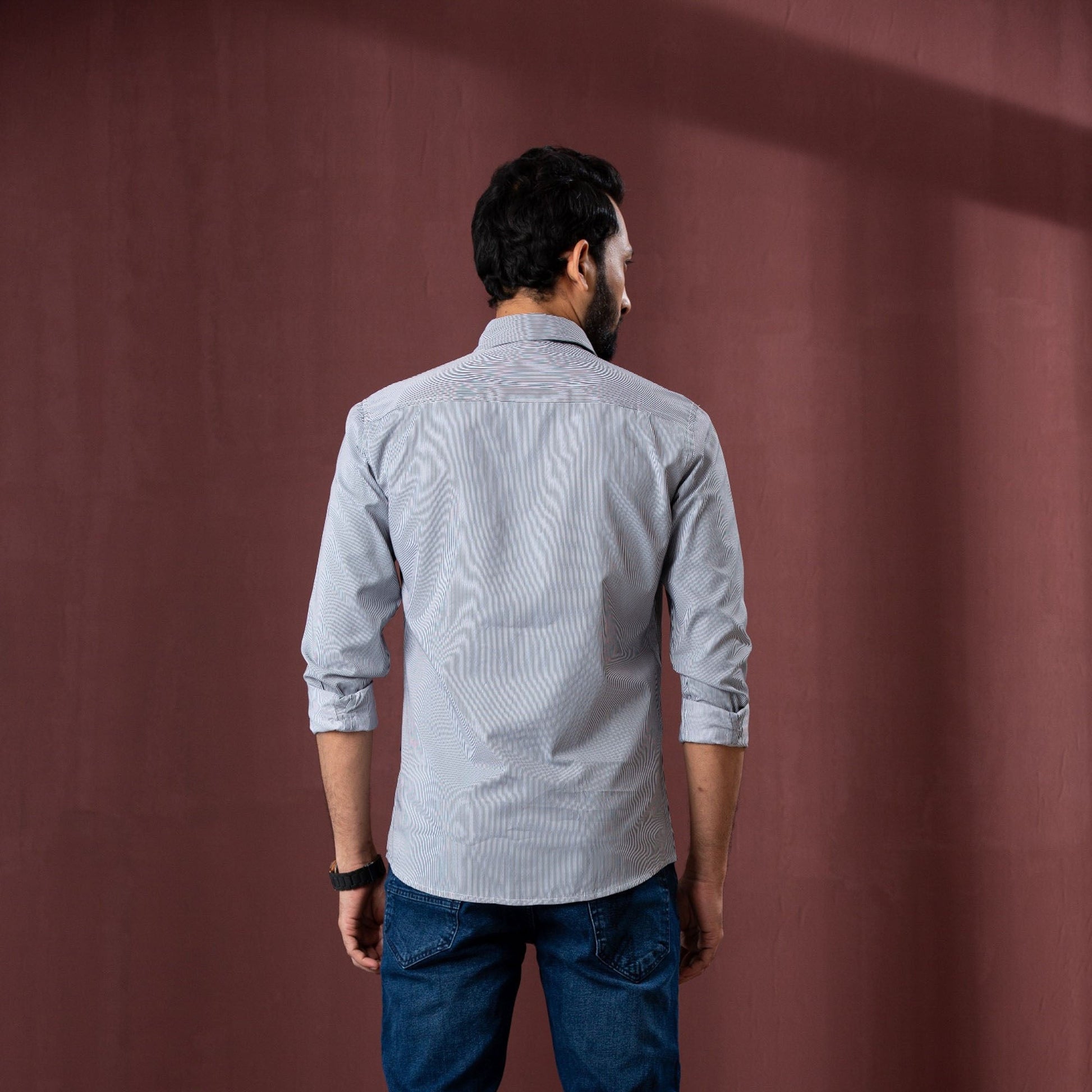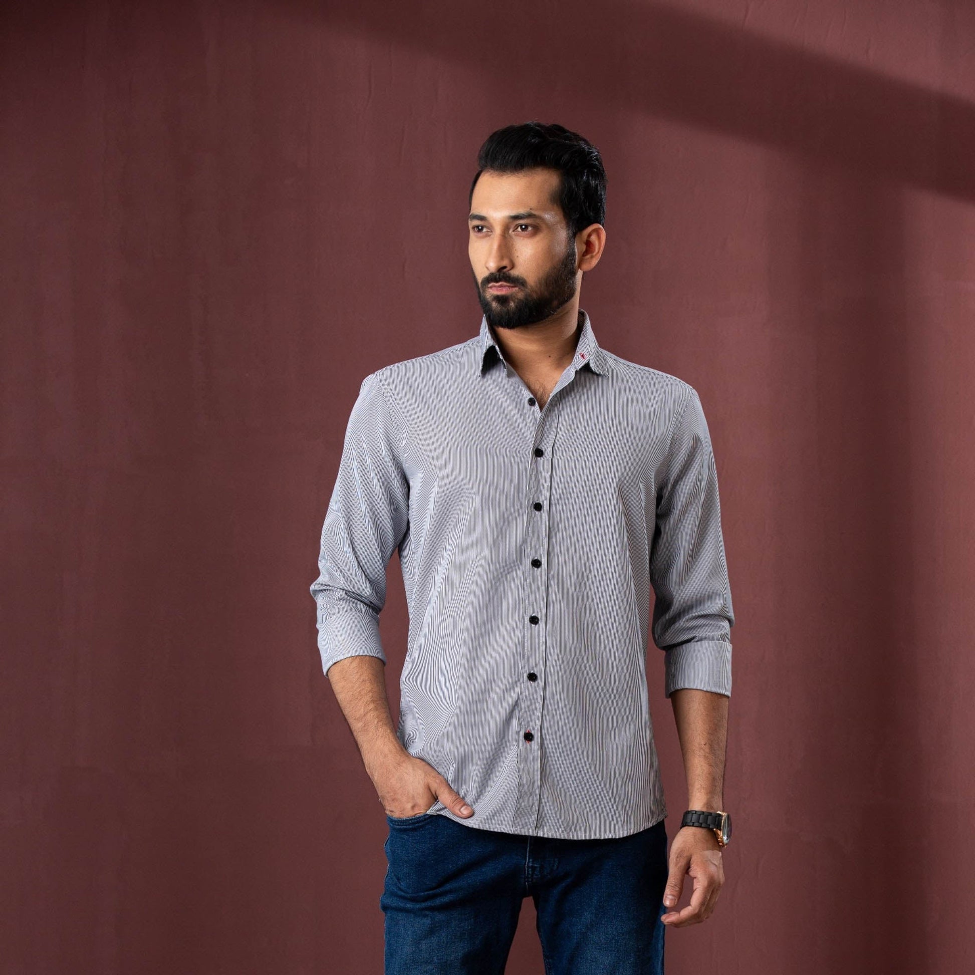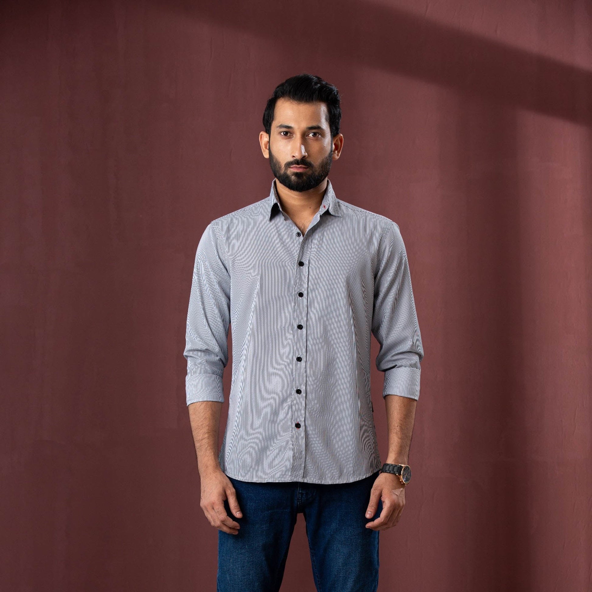 This men’s black stripe shirt is made from 100% cotton for maximum comfort and breathability. The striped design adds a touch of sophistication, suitable for both casual and semi-formal events. With a slim fit, it offers a sleek and modern silhouette that complements a variety of styles.