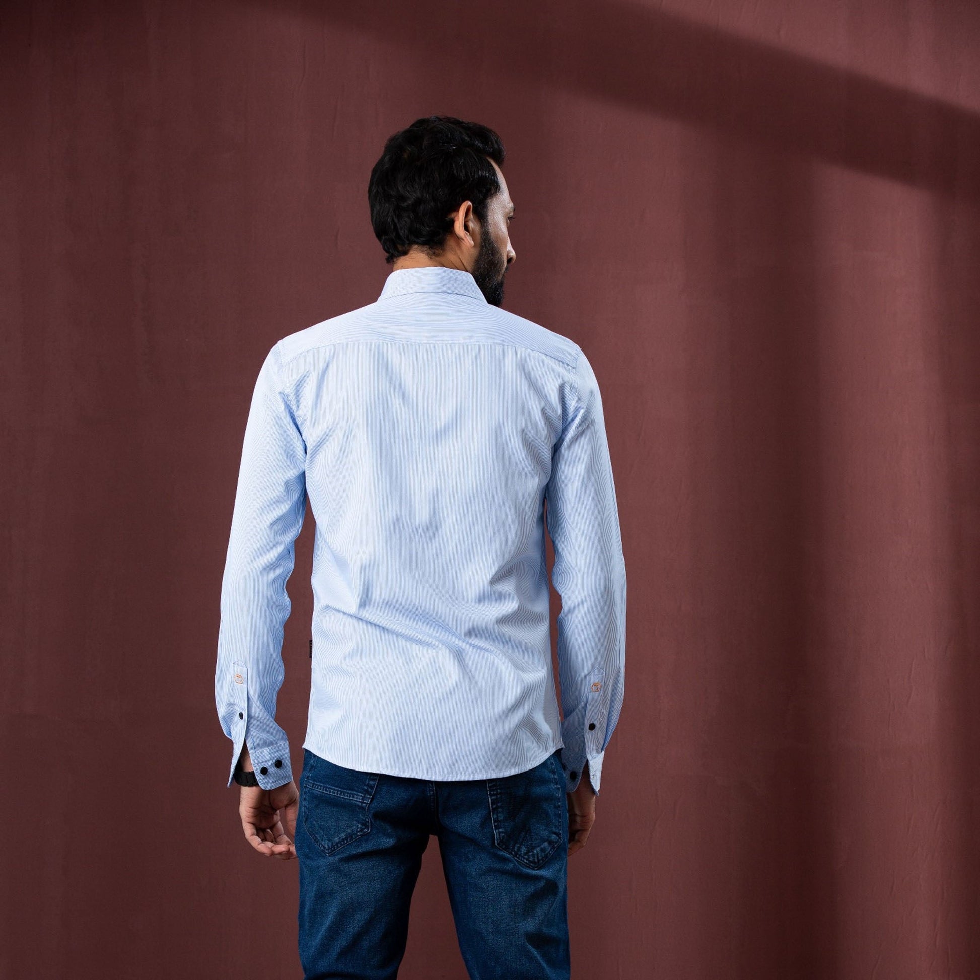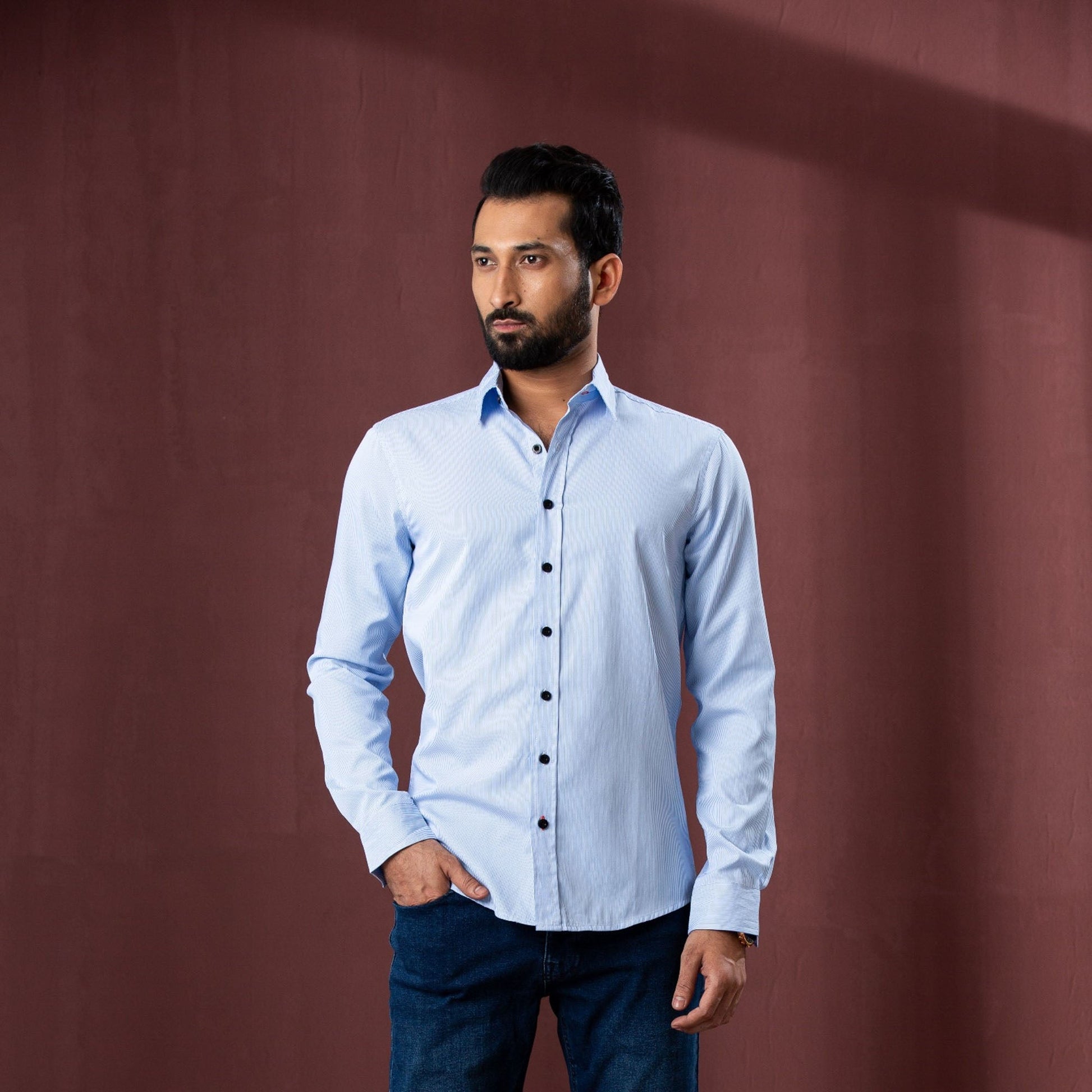 This men’s sky stripe shirt is crafted from 100% cotton, ensuring comfort and breathability. The striped pattern gives it a versatile look suitable for both casual and semi-formal occasions. The slim fit design enhances a modern silhouette, making it a stylish addition to your wardrobe.