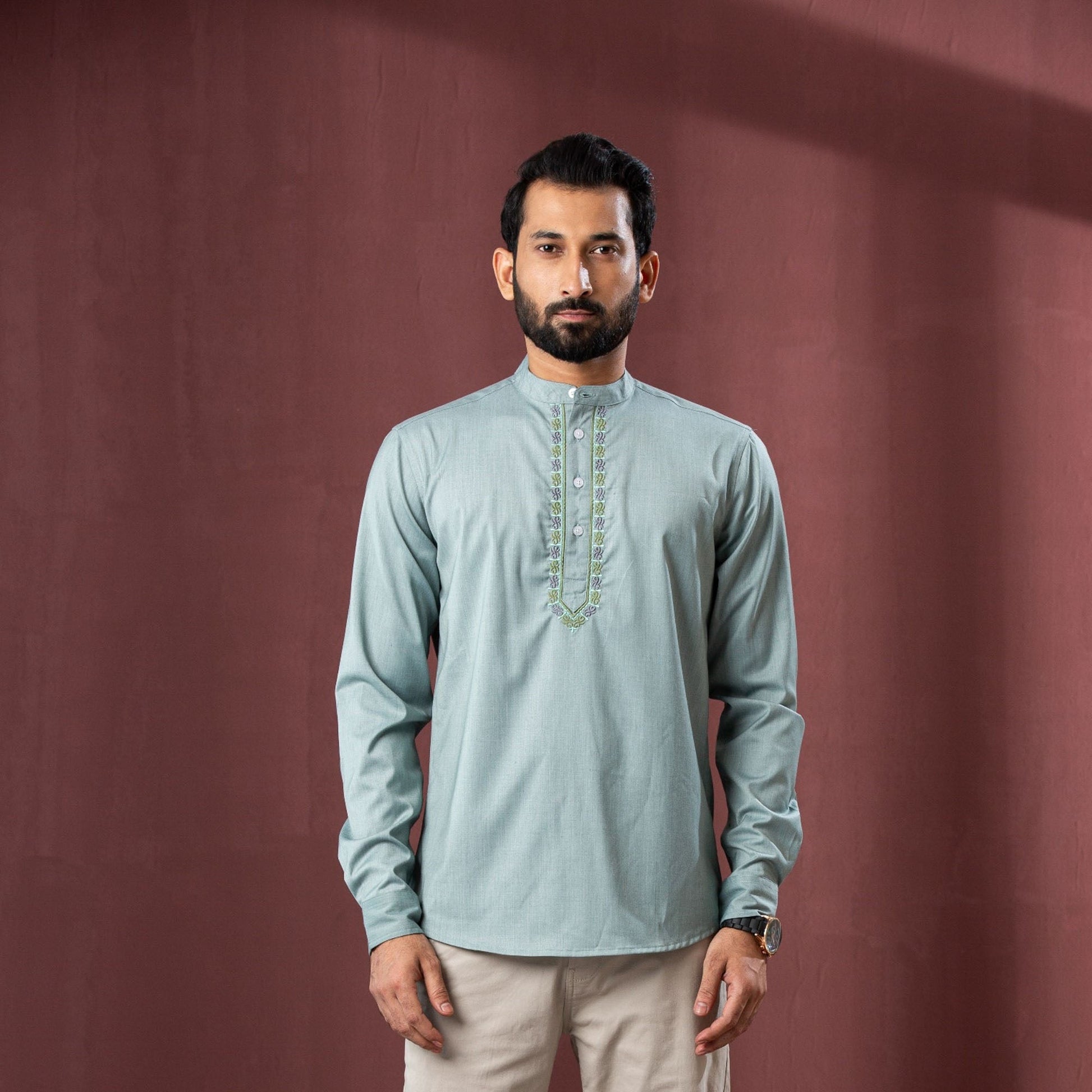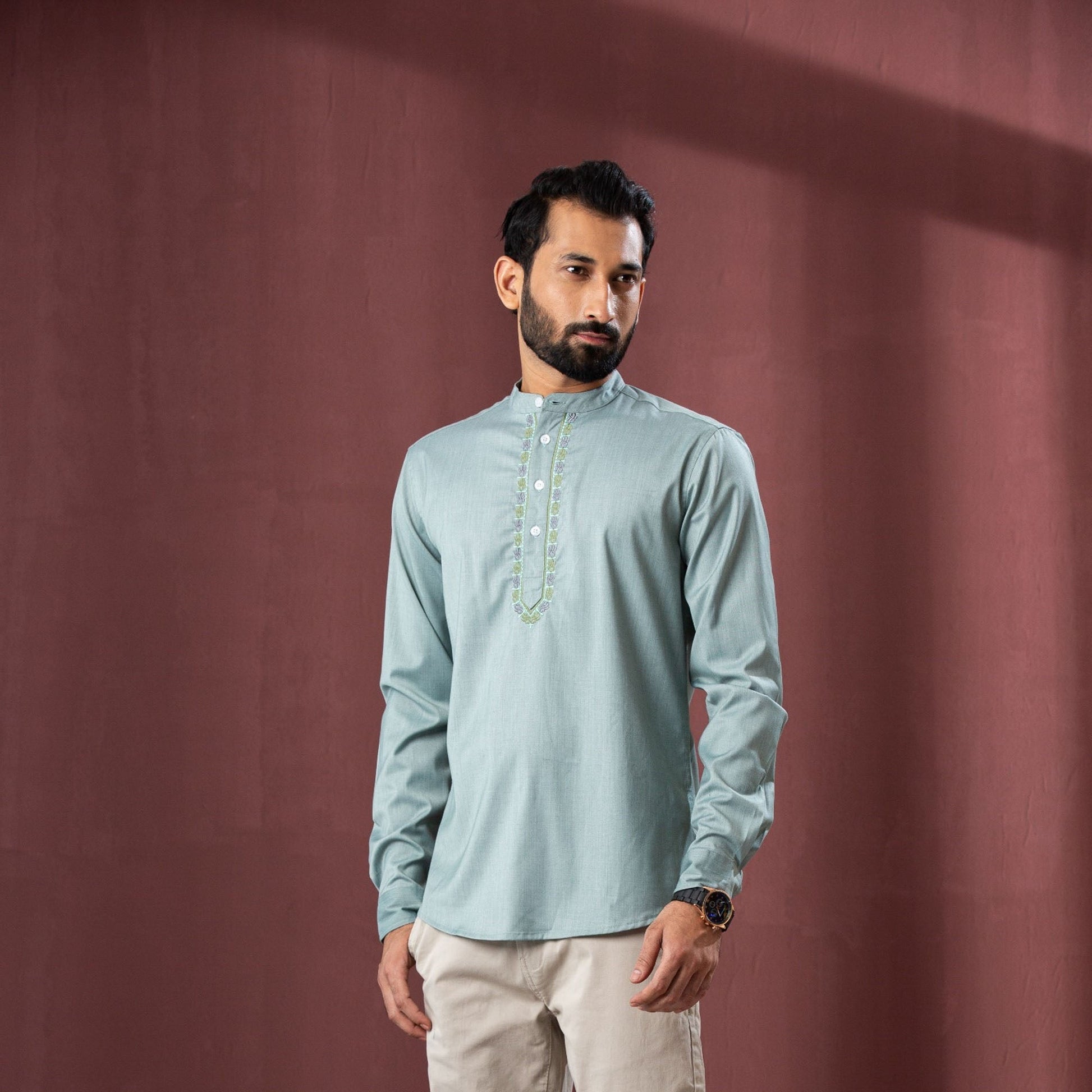 Enhance your style with this men's palace-green band collar shirt, featuring elegant embroidery and a fotua-inspired look. Crafted from blended fabric, it offers both comfort and a modern slim fit. Perfect for adding a traditional touch to your casual or semi-formal wardrobe.