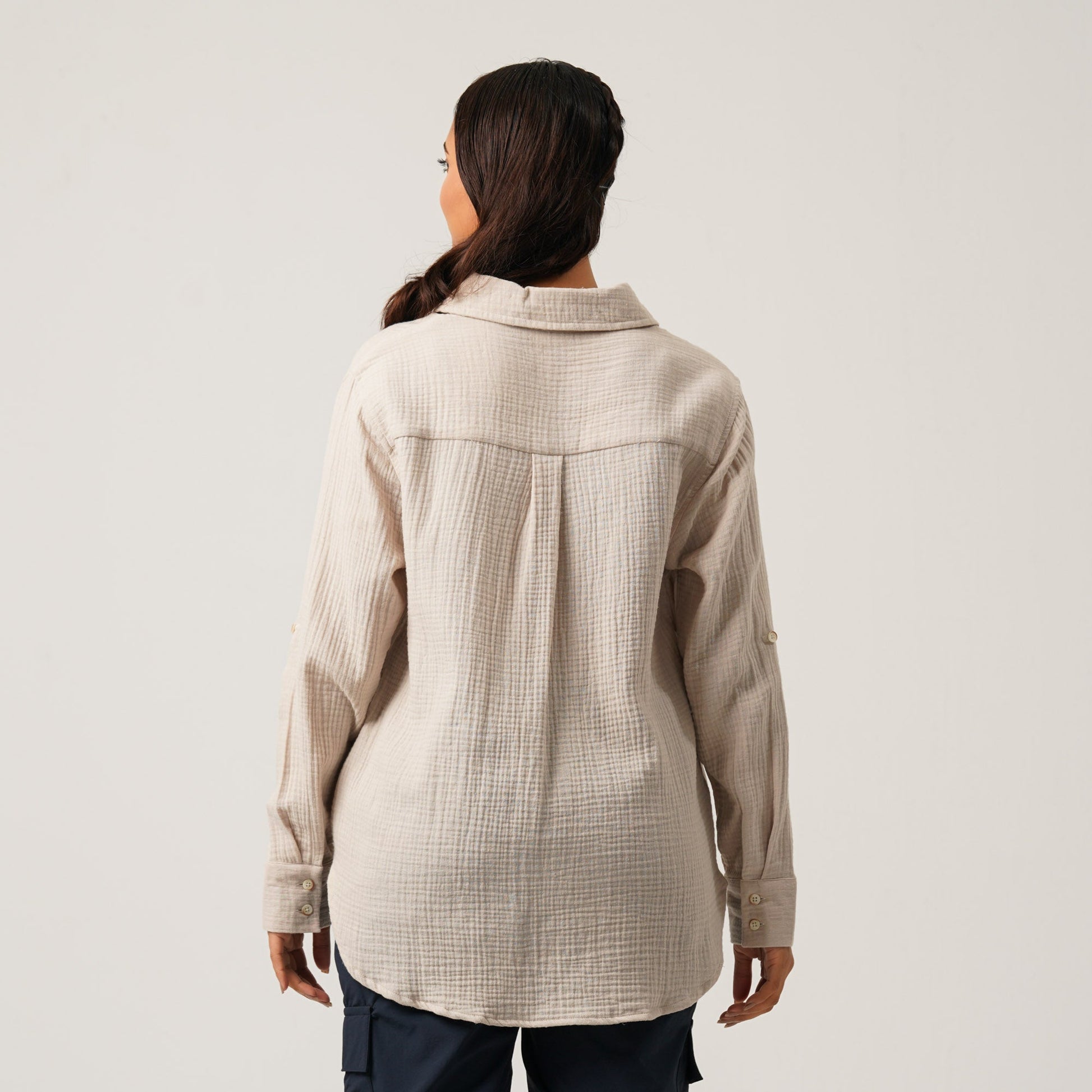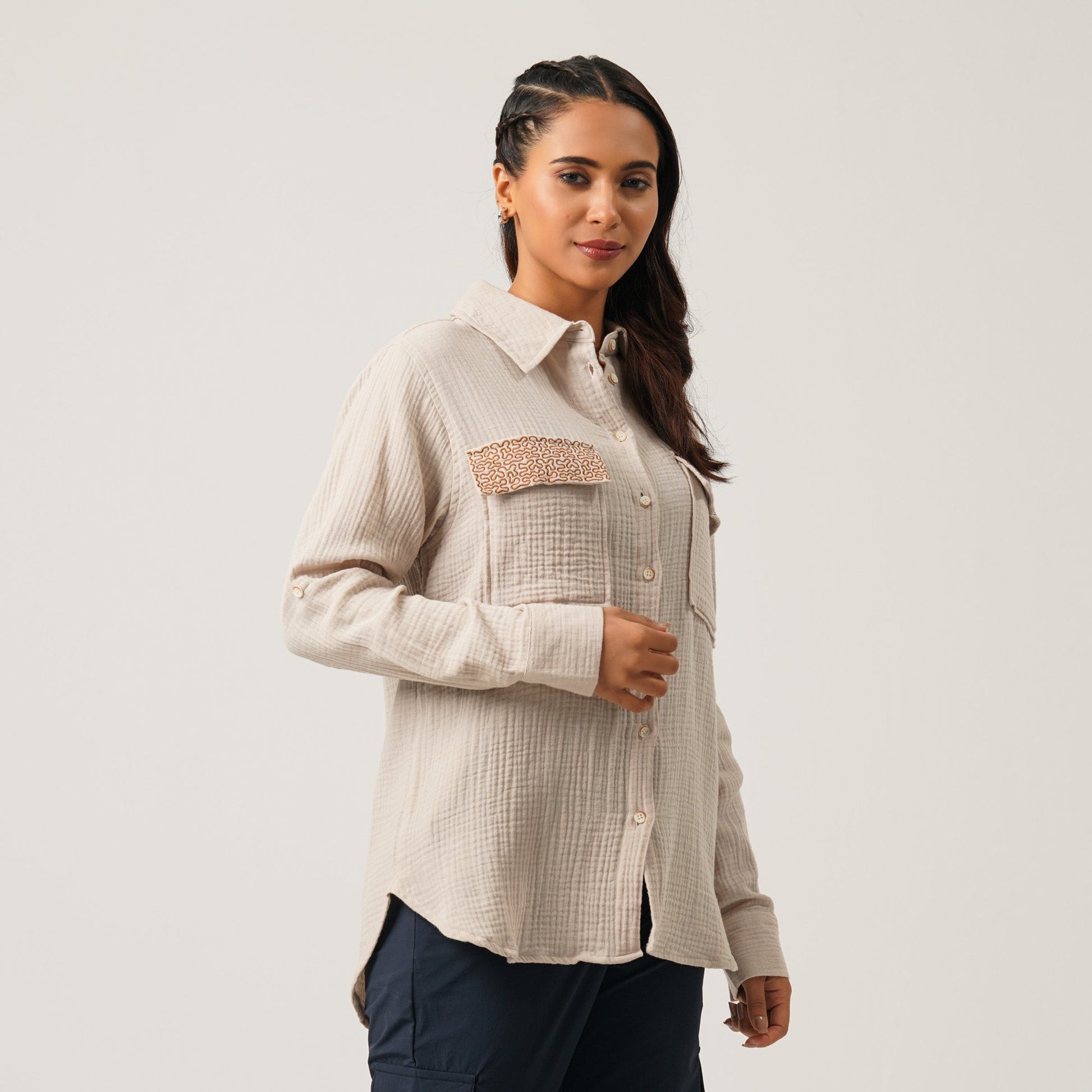 Made from 100% cotton, this boxy fit long sleeve shirt offers both comfort and casual elegance. It features a chest pocket with flap, delicate embroidery detailing, and a rounded hem at the back for added style. Perfect for effortless everyday wear.