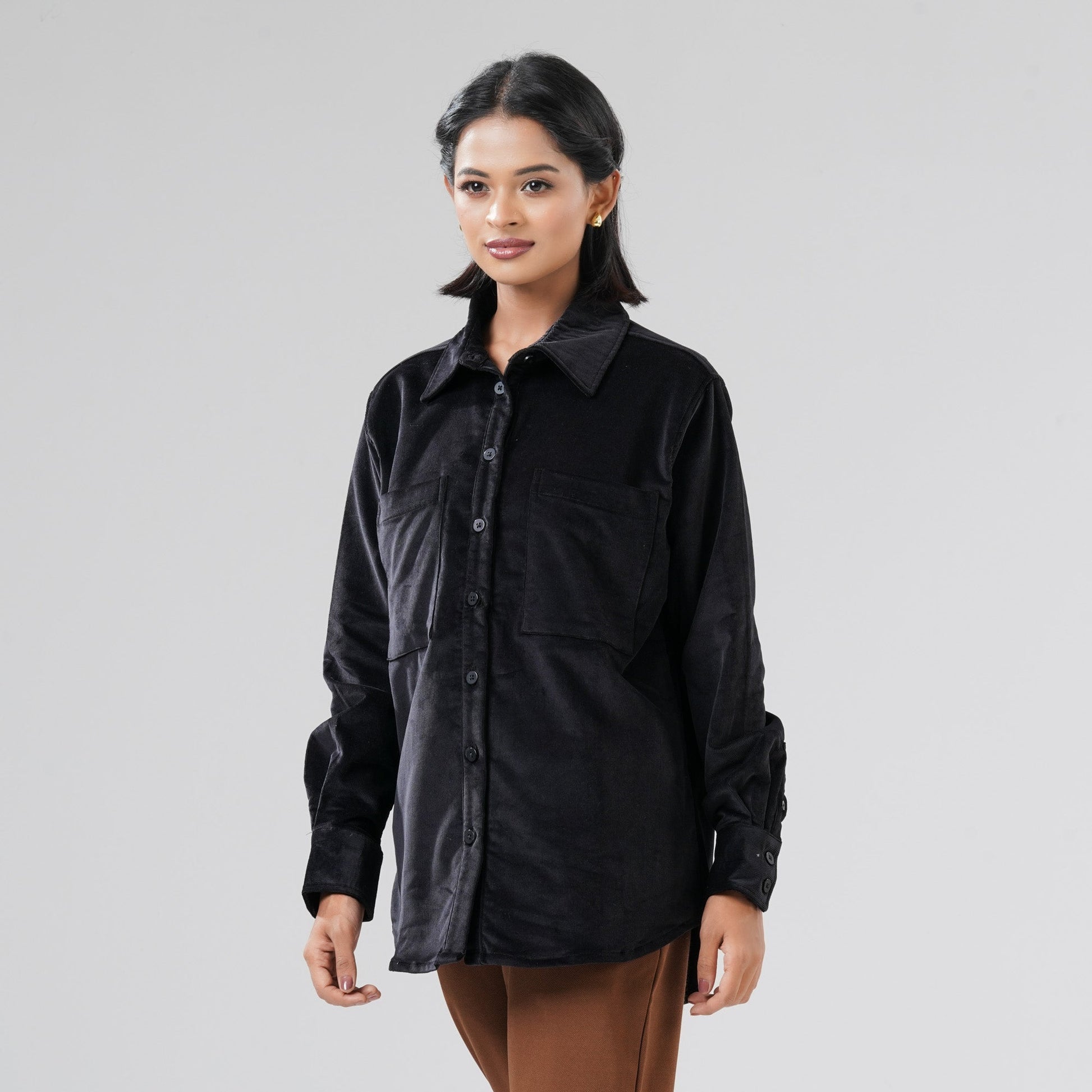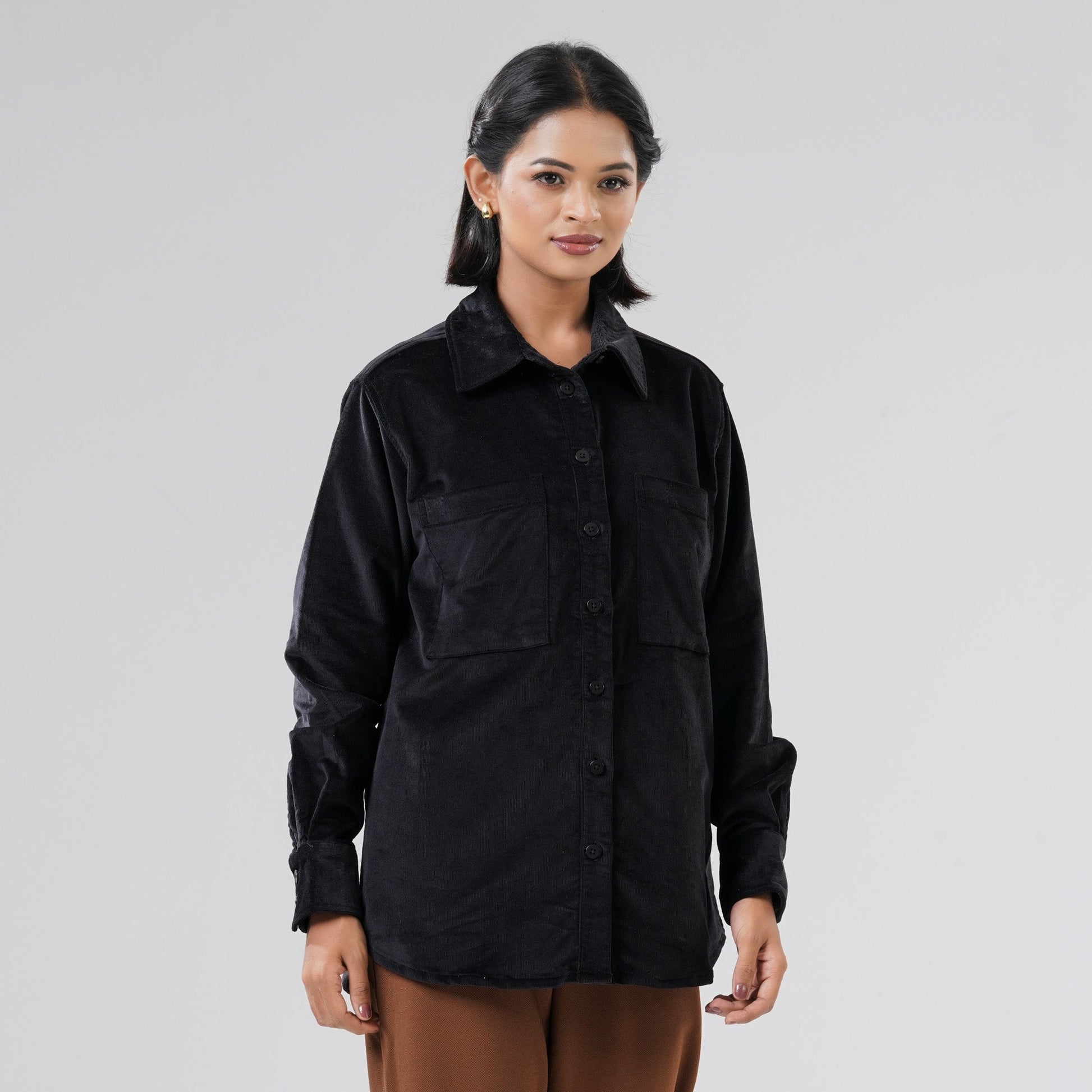 Add effortless style to her wardrobe with this womens black long-sleeve shirt, crafted from 100% cord for a soft and breathable feel. Designed in a boxy shape with drop shoulders, it features cuffed sleeves and dual chest pockets for a relaxed yet polished look. Perfect for casual winter days.