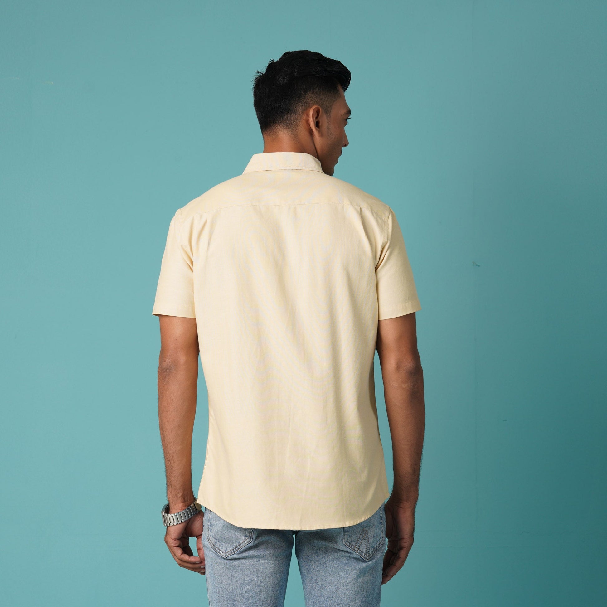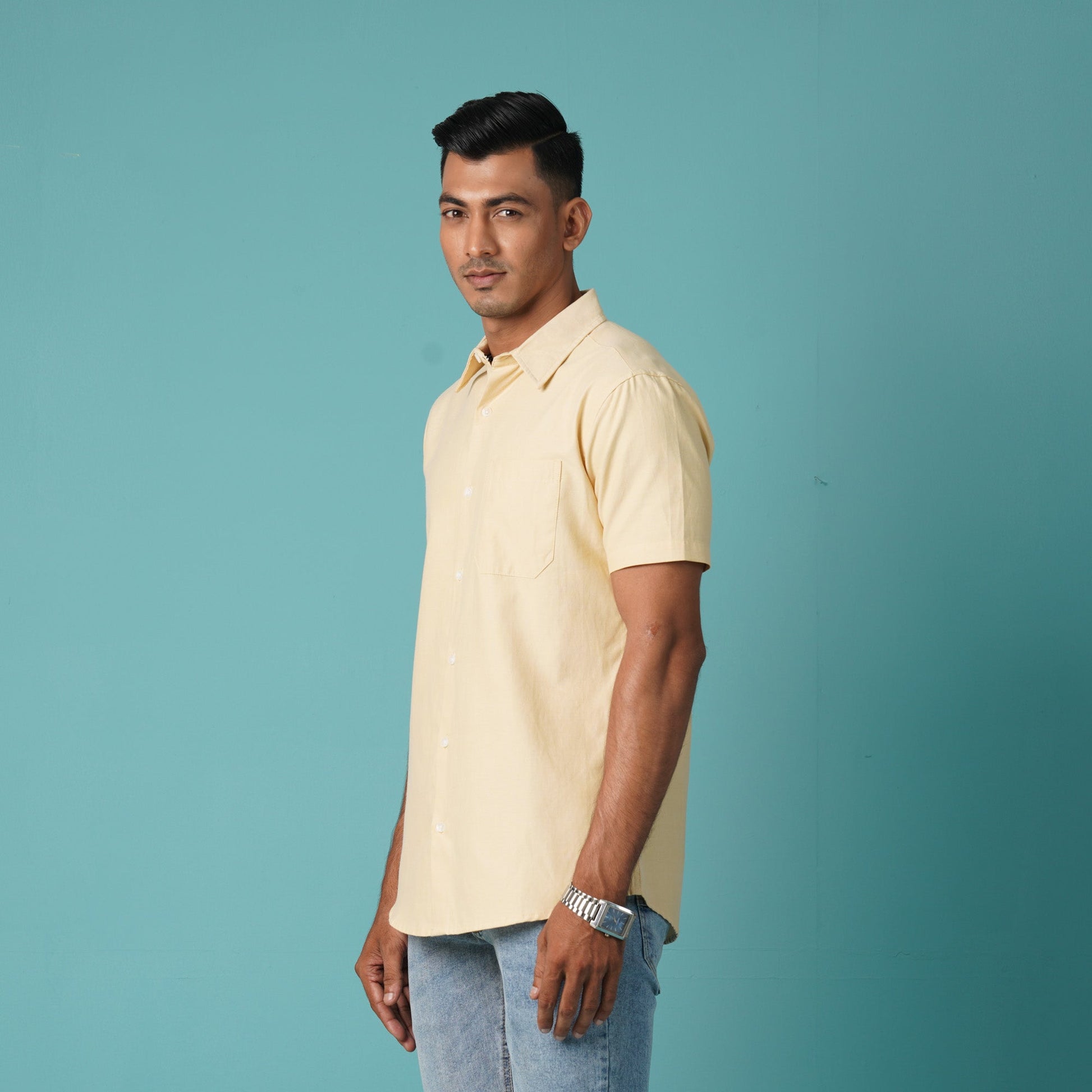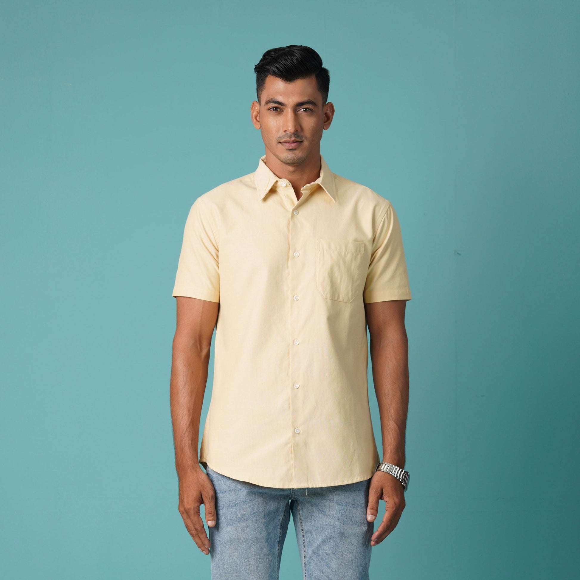 This men's yellow short sleeve shirt is a stylish and casual option, featuring twill tape placement and a chest pocket for added detail. Made from a blended fabric, it offers a slim fit that ensures both comfort and a modern look, making it ideal for everyday wear.