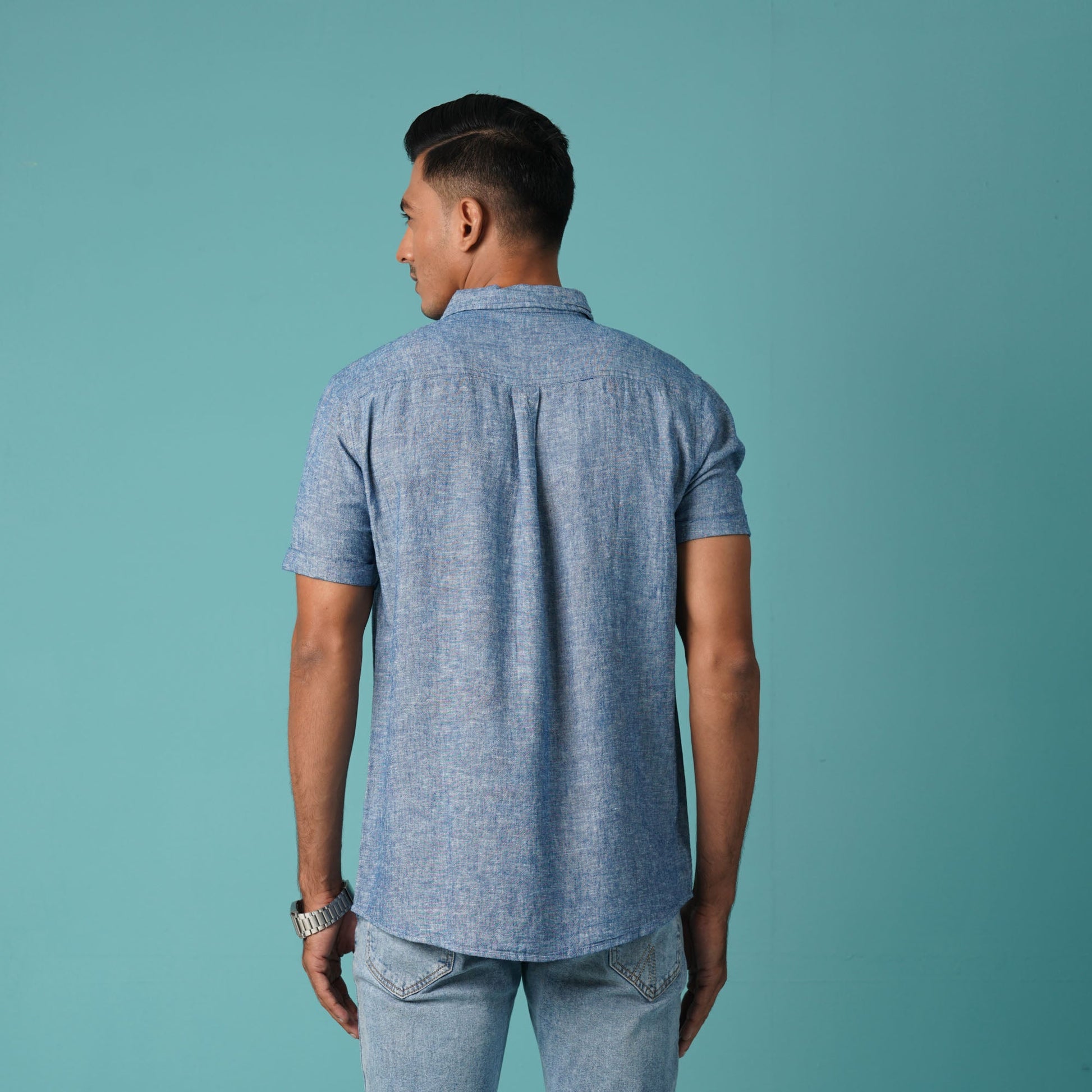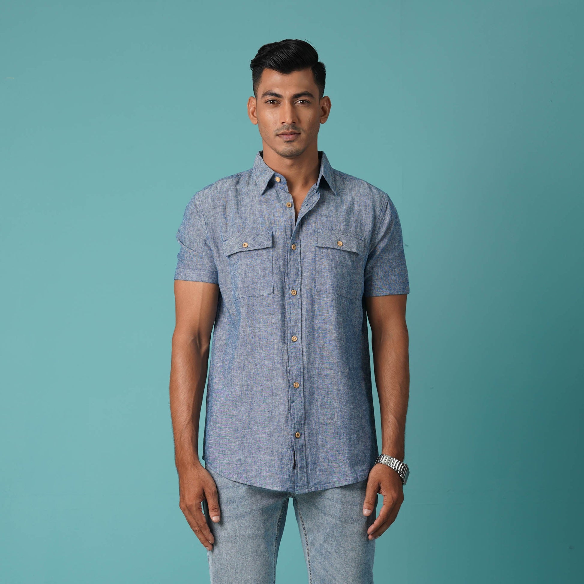 This men's navy short sleeve shirt combines casual style with a classic look. It features a chest pocket and contrast buttons, adding a touch of detail. Crafted from a blended fabric, this slim-fit shirt offers a sharp and comfortable fit, perfect for any casual occasion.