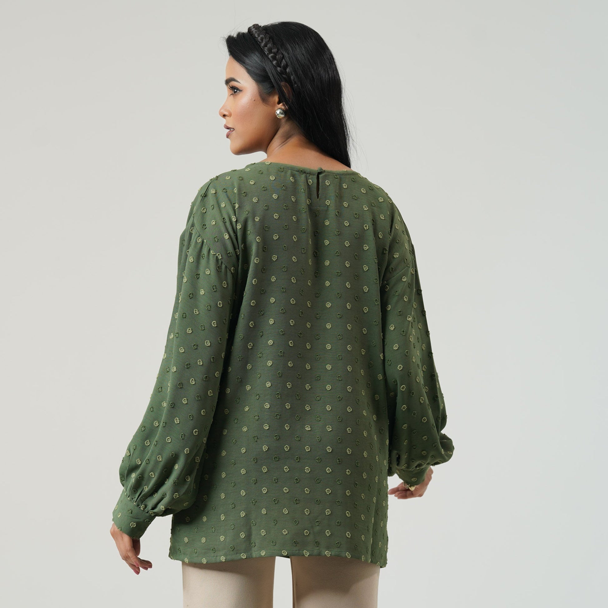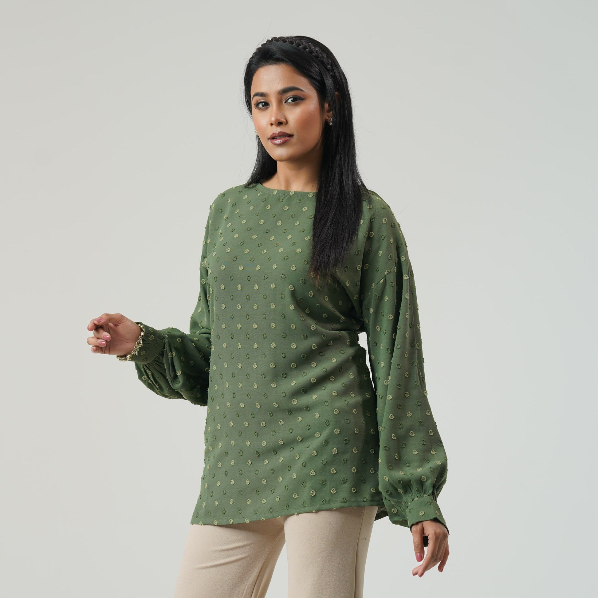 This stylish women top is crafted from a soft blended fabric, offering a comfortable and elegant fit. Designed in a sophisticated olive shade, it’s perfect for both casual and semi-formal wear. Pair it with your favorite bottoms for a chic and effortless look.