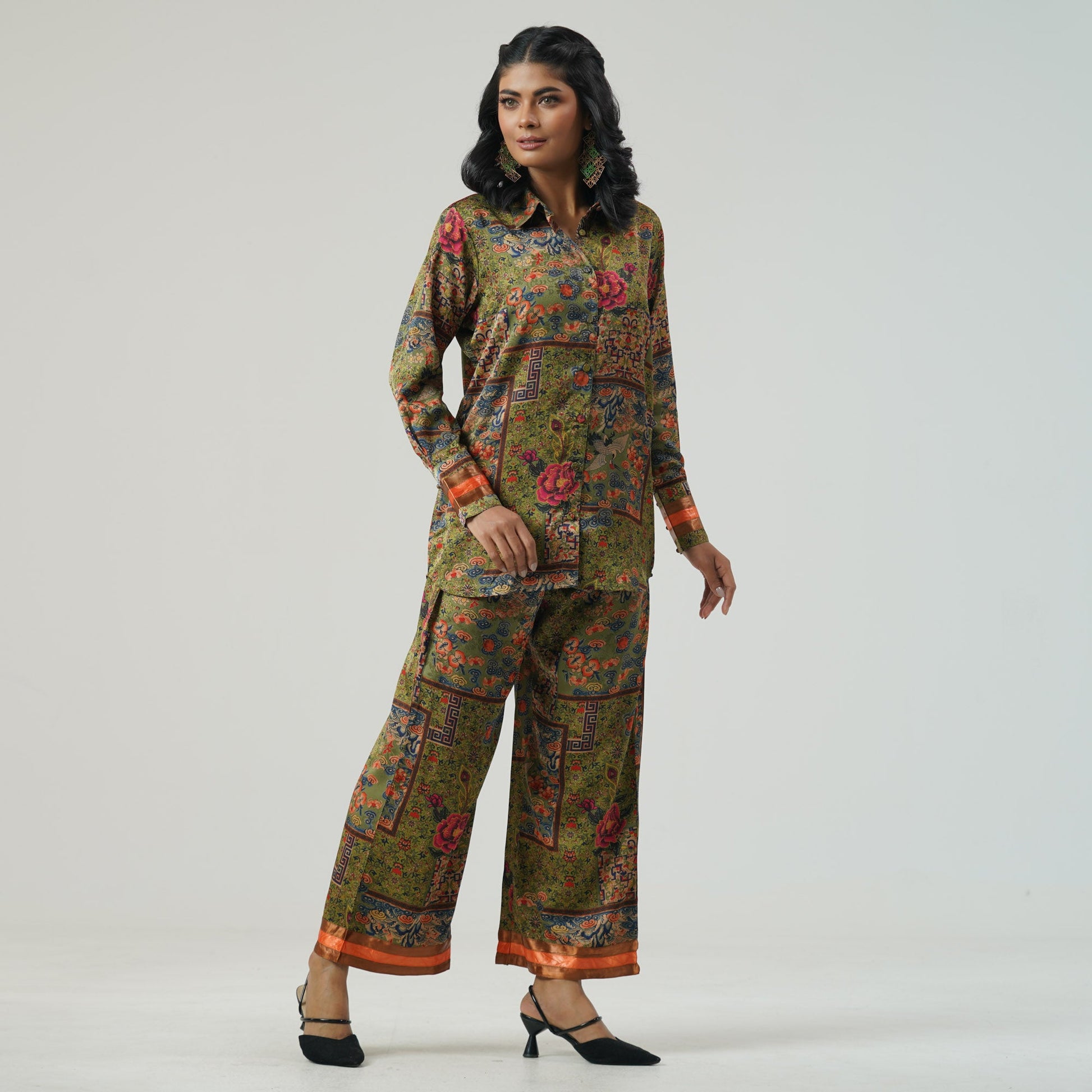 This stylish top and pant set features a regular-fit long-sleeve shirt with shell fabric-covered buttons for a refined touch. The contrasting details at the sleeve cuffs and bottom hem add a chic accent, making it perfect for versatile styling. Crafted from 100% polyester, this set ensures a comfortable and polished look for any occasion.