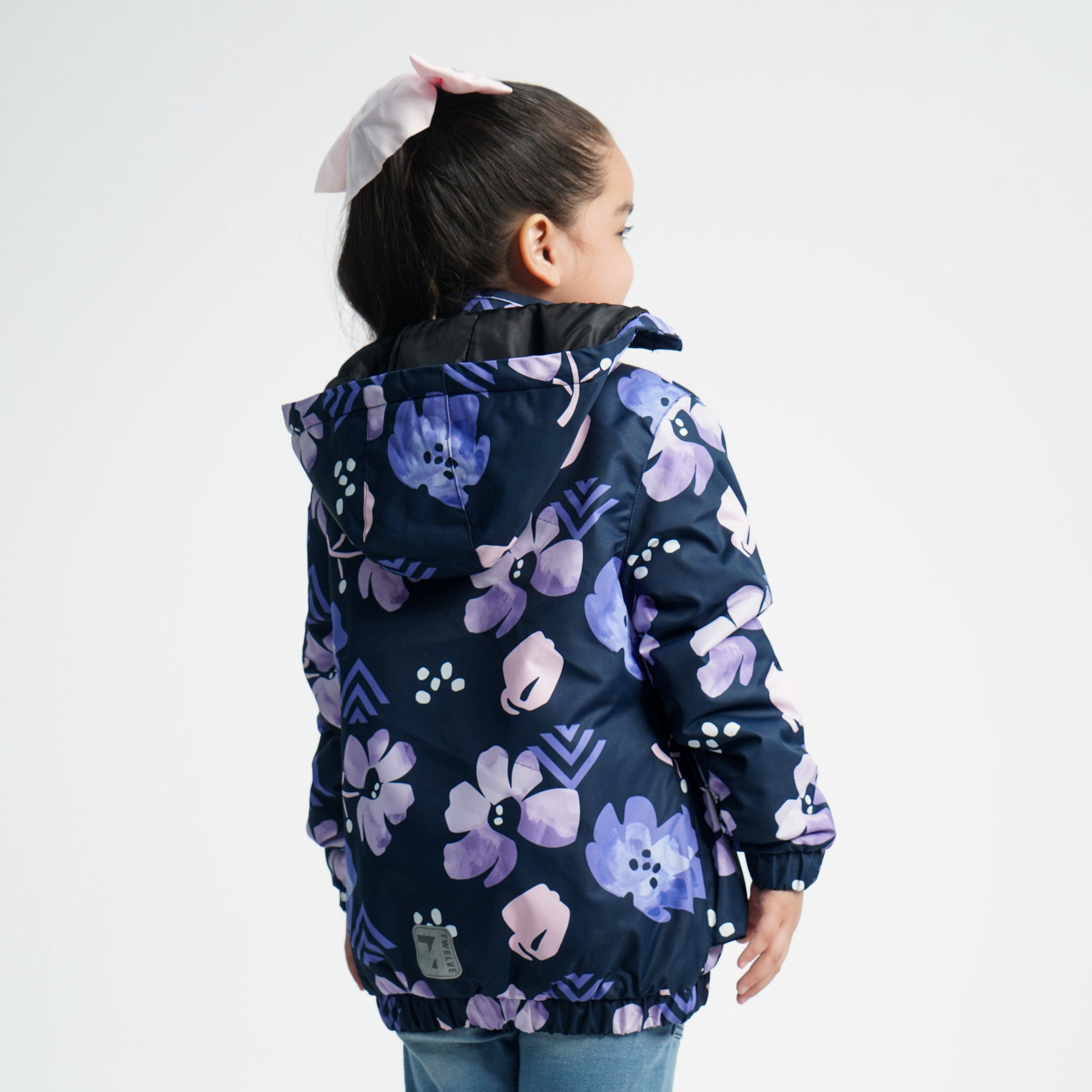 Keep her cozy and stylish with this navy aop printed windbreaker featuring a comfy hoodie. Designed with flap pockets, cut-and-sew detailing, and a hidden placket for a neat finish. Made from durable poly fabric with a straight hemline and soft lining, perfect for regular everyday wear.
