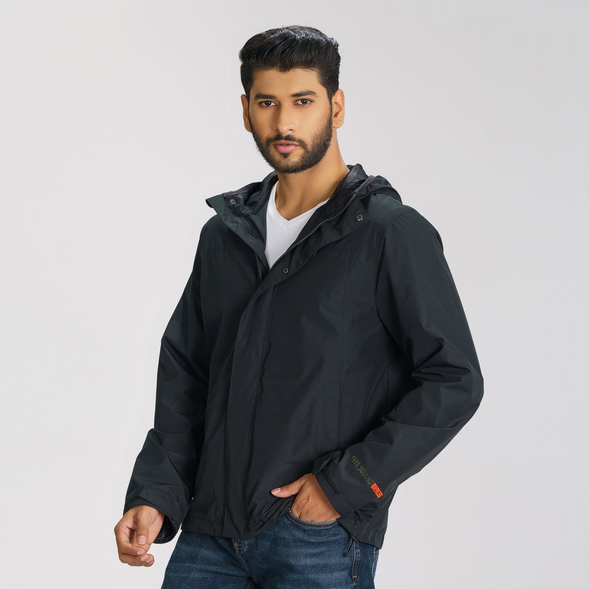 Stay protected in style with this black windbreaker. Featuring a hood, two pockets, and a zip closure, it’s designed for functionality. Enhanced with front cut-and-sew details, chest zipper accents, and subtle embroidery, this jacket combines practicality with modern flair. Crafted from 100% polyester with a straight hemline and lining for comfort.