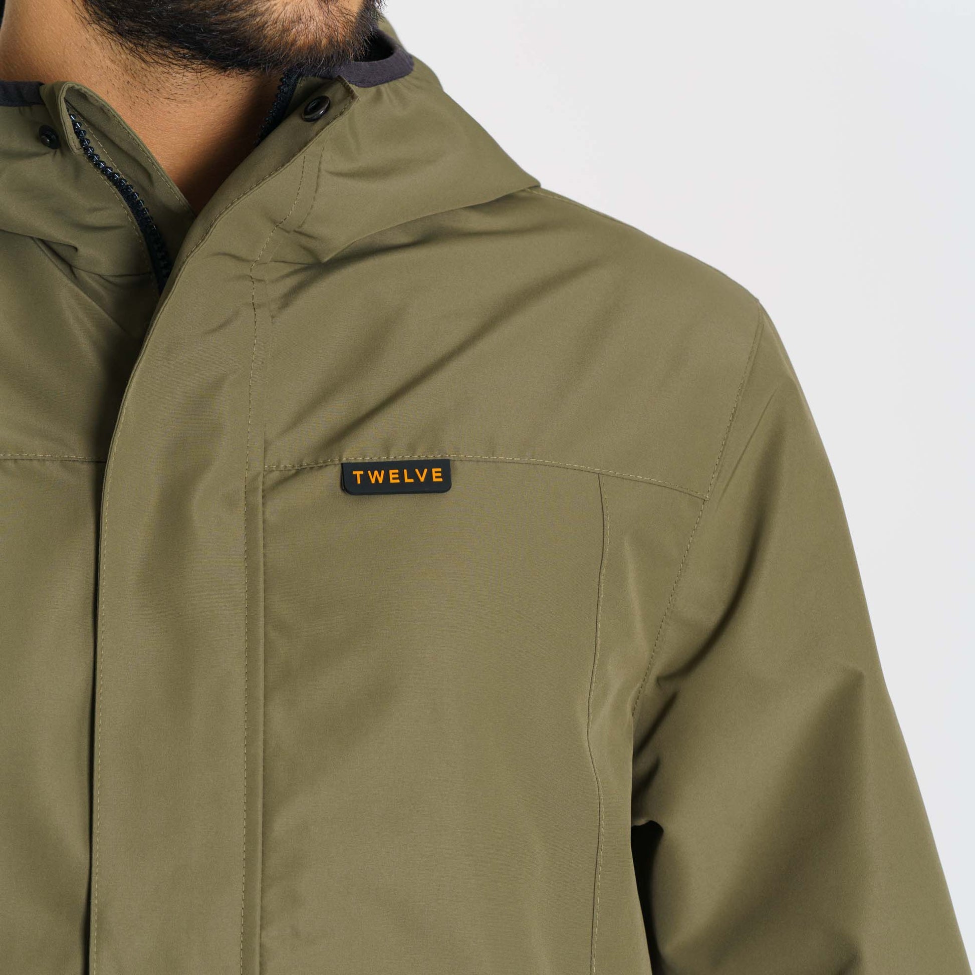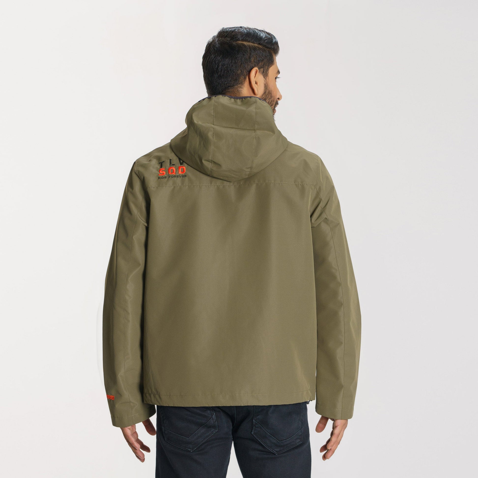 Stay protected in style with this olive windbreaker. Featuring a hood, two pockets, and a zip closure, it’s designed for functionality. Enhanced with front cut-and-sew details, chest zipper accents, and subtle embroidery, this jacket combines practicality with modern flair. Crafted from 100% polyester with a straight hemline and lining for comfort.