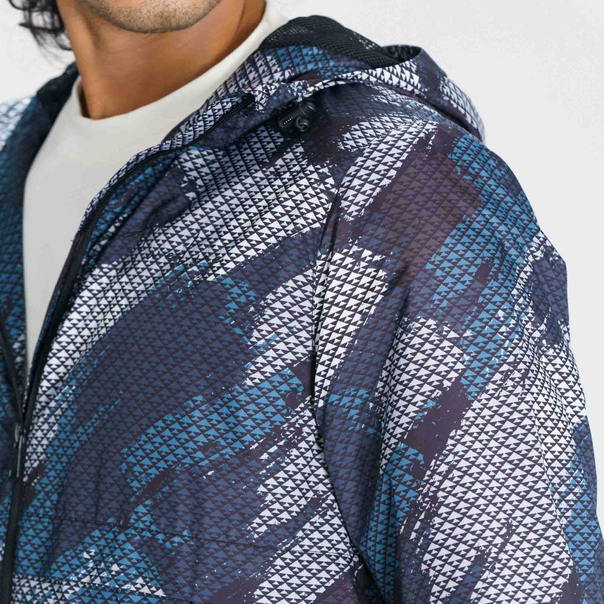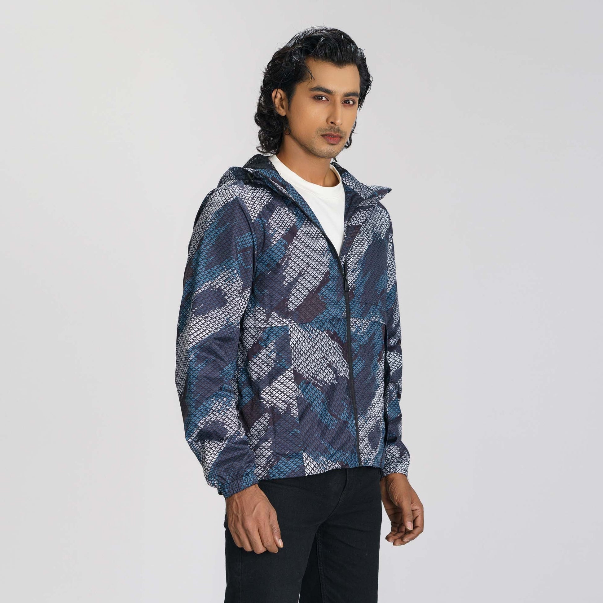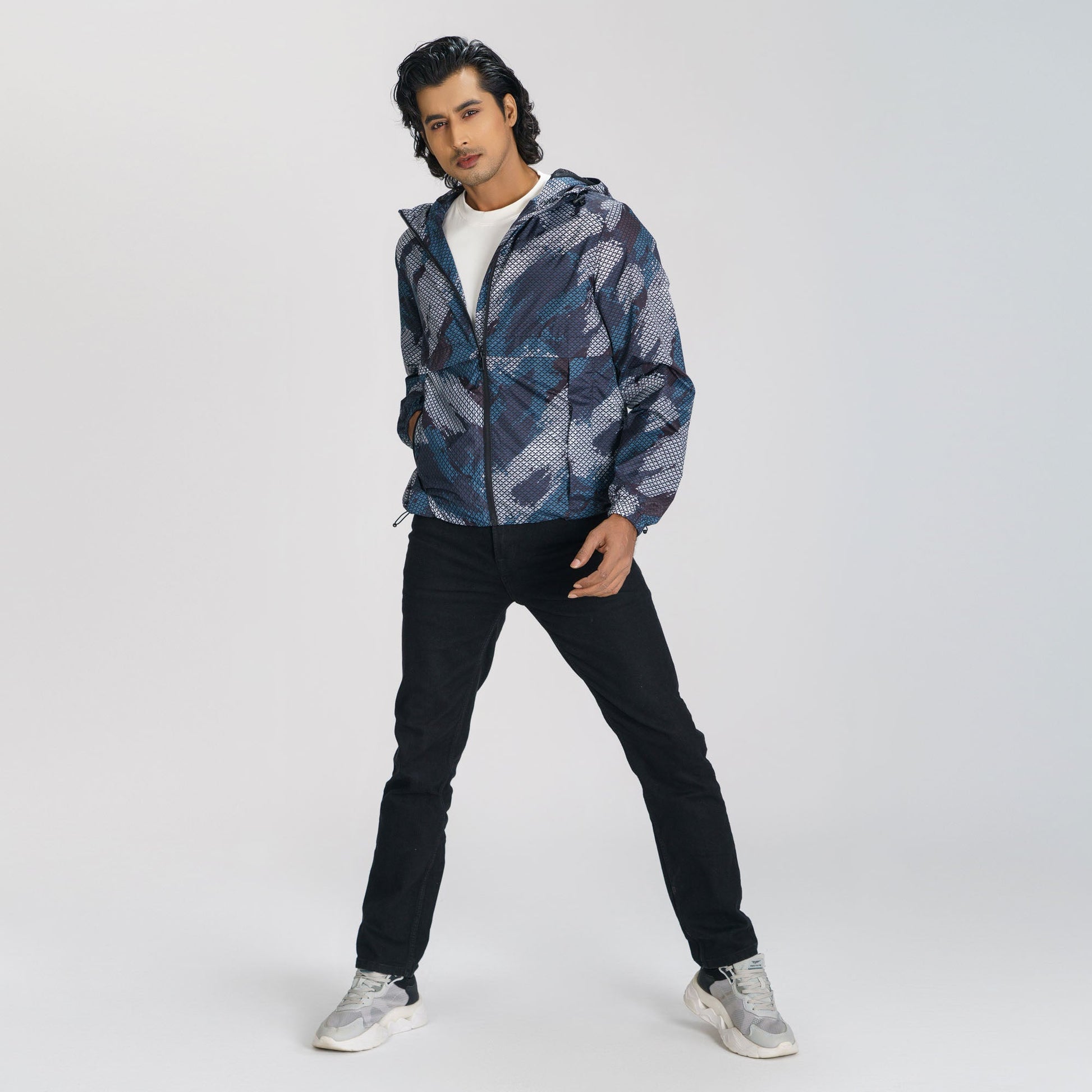 This men’s black windbreaker combines functionality and style with its hood, two pockets, and chest embroidery detailing. Designed with a zip closure and long sleeves, it features a straight hemline and polyester lining. Lightweight and regular fit, it’s ideal for breezy and casual outings.