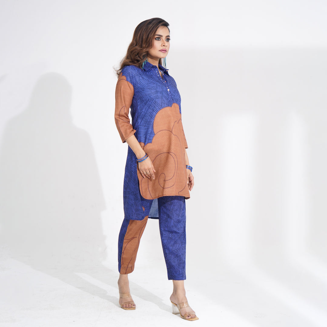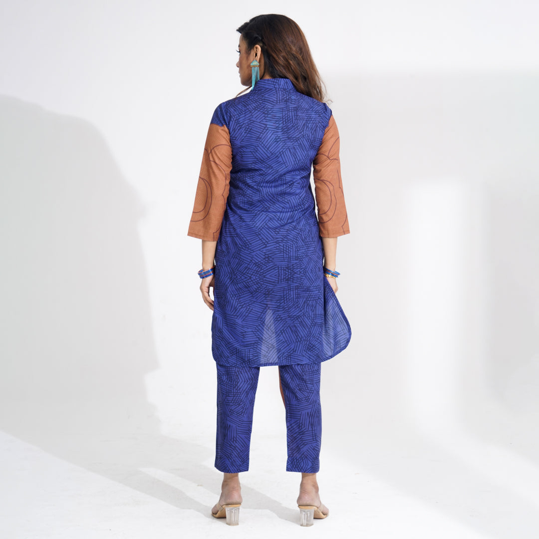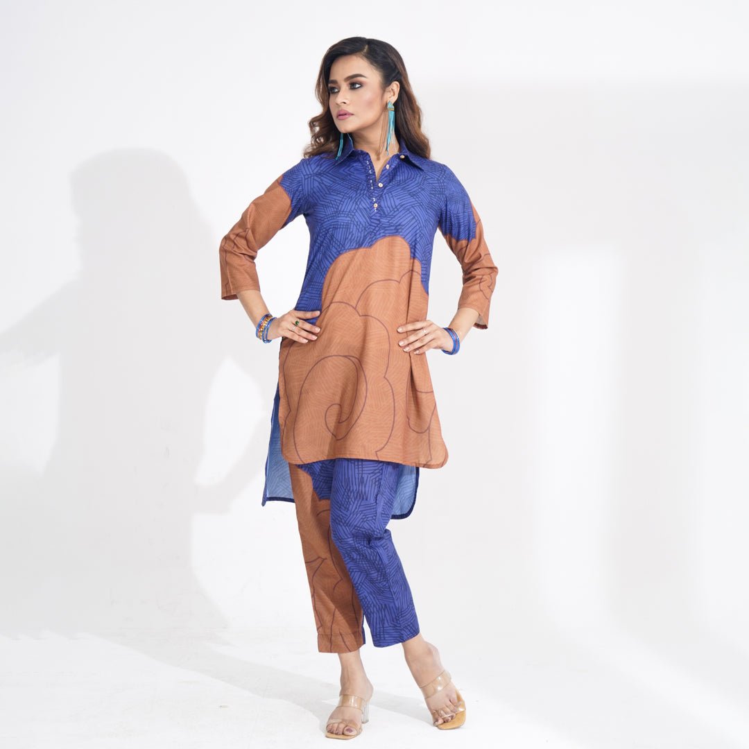 This elegant Navy 2-piece set features a digitally printed top and bottom, enhanced with intricate embroidery on the placket. Crafted from blended cotton, it offers a soft and breathable feel, making it perfect for all-day wear with a touch of sophistication.