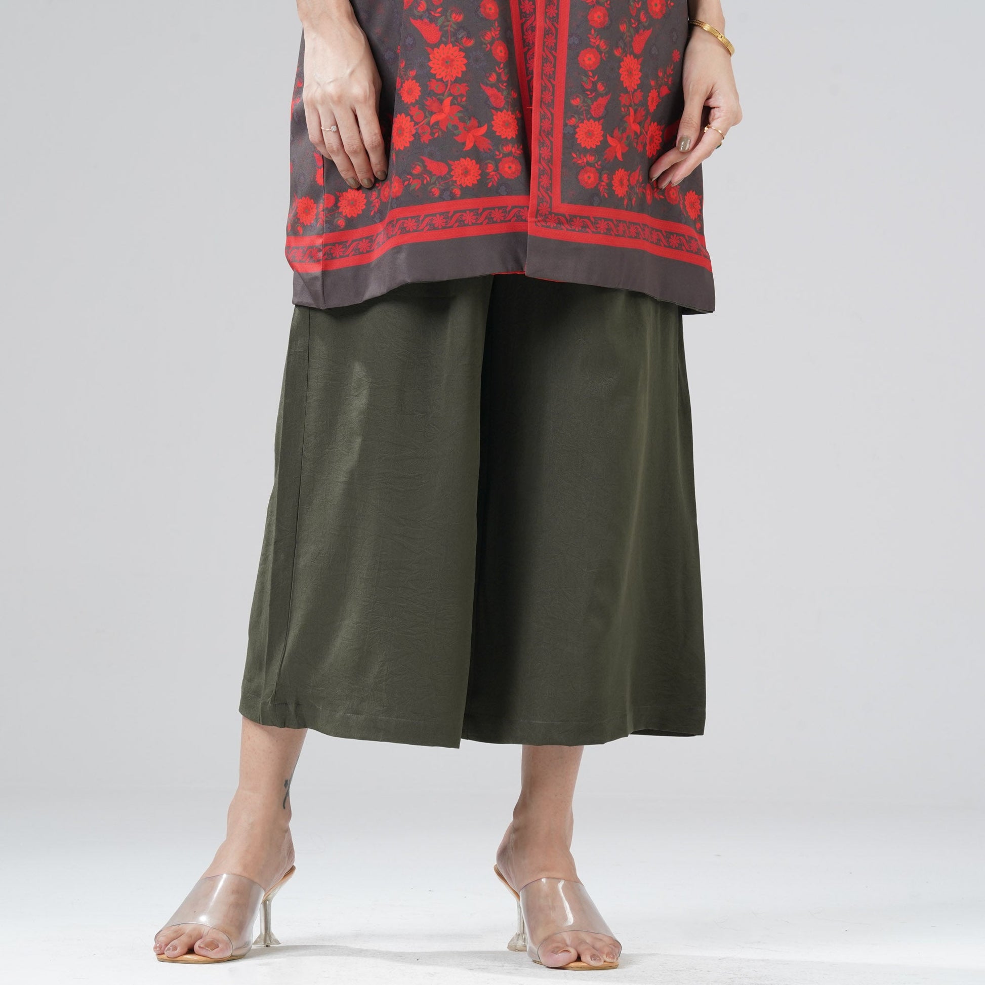 Elevate her festive and formal wardrobe with this womens olive ethnic two piece set crafted from blended silk. It features a sublimation printed long-sleeve jacket with a lapel collar, paired with a solid-colored full-sleeve jumpsuit. Designed in a regular fit, this elegant ensemble offers comfort and a modern, polished look perfect for work, evenings, or special occasions.