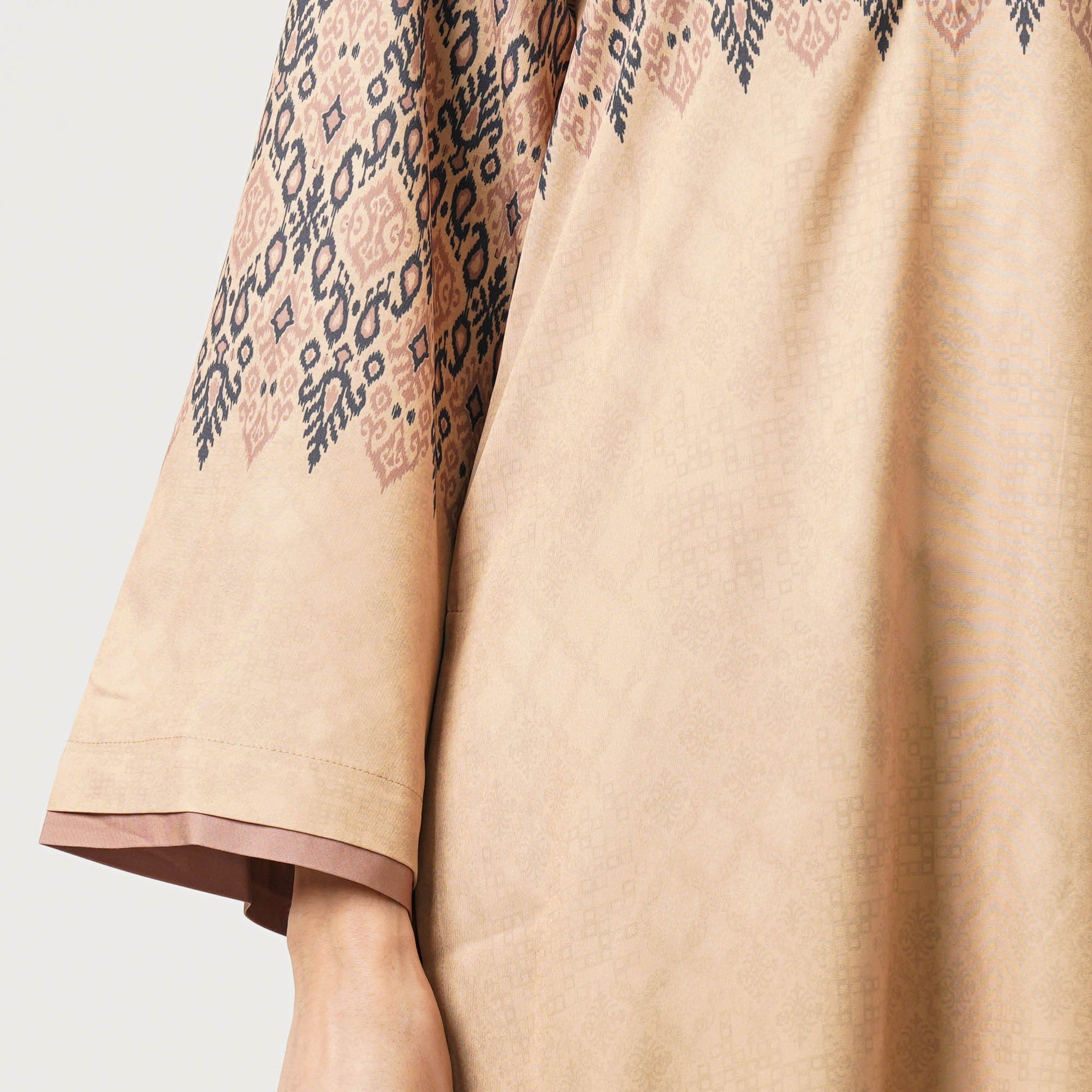 This printed two piece set features an ikkat-inspired design that softly transitions from the upper body to a tonal textured base. Crafted from lightweight blended silk, it is styled with a mandarin collar and deep V-placket accented by metallic gold stud detailing. Finished with contrast binding on the collar, placket, and sleeve cuffs, it delivers a refined boho-chic look for casual and festive wear.