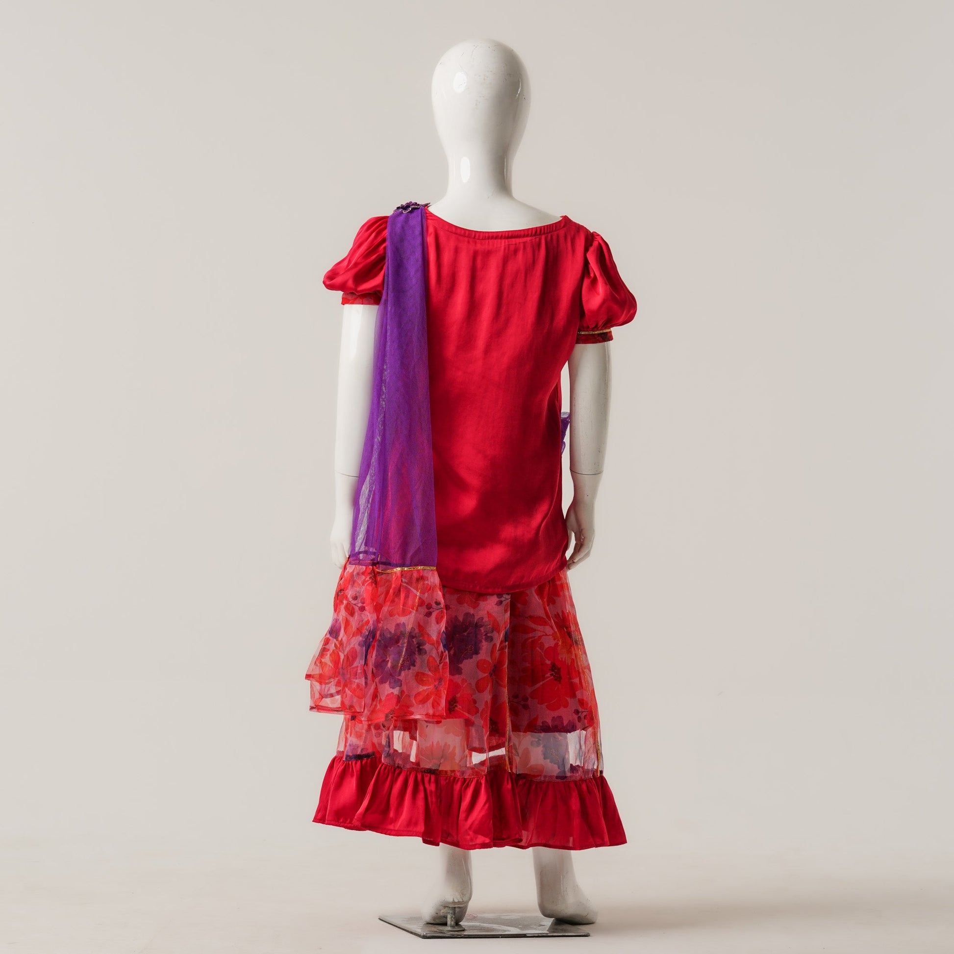 A festive three piece set ensemble crafted from silk, organza, and mesh. Features an elegant panel skirt with ruffles, floral patch detailing, and an attached dupatta for a graceful look perfect for any celebrations and special occasions.