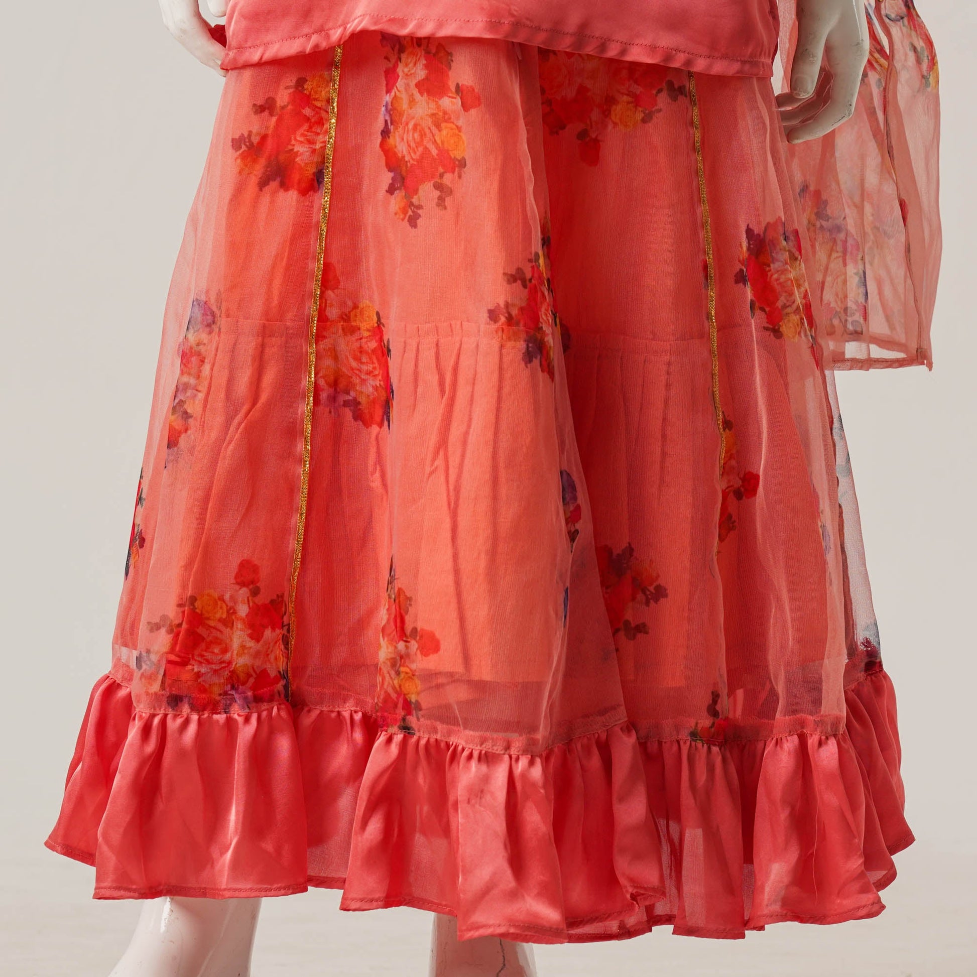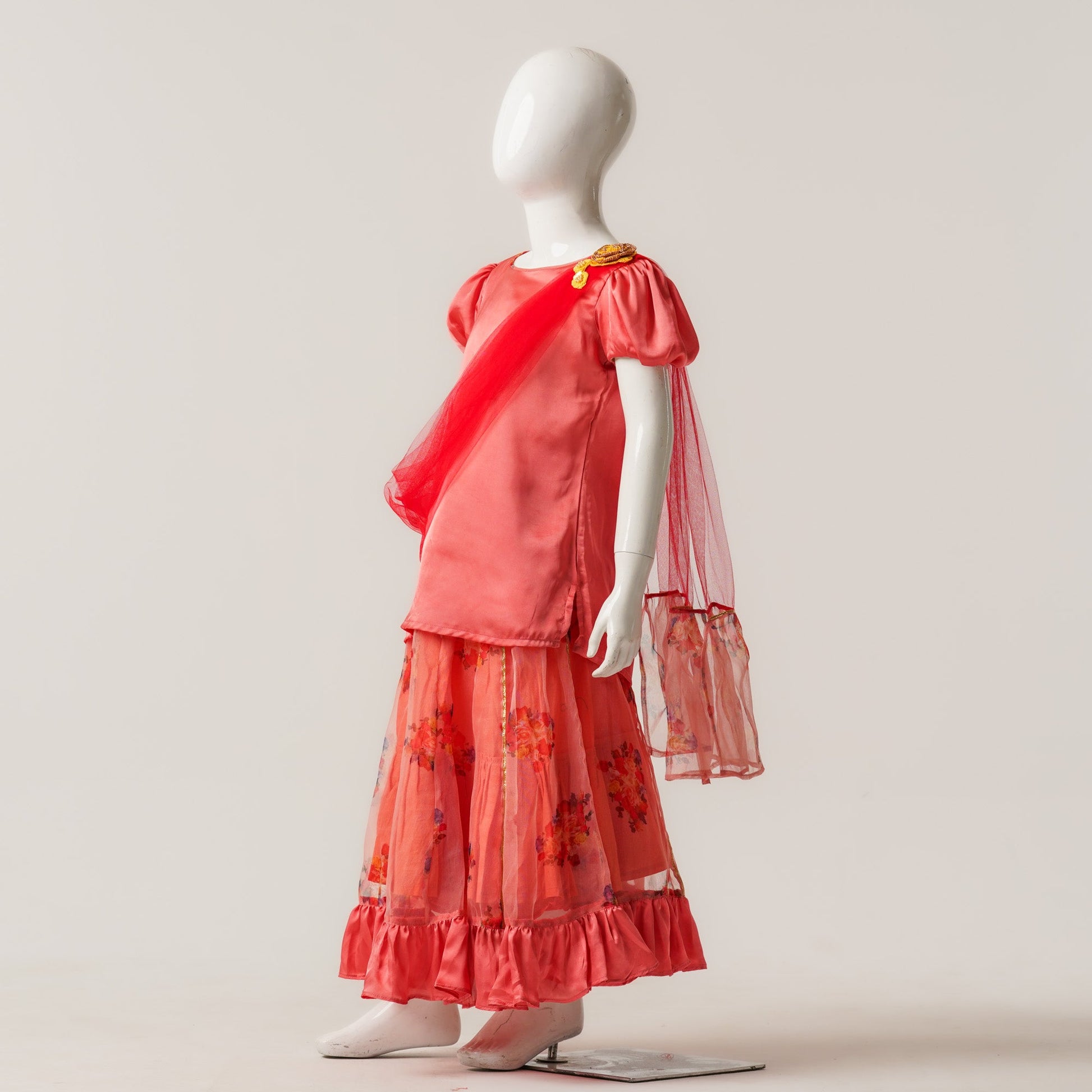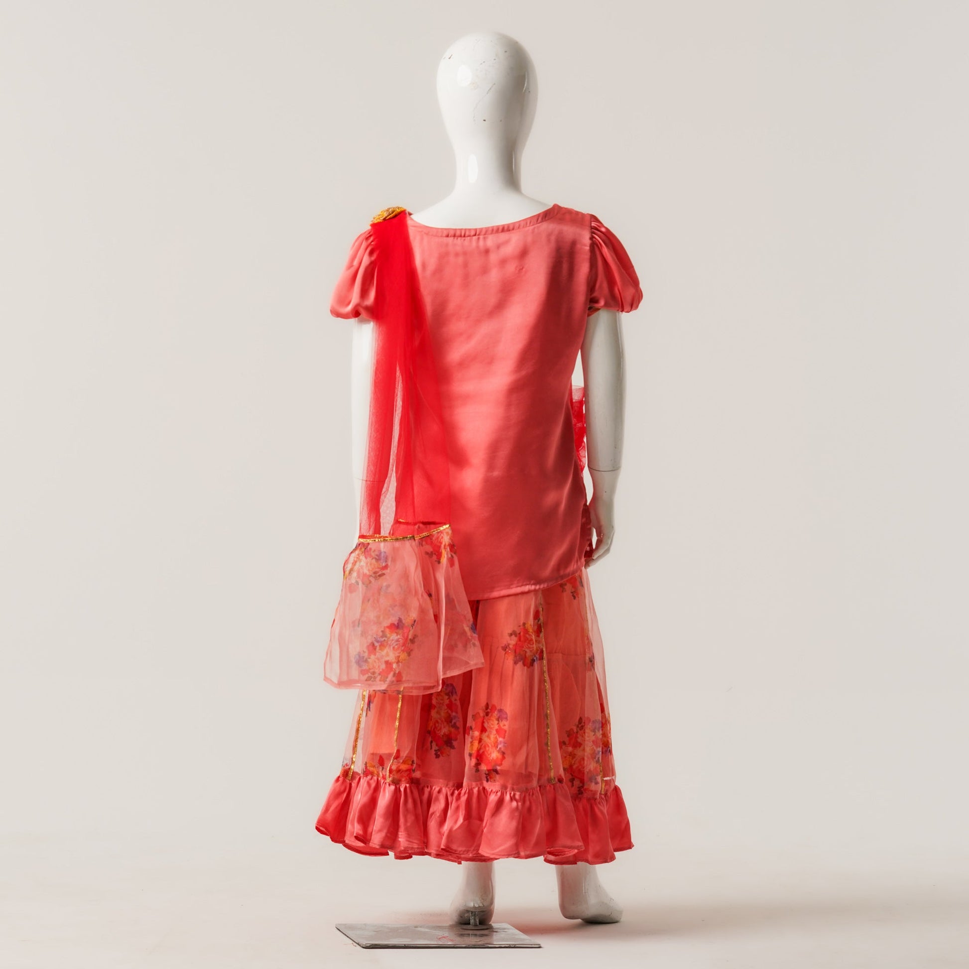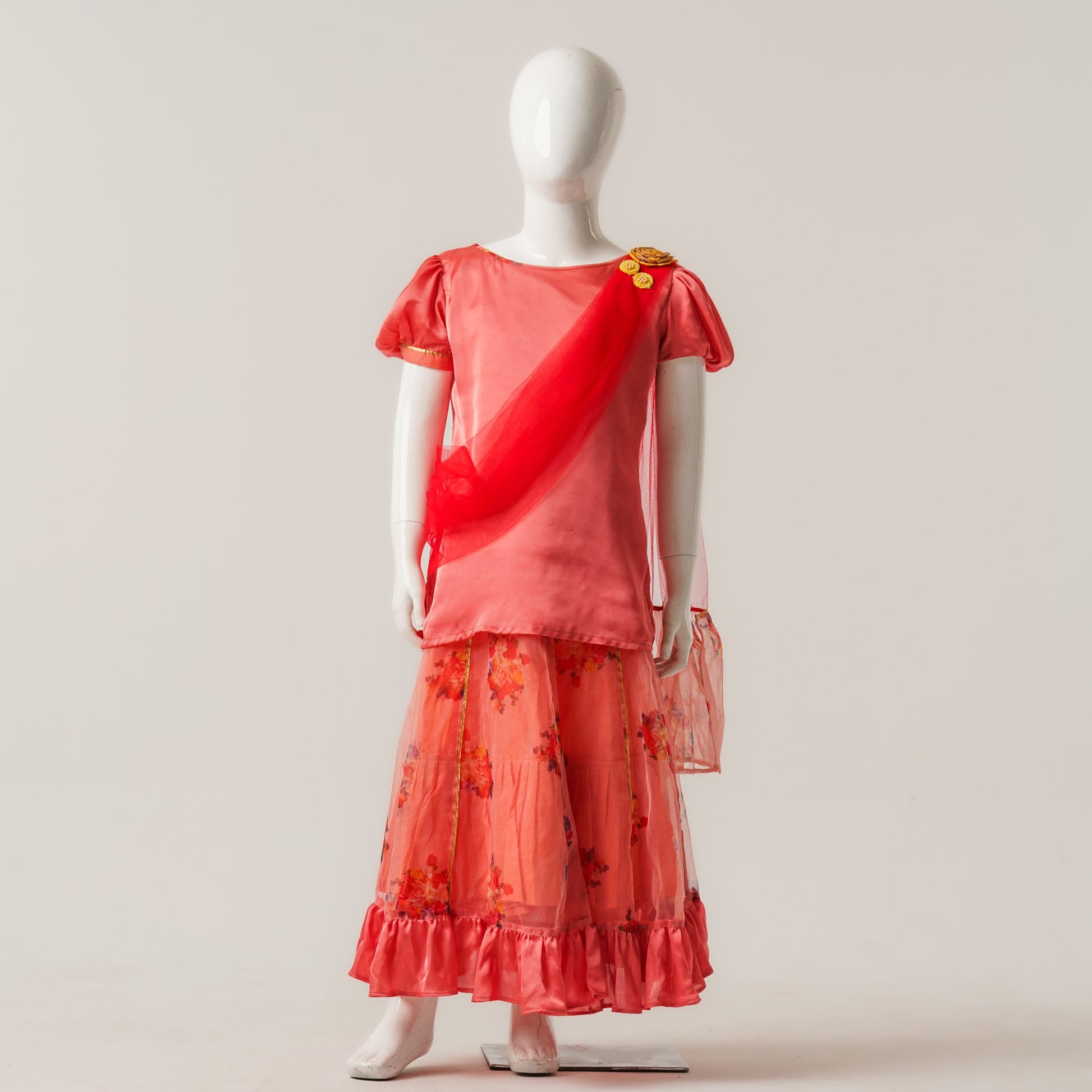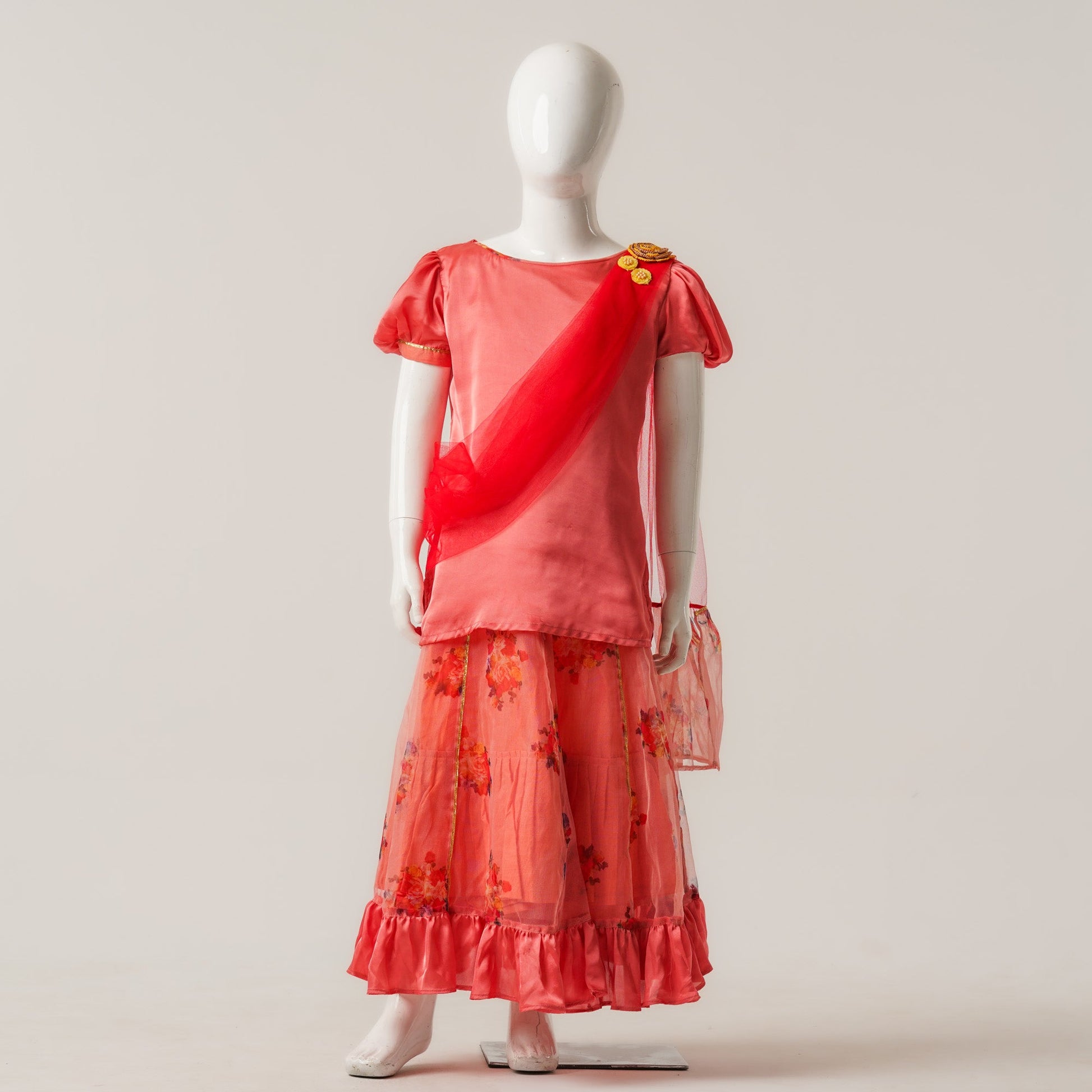 A festive three piece set ensemble crafted from silk, organza, and mesh. Features an elegant panel skirt with ruffles, floral patch detailing, and an attached dupatta for a graceful look perfect for Eid celebrations and special occasions.