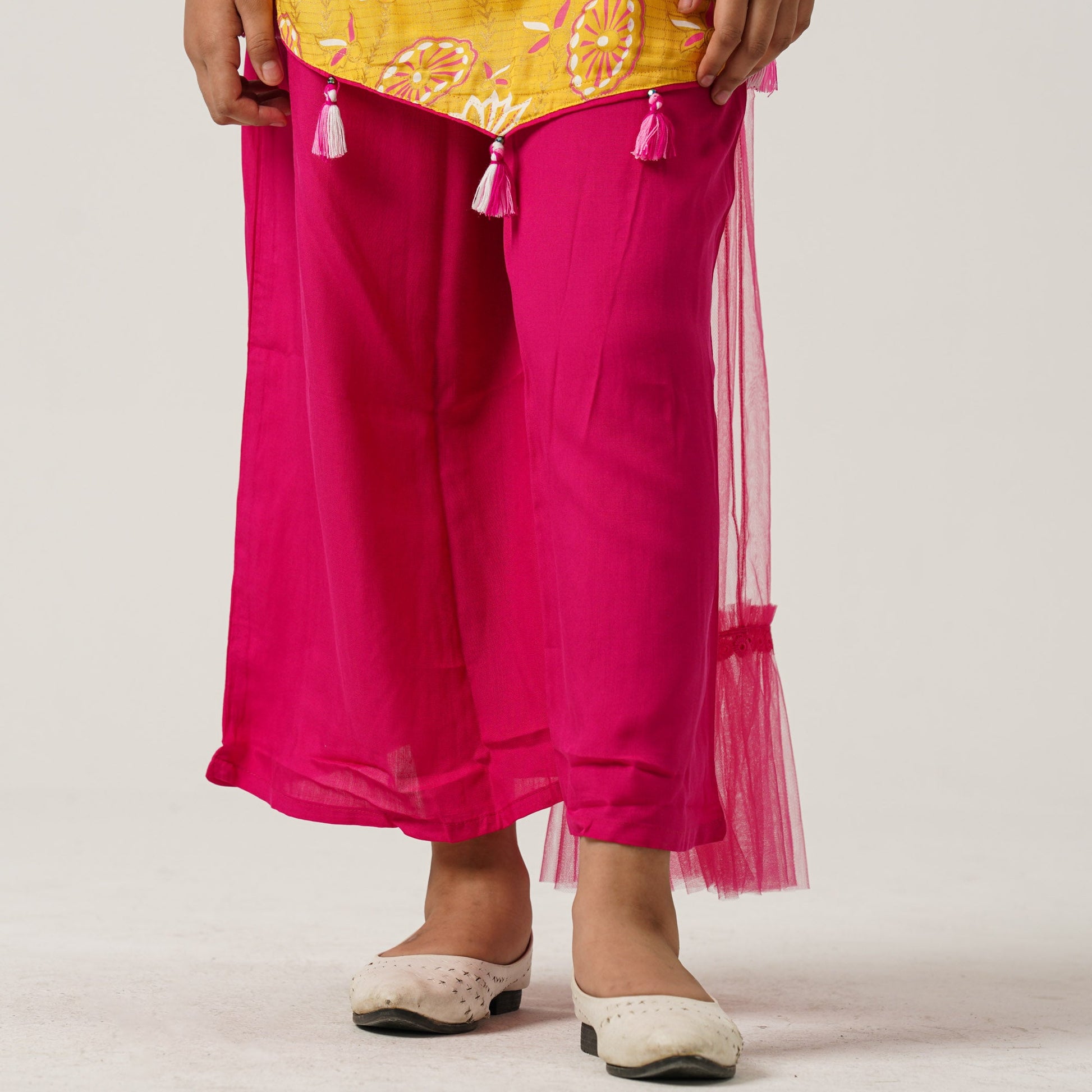 This elegant three piece set for girls is crafted from breathable linen and features screen print with intricate hand embroidery, enhanced with delicate tassel details. Paired with a soft mesh dupatta and flared bottom, it’s perfect for festive occasions and special events.