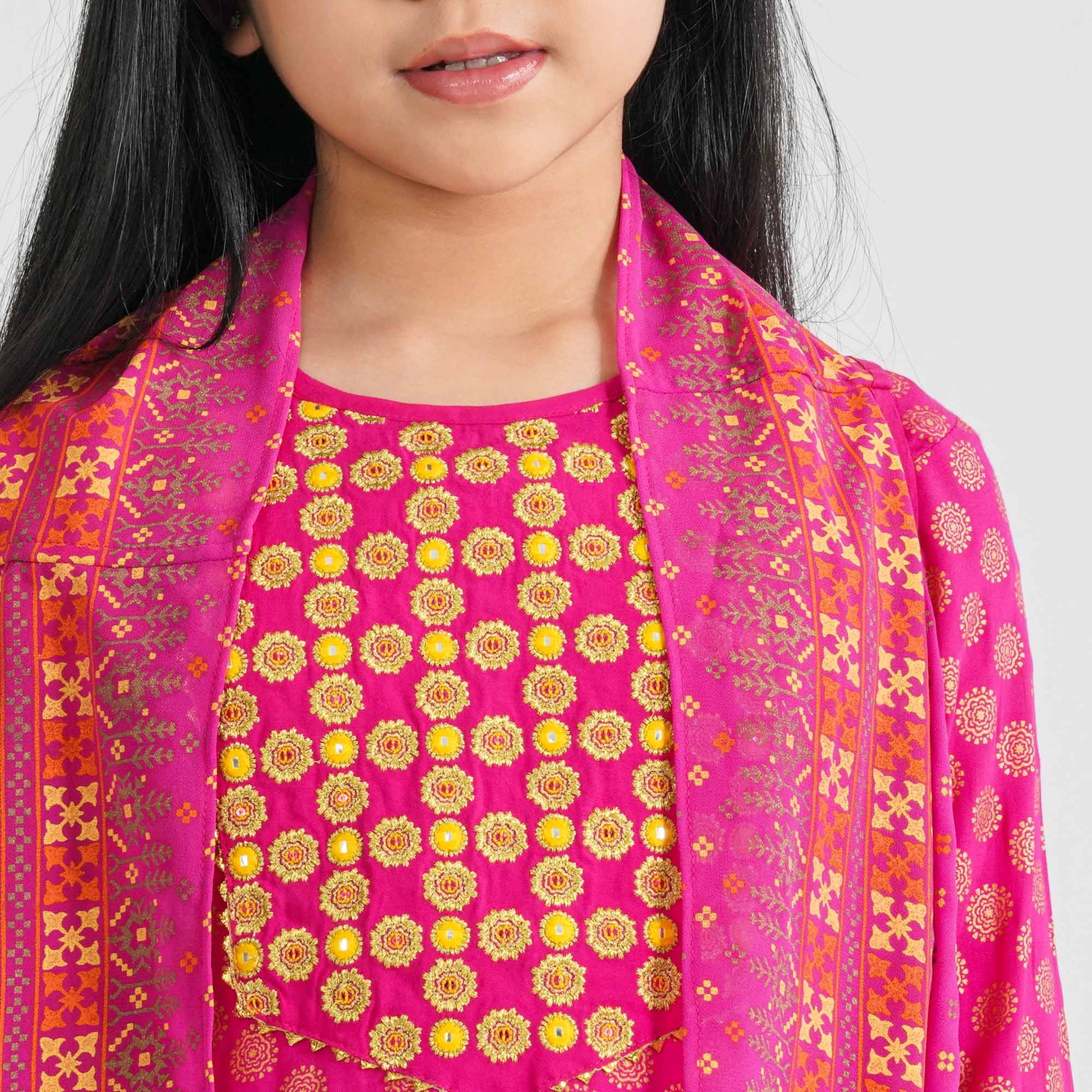 Crafted from soft viscose fabric for the top and dhoti bottom, paired with a lightweight georgette shrug, this girl’s pink three piece ethnic set offers comfort with festive elegance. The straight-cut top is enhanced with beautiful screen print, embroidery, and tassel detailing for added charm. The coordinated shrug adds a stylish layered look, while the dhoti bottom completes the traditional silhouette. Perfect for festive occasions, cultural events, and family celebrations.