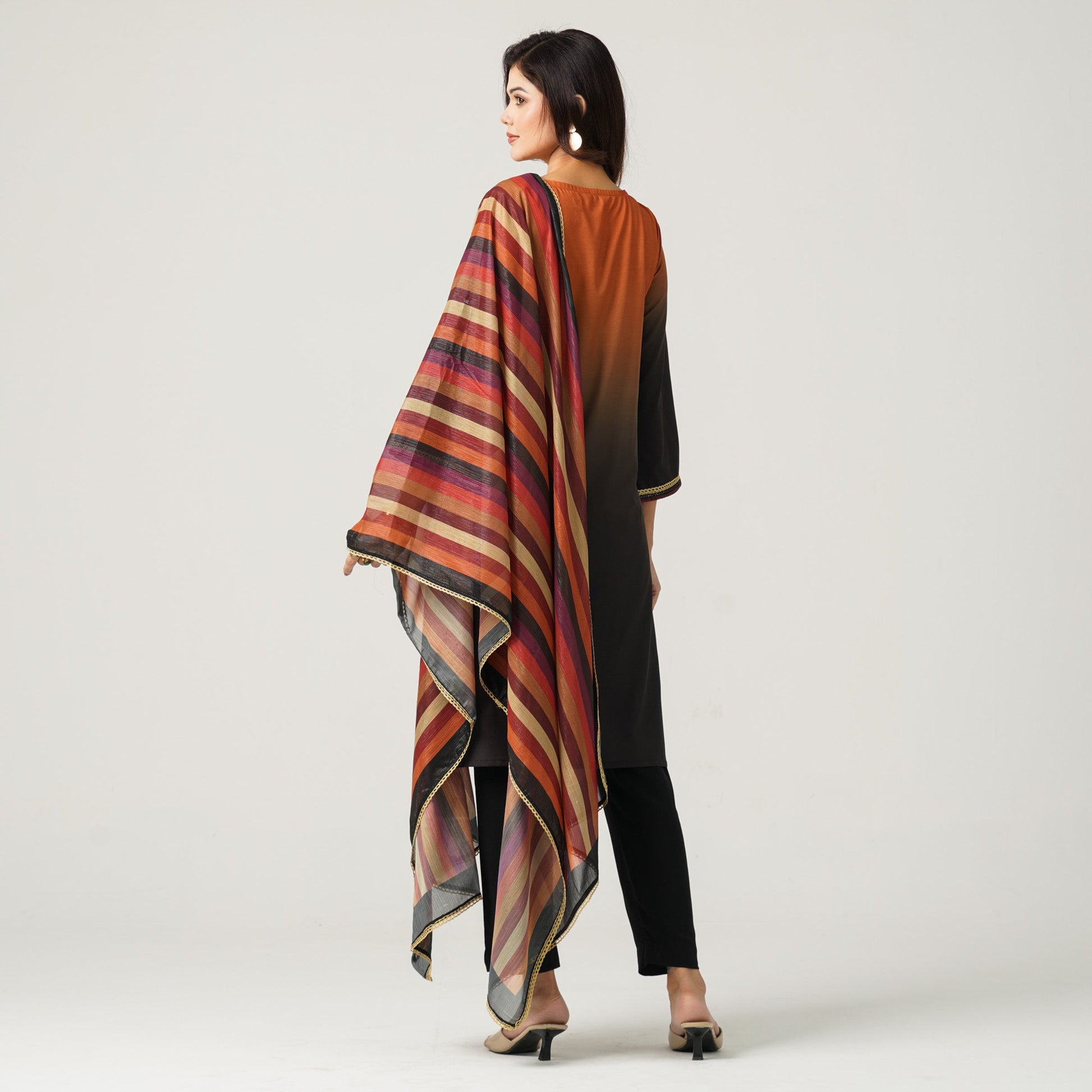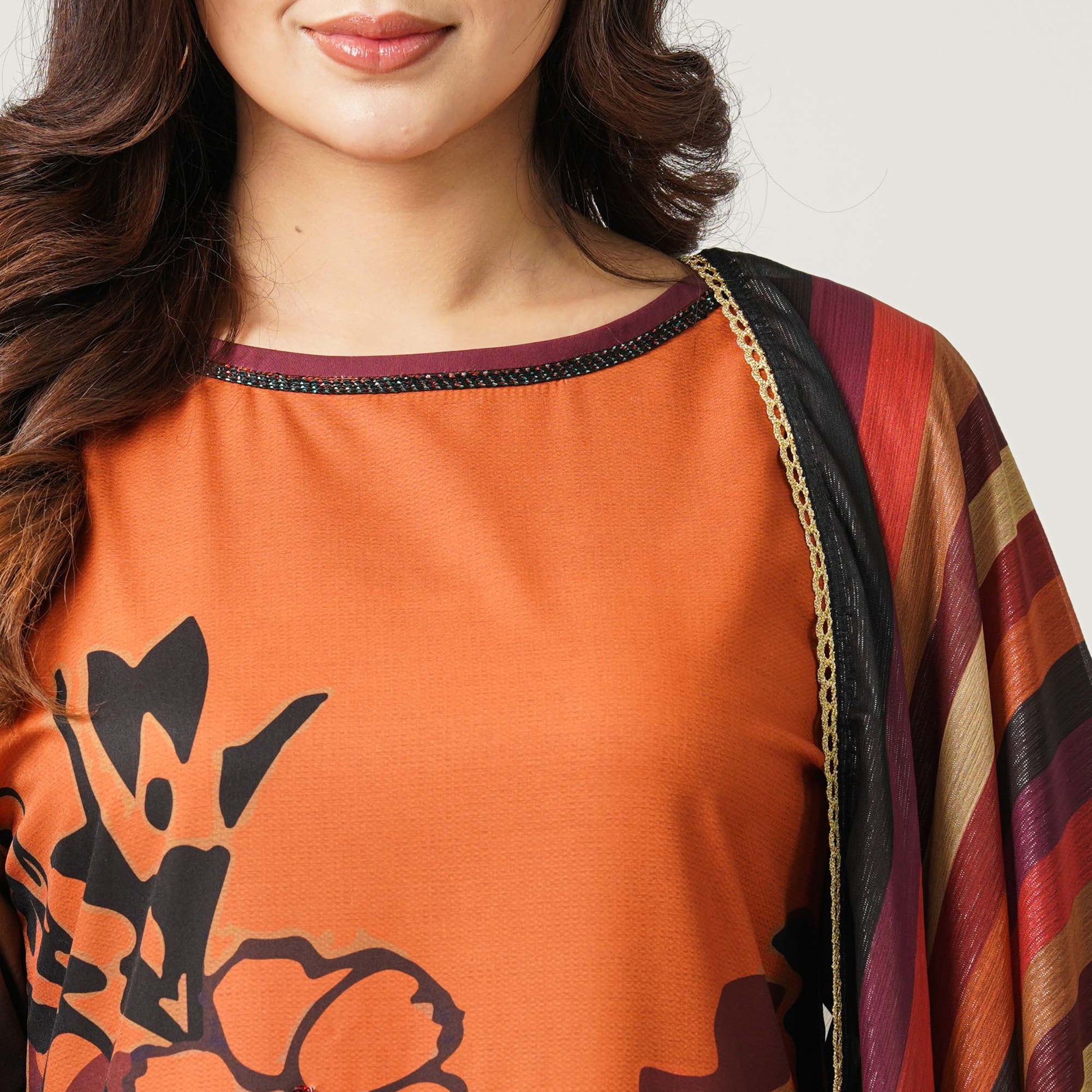 Elegant women’s black three-piece set crafted from soft blended silk for a lightweight and breathable feel. The straight-cut top features vibrant floral sublimation prints in orange and maroon tones on a rich black base, enhanced with a subtle gradient sleeve effect and delicate sequin work. Lace detailing adorns the neckline, sleeve openings, and the printed dupatta border. Paired with a comfortable viscose pant, this outfit is perfect for festive occasions, family gatherings, evening events, and stylish casual wear.