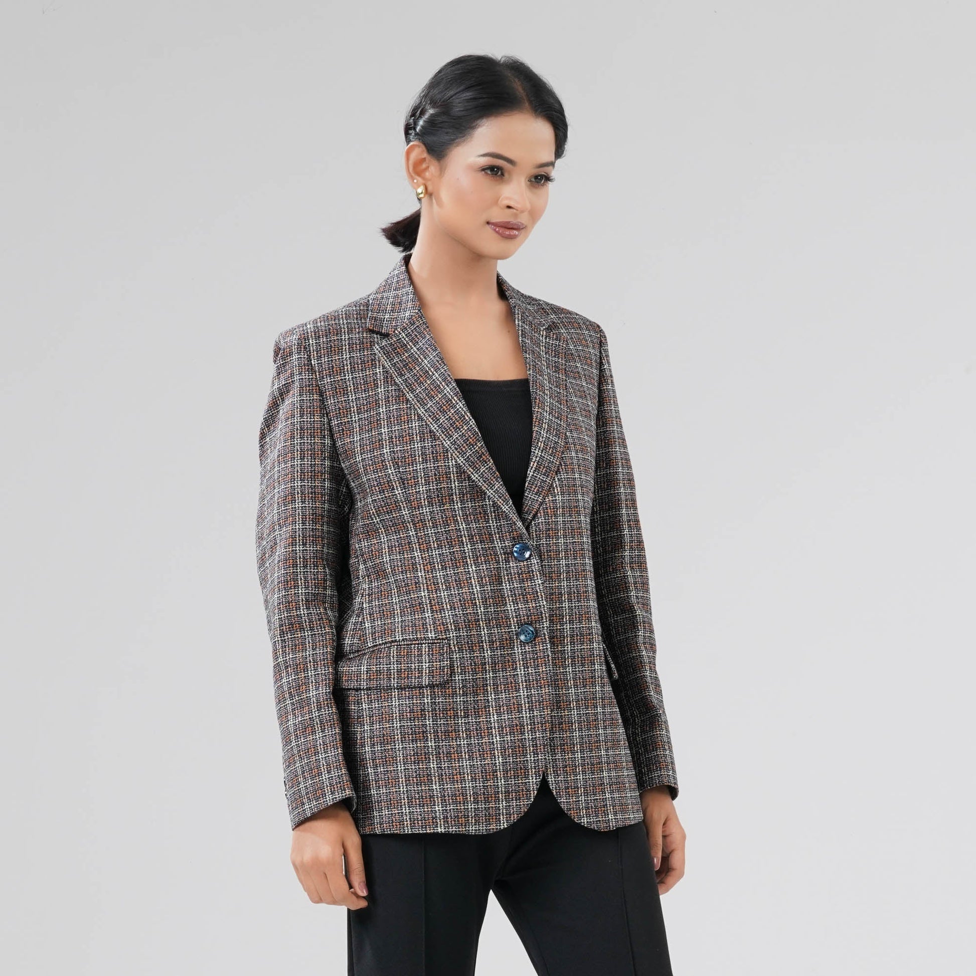 This womens navy check tweed blazer adds timeless elegance to any outfit. It features classic notched lapels, a single button closure at the waist, and two flap pockets for a refined finish. Crafted from premium tweed fabric in a slim fit, it’s perfect for both formal and smart-casual occasions.