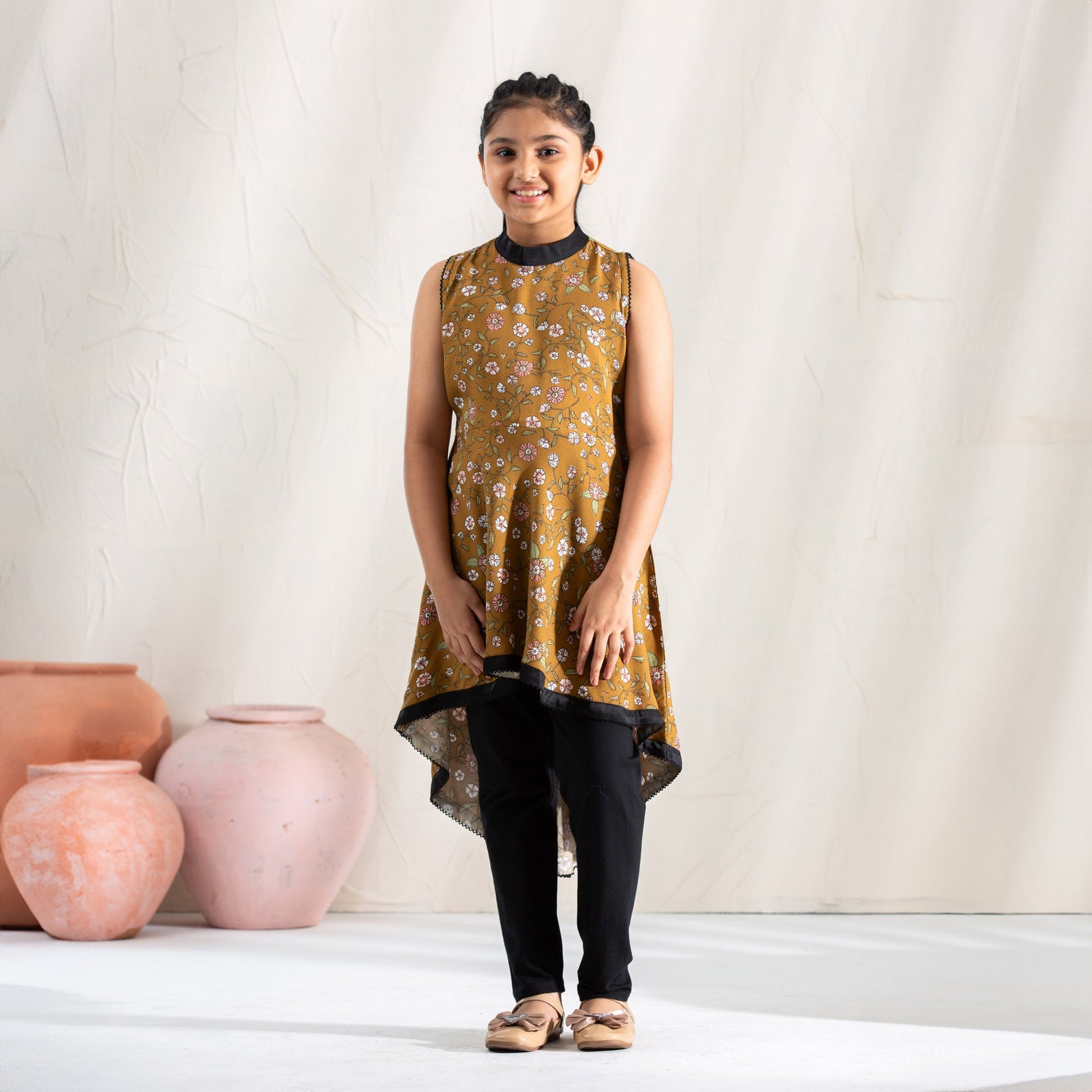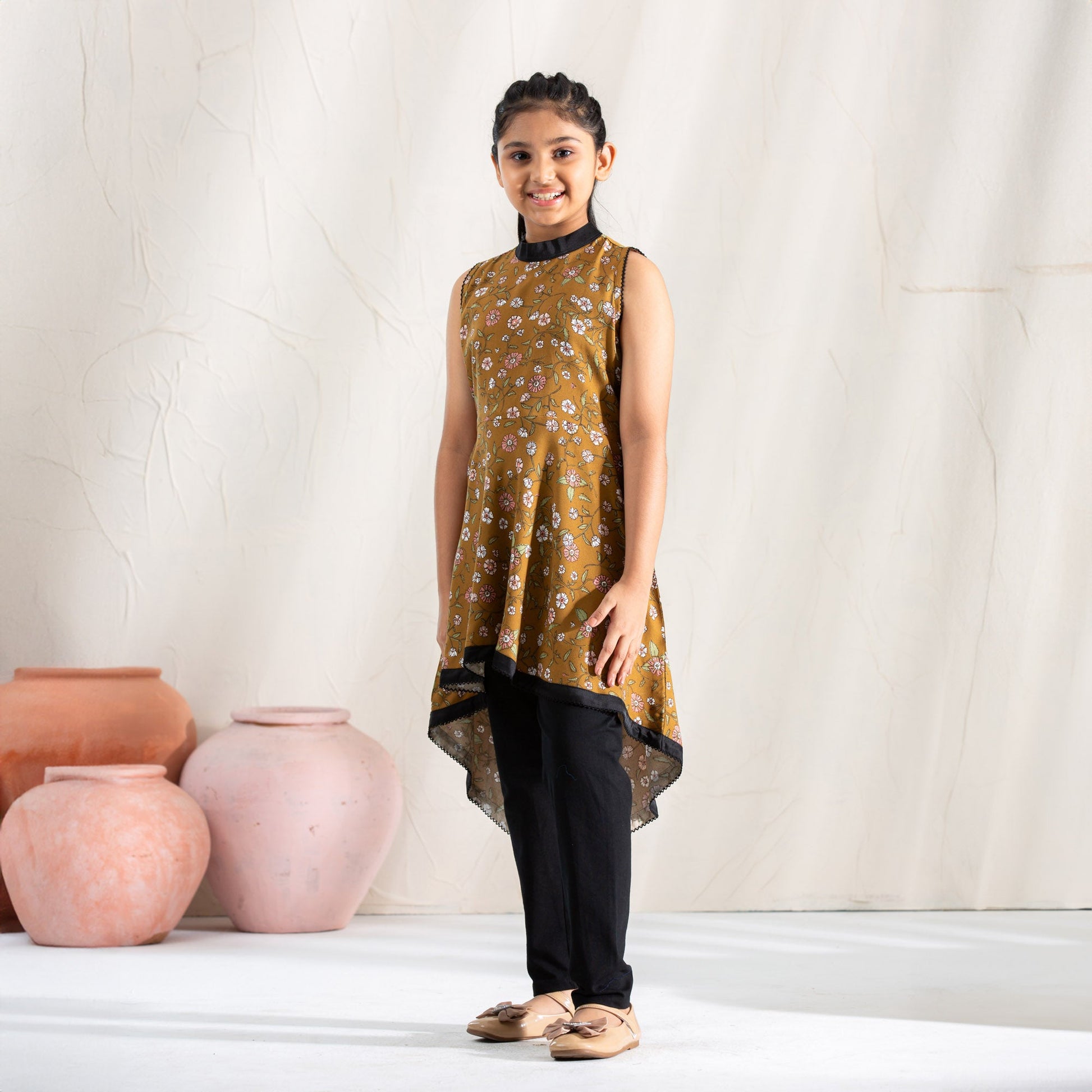 Elevate your little girl's style with our Olive Print Frock. Adorned with contrasting fabric and a delicate patch flower, this high-low cut frock exudes sophistication. Made of luxurious linen, it's perfect for any special occasion.