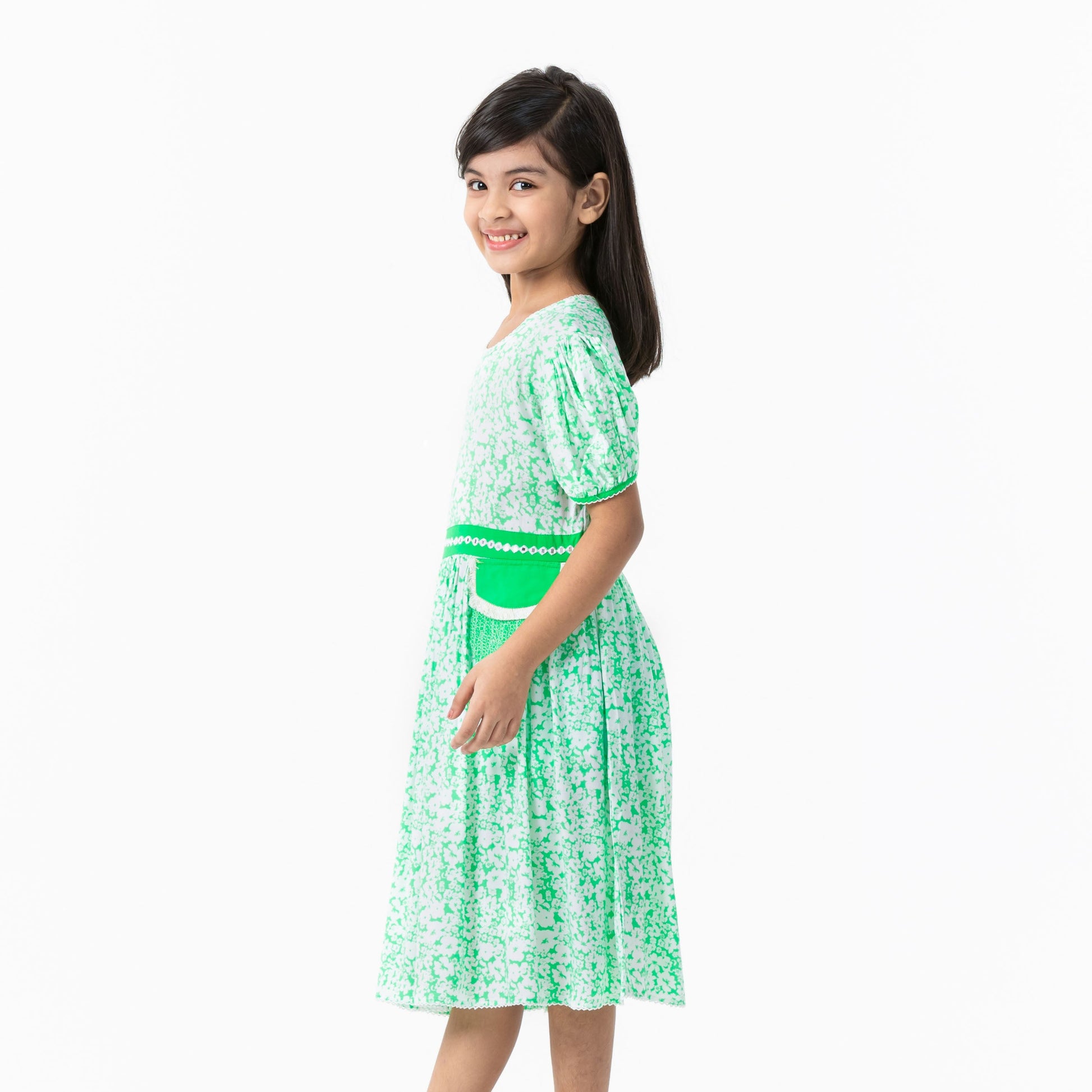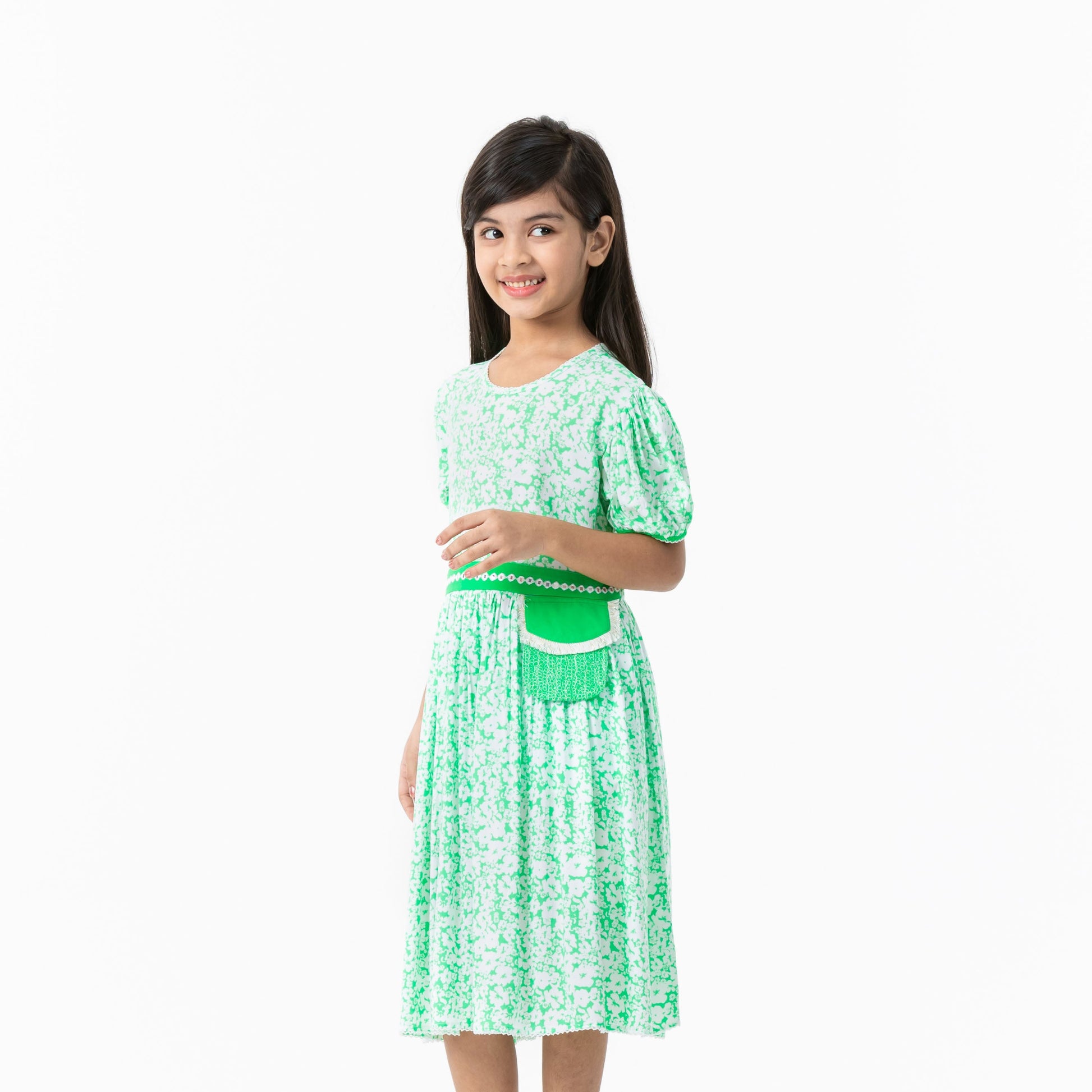 This multicolor girls frock features a vibrant floral print, detailed with delicate embroidery lace for added charm. A cute patch pocket enhances the playful design, making it both stylish and practical. Perfect for casual outings or special occasions, this frock combines comfort and elegance.