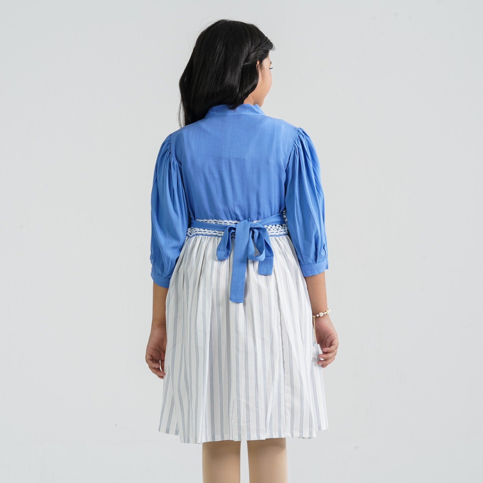 Crafted from soft and breathable cotton fabric, this girl’s sky blue frock ensures comfortable all-day wear. Designed with an elegant shawl neckline and delicate white lace detailing at the waistline, it offers a charming ethnic touch. The mid-length puff sleeves with cuffs and flared midi silhouette create a graceful and playful look. Perfect for festive occasions, family gatherings, and special celebrations.