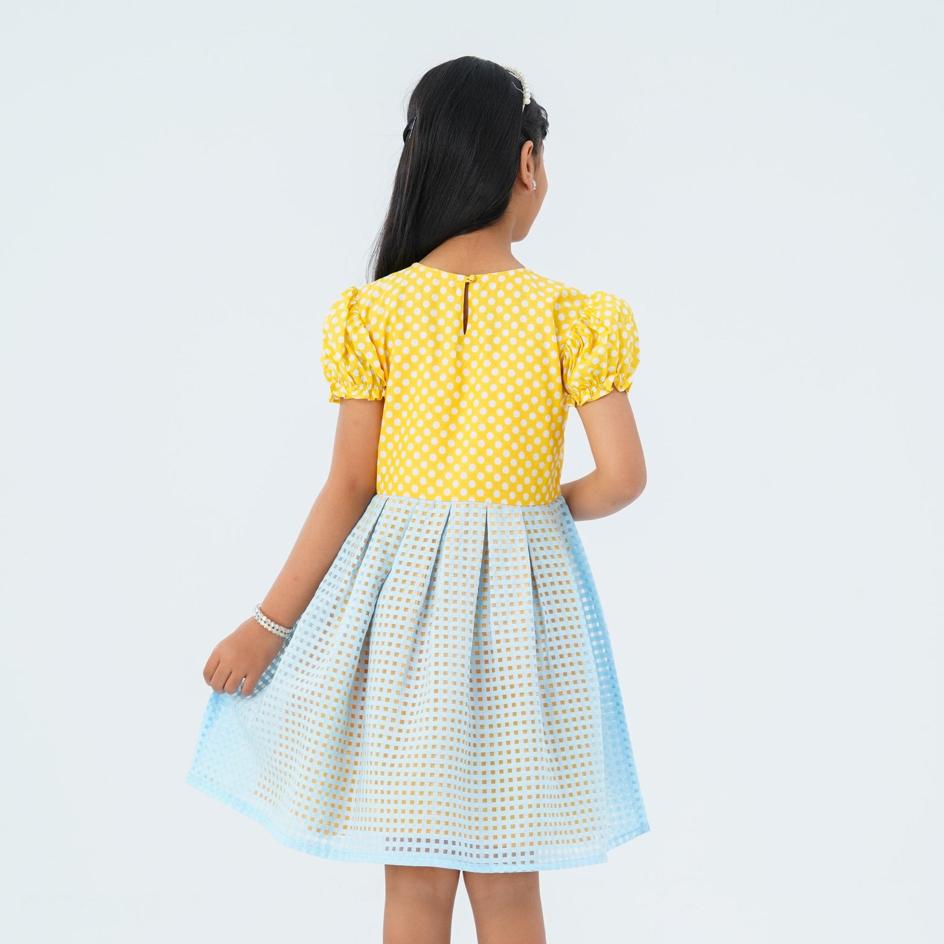 This girl’s yellow frock is designed in a stylish empire line silhouette for a comfortable and graceful fit. Crafted from soft mixed cotton fabric that ensures breathability and all-day comfort. The outfit is enhanced with a cute flower patch detail for added charm. Perfect for casual outings, parties, and everyday wear.