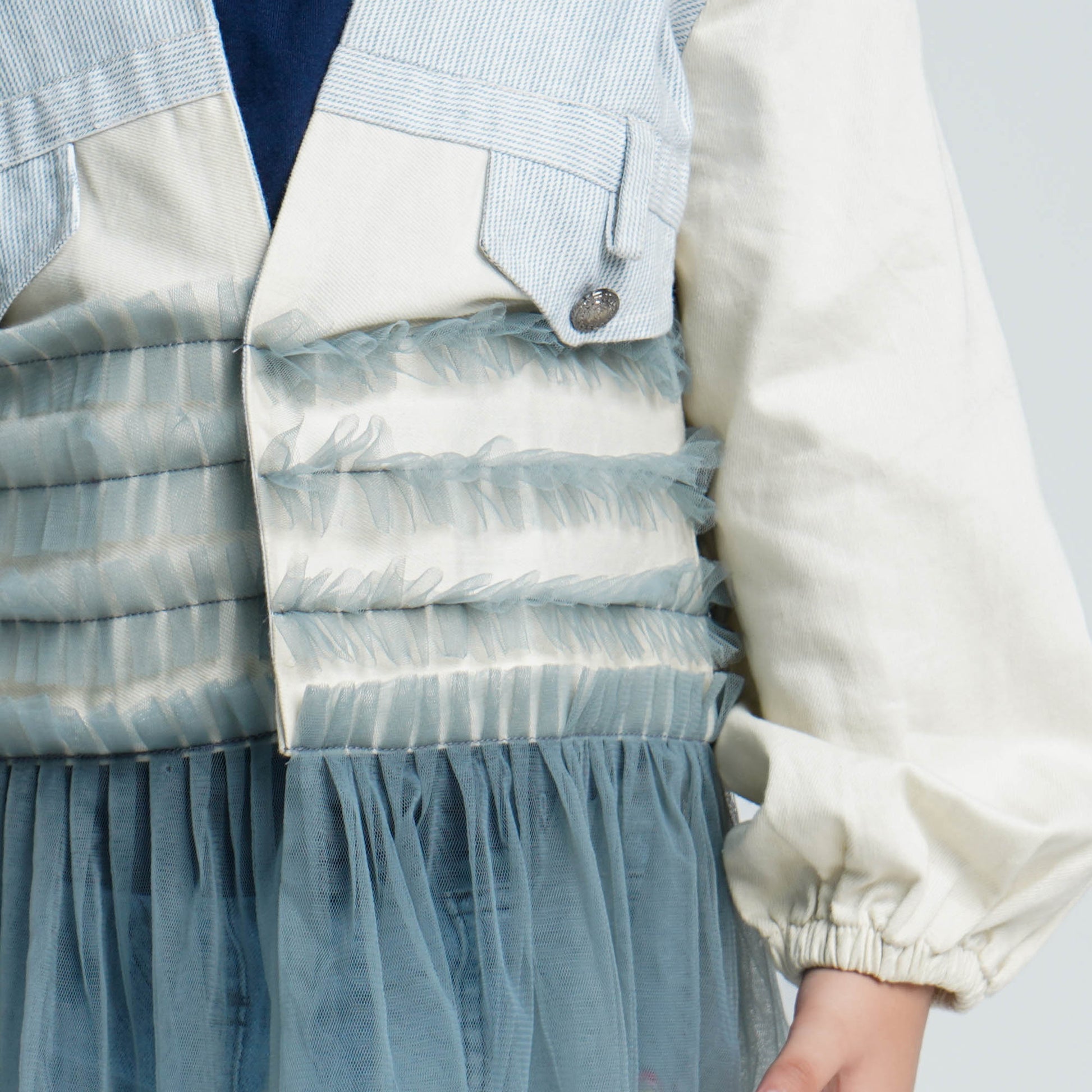 Add a touch of elegance to her wardrobe with this white girls' jacket, crafted with metal buttons and soft net fabric. The design features denim fabric on the top and a tiered net bottom for a stylish, textured look. Finished with front flap pockets, this woven jacket offers a comfortable regular fit—perfect for parties, outings, and special occasions.