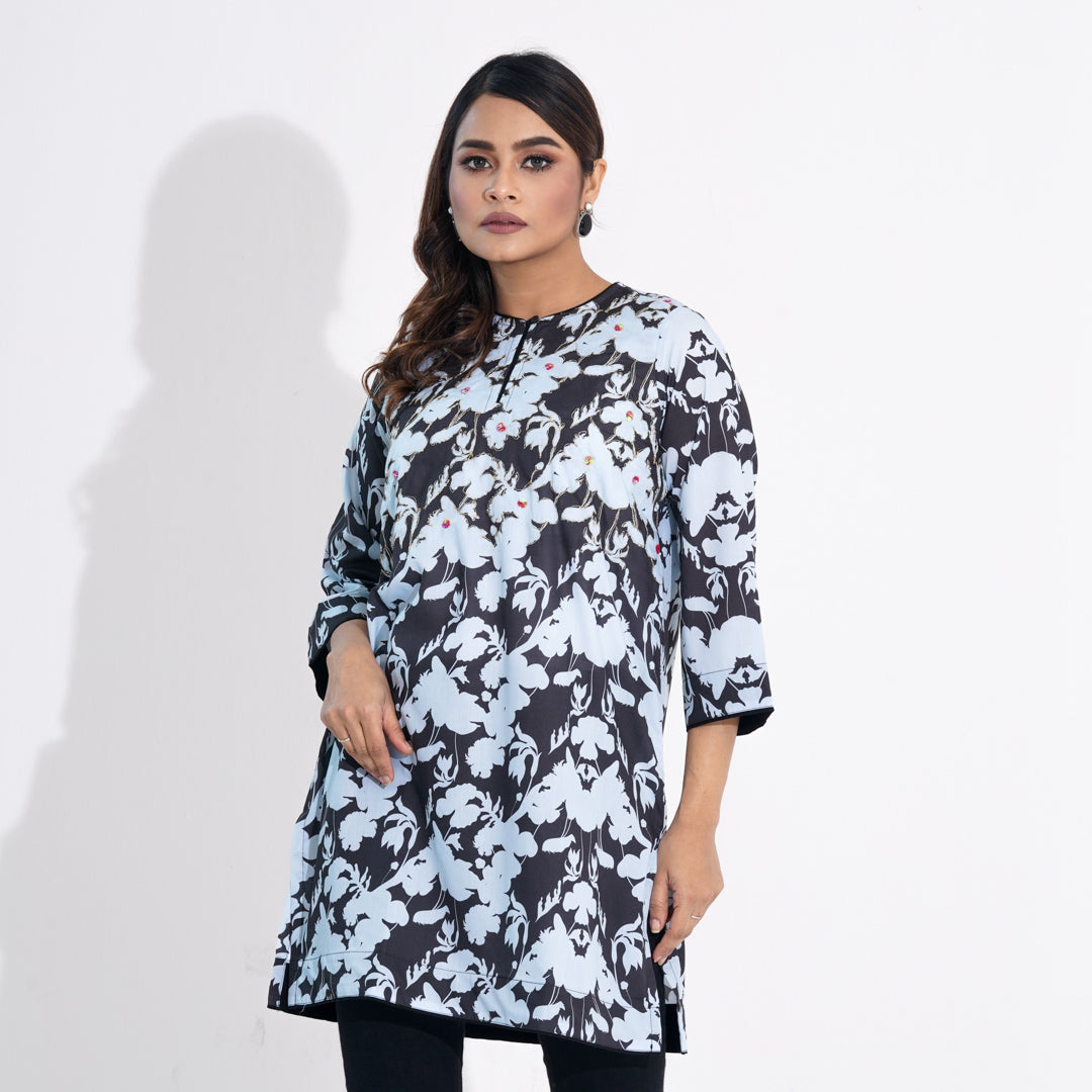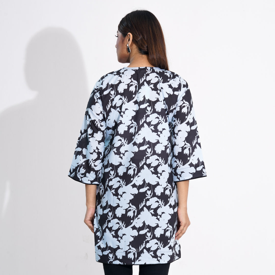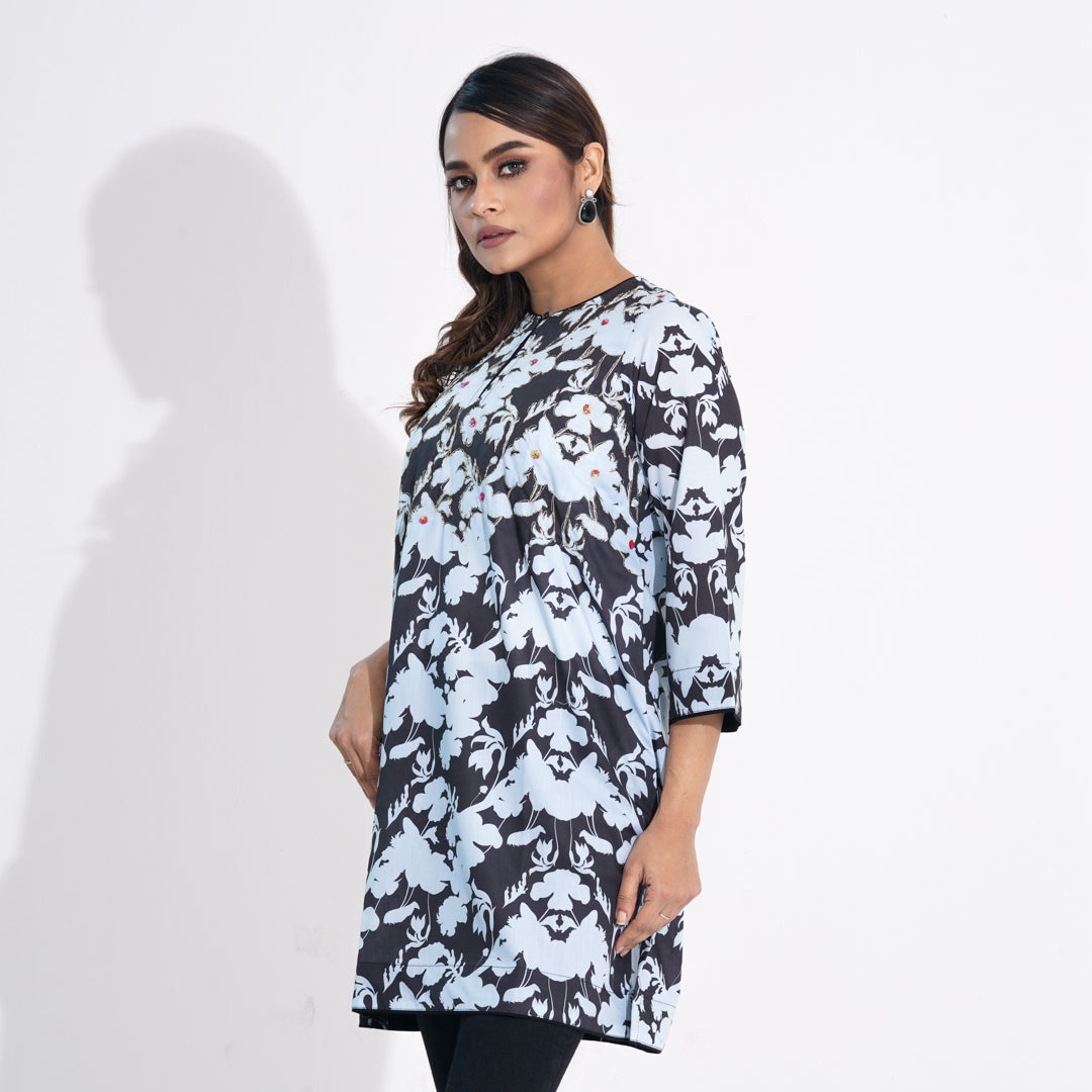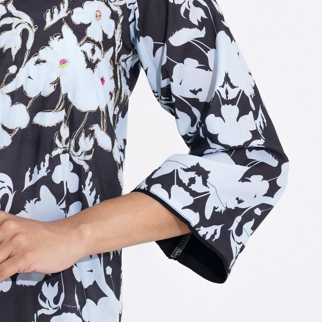 This black ethnic kurti blends traditional and contemporary design elements. Featuring a digital print on the top, with solid contrast details and embellished with cord and sequin work, it adds a touch of elegance. Made from a blended cotton fabric, it offers a comfortable and regular fit, making it perfect for festive or casual occasions.