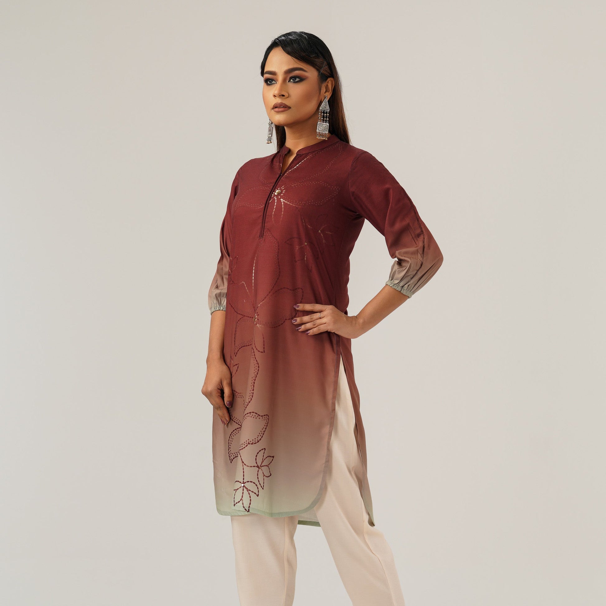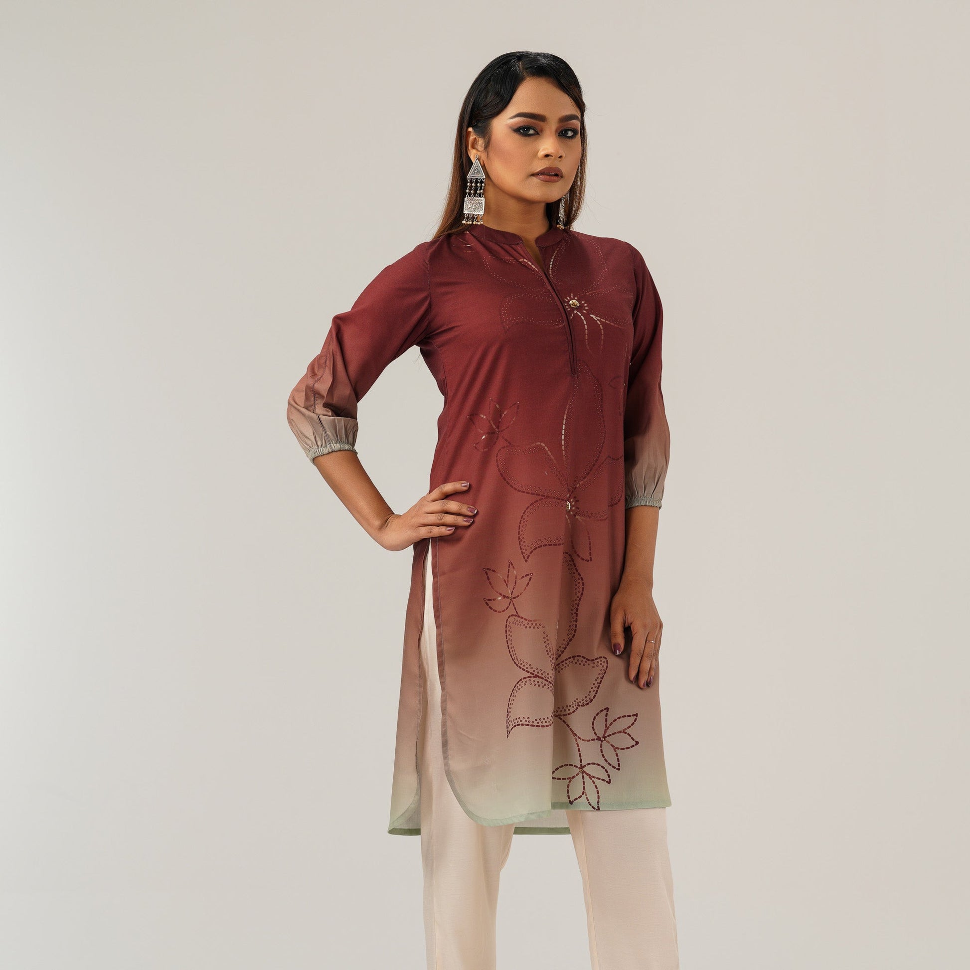 This elegant ethnic kurti features a beautiful digital print enhanced with intricate sequence work, adding a touch of sophistication. Designed with stylish balloon sleeves, it offers a contemporary yet traditional look. Made from blended cotton, this Kurti ensures both comfort and effortless grace, making it a perfect choice for any occasion.