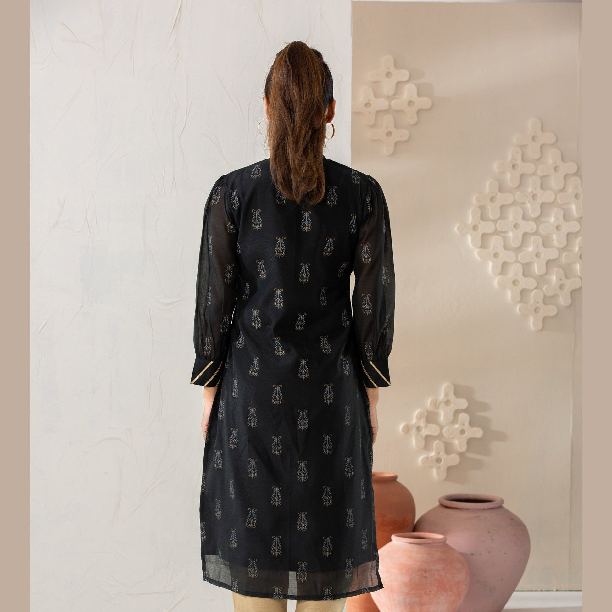 This elegant Black-colored high-range kurti features intricate print, embroidery, and delicate ribbon lace detailing. Embellished with beads, it’s crafted from luxurious silk fabric, offering a stylish yet comfortable fit. Perfect for festive occasions or special gatherings.