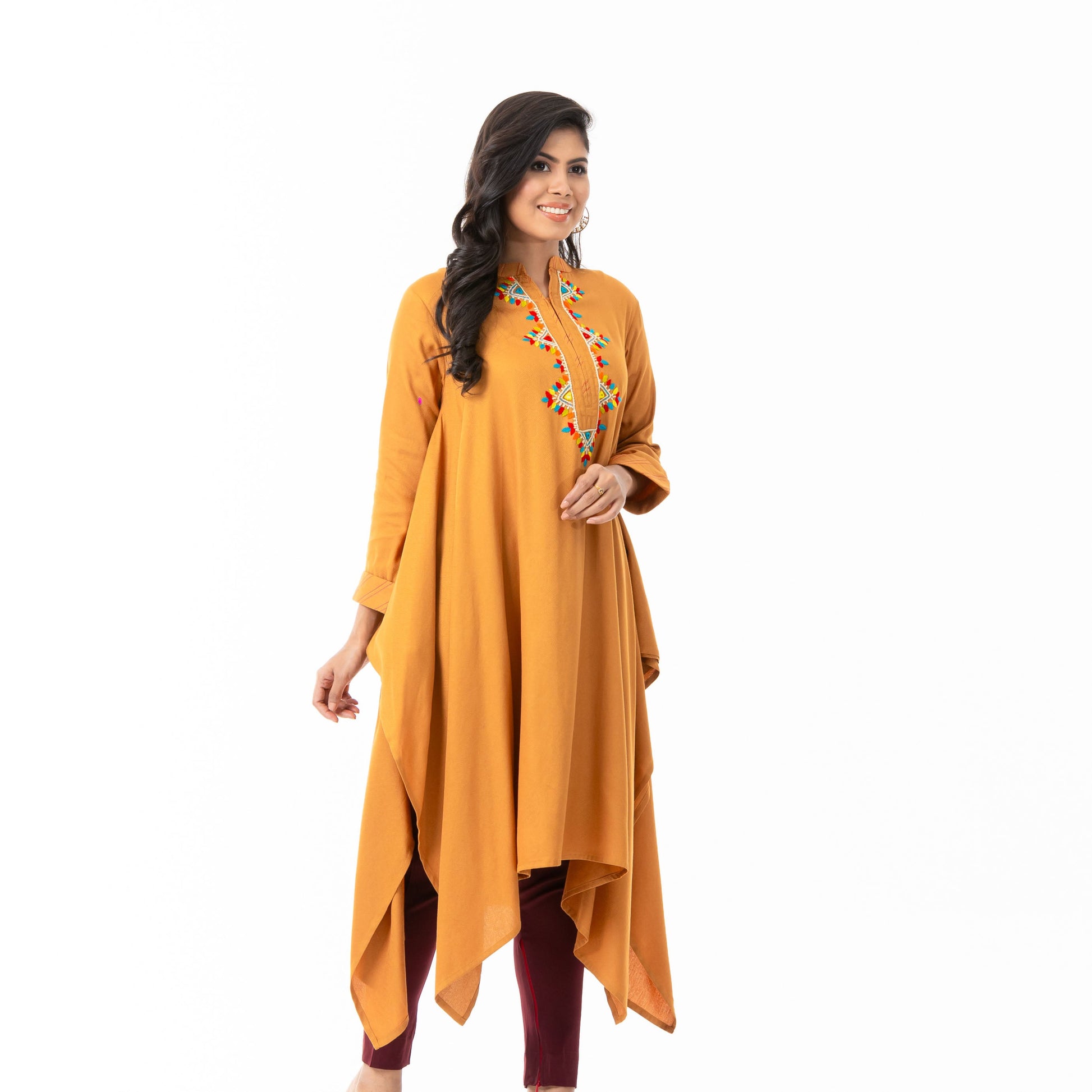 This women’s mustard fusion Kurti is made from premium jacquard fabric and detailed with beautiful handwork embroidery on the neckline. Crafted from breathable cotton, it offers an oversized fit for a comfortable yet stylish appearance. A perfect choice for both casual and festive occasions.