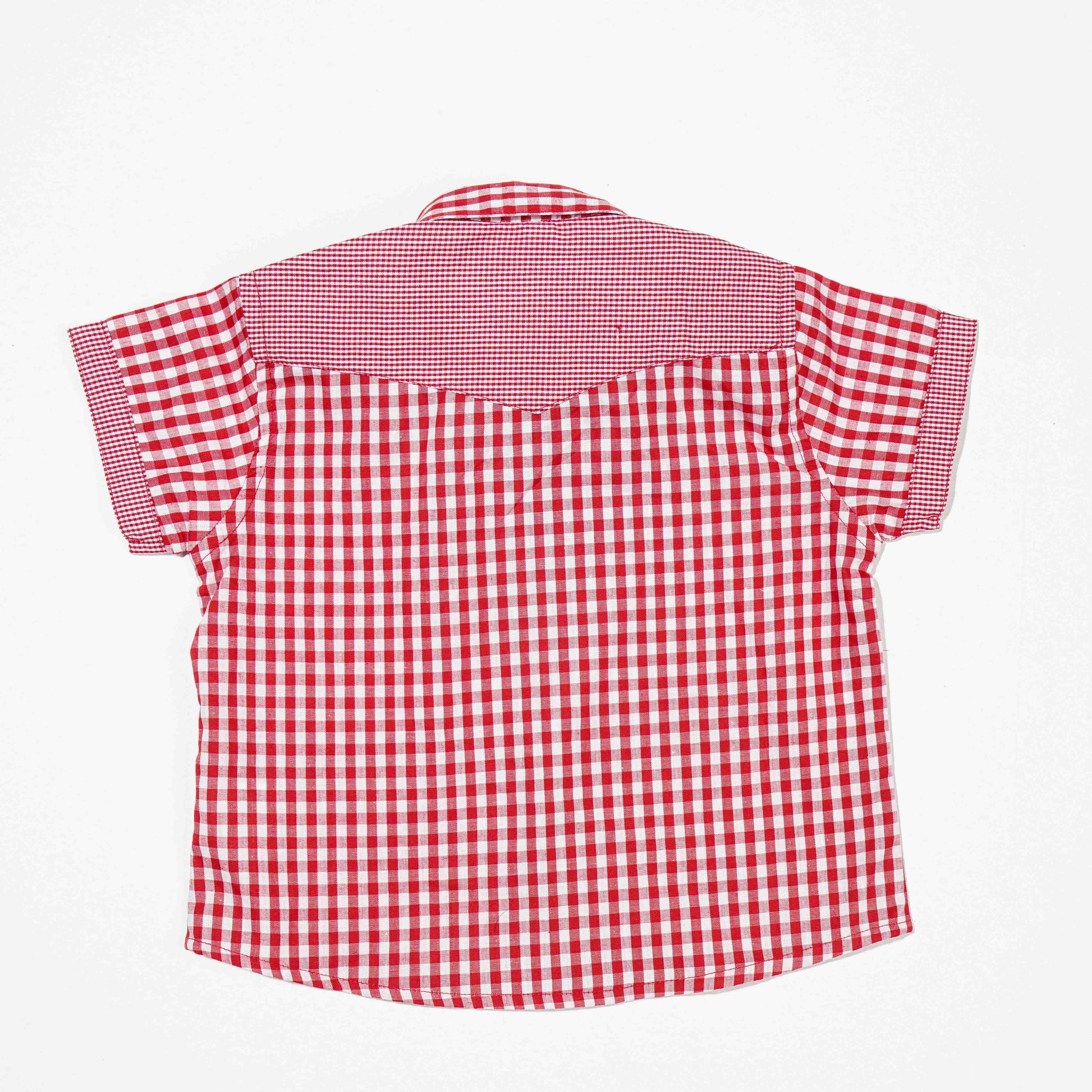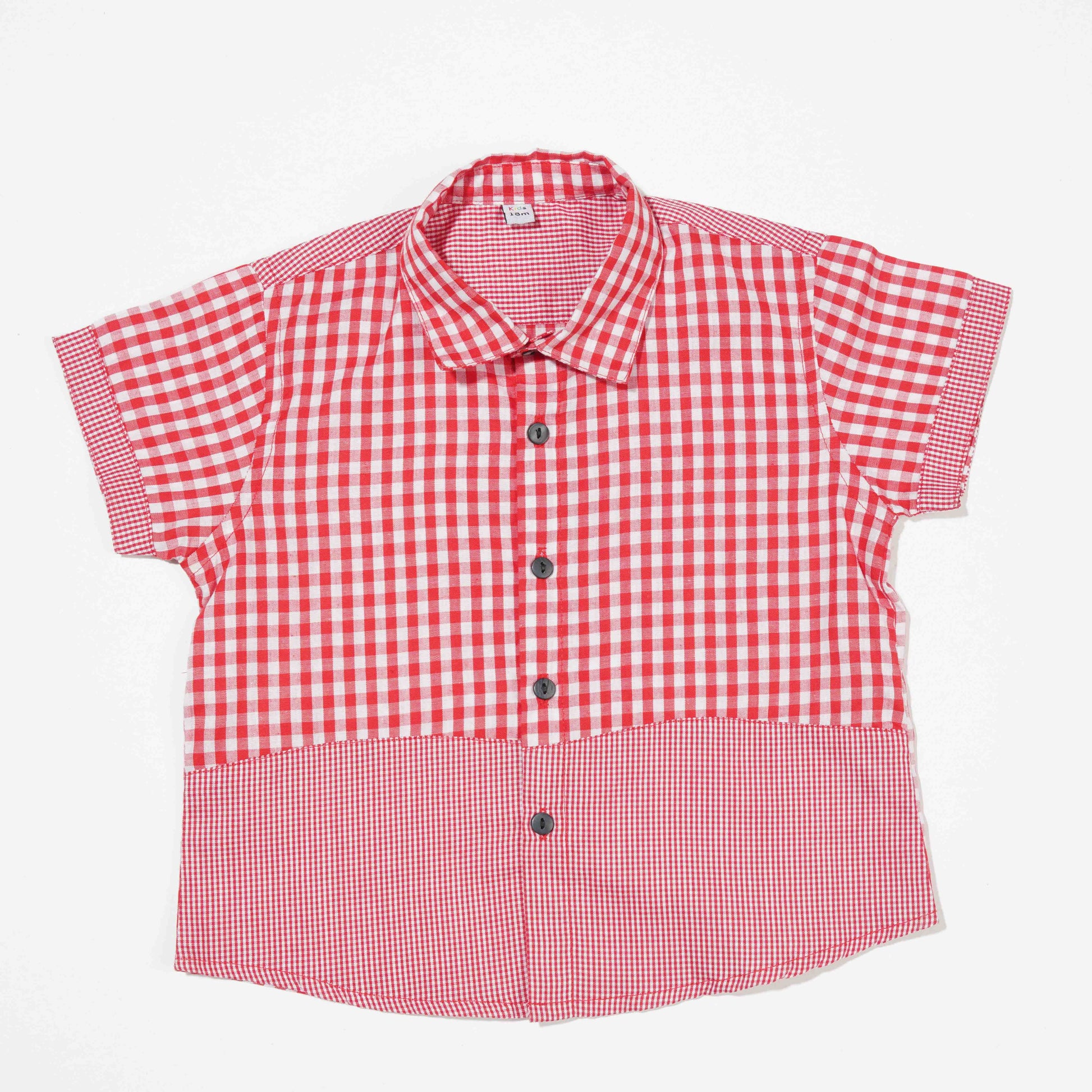 This red 2-piece set for newborn boys features a unique cut-and-sew design with two types of check patterns on the button-down top, paired with a solid bottom. Crafted from soft cotton, it ensures a comfortable and regular fit, making it perfect for everyday wear.