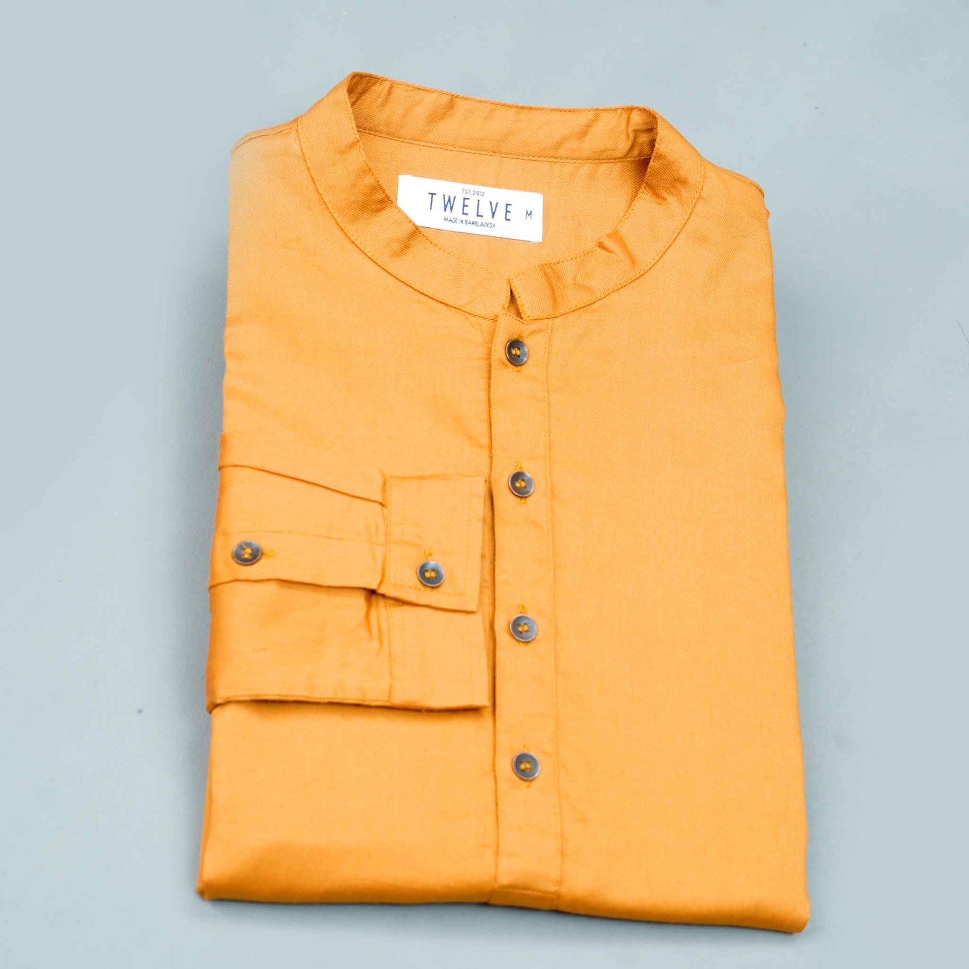 Elevate your traditional attire with this men's mustard solid panjabi. Featuring metal buttons and crafted from a poly-cotton blend, it provides a comfortable regular fit. Perfect for cultural events and festive occasions, this panjabi adds a touch of vibrant sophistication to your look.
