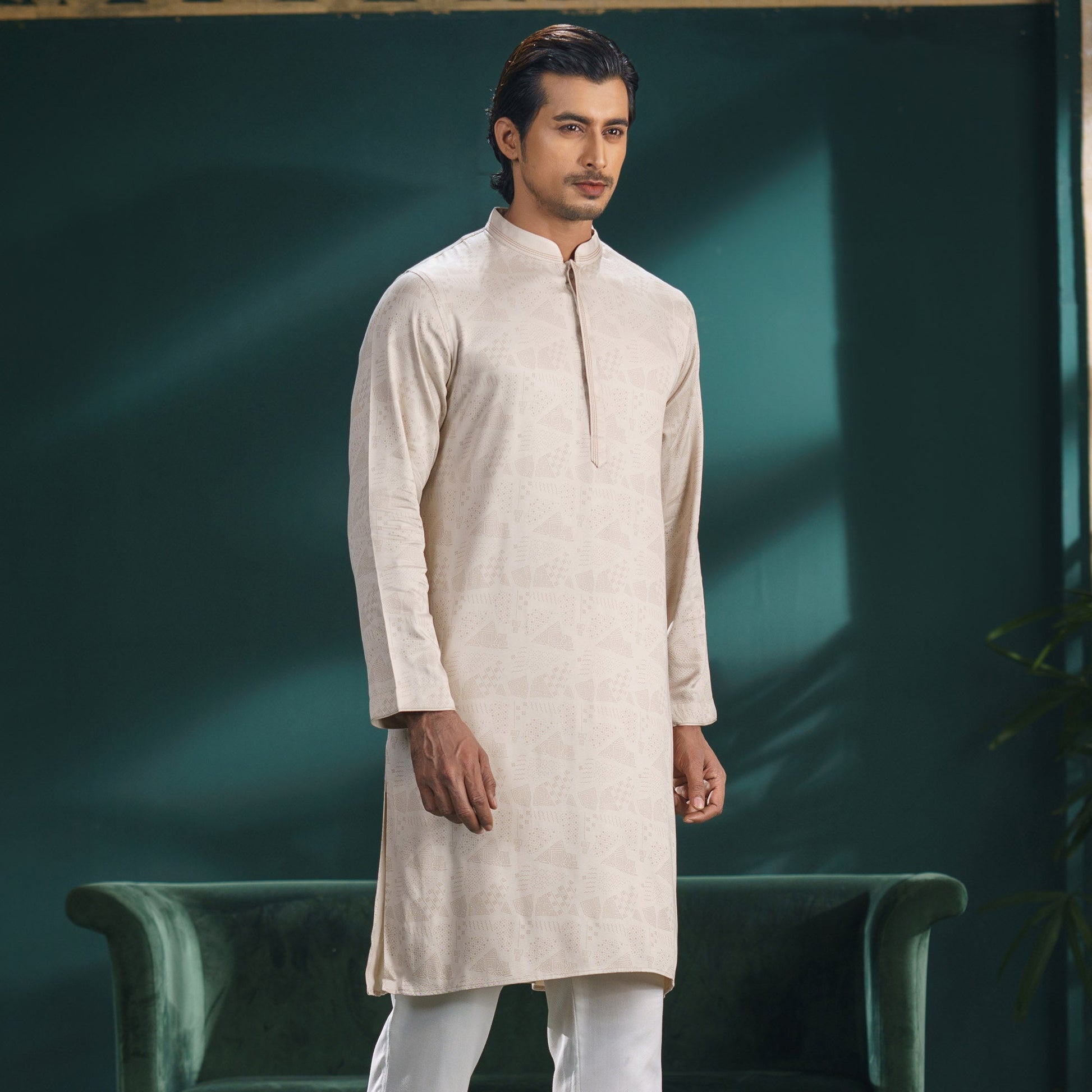 This men's ivory Panjabi is crafted from premium linen, featuring an all-over print with a collar and placket embellished by detailed stitching. Metal shank buttons and a regular fit complete the look, blending traditional elegance with modern sophistication. Perfect for formal events or special occasions, this Panjabi is a distinguished addition to any wardrobe.