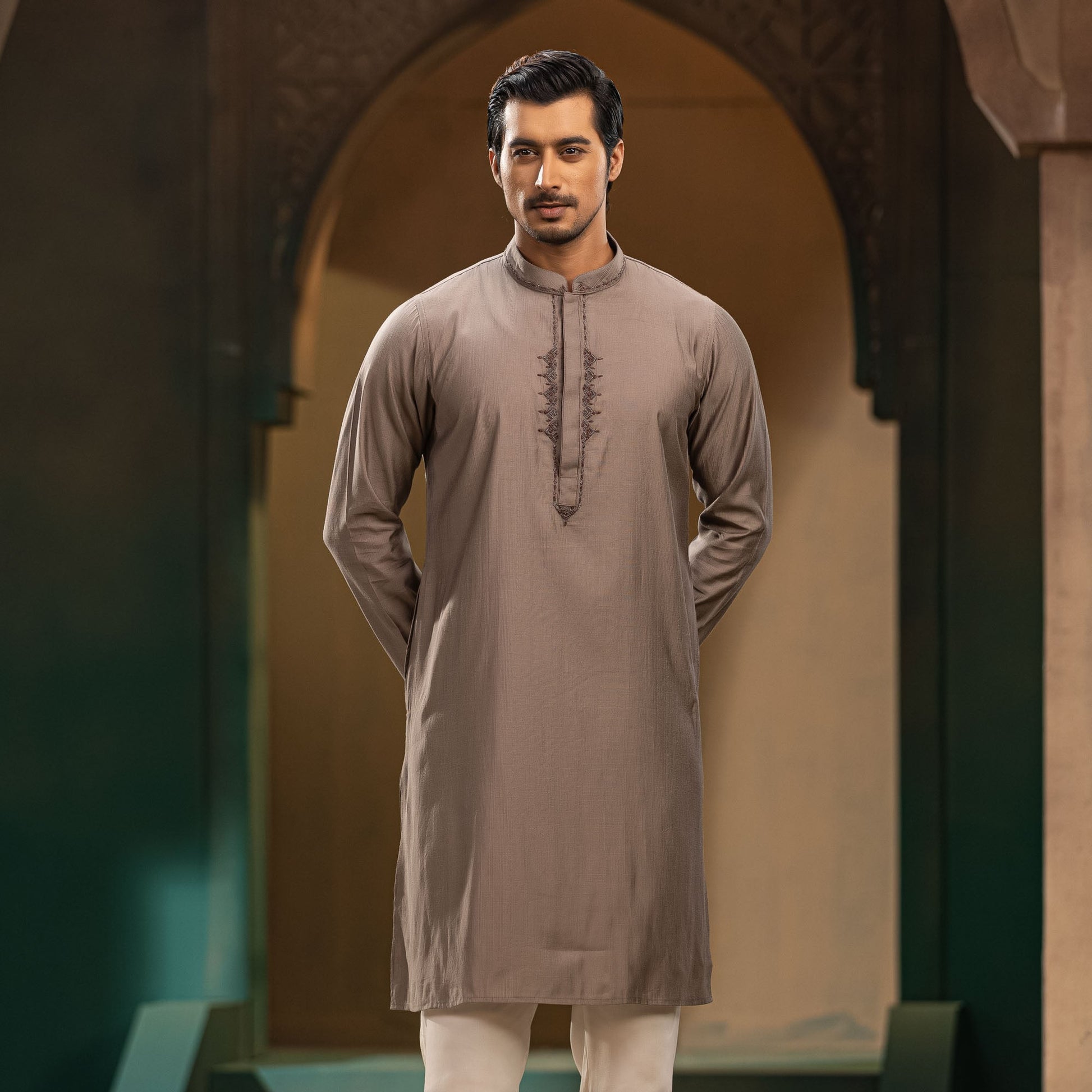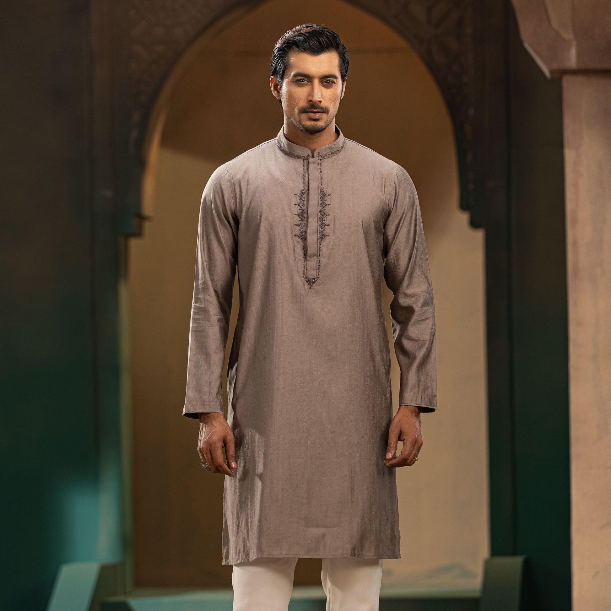 This men’s taupe karchupi Panjabi features a mandarin collar adorned with zardozi embroidery and metal shank buttons. Made from poly cotton, it offers a regular fit and is available in panjabi size, ideal for adding a touch of elegance to traditional and festive occasions.