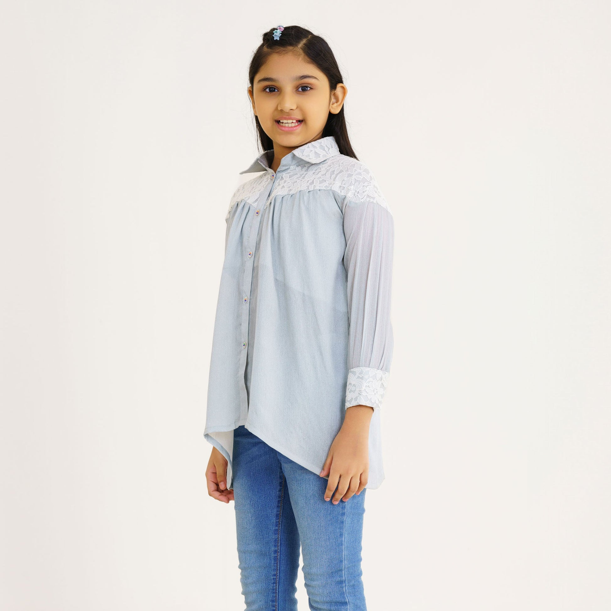 Teen girls’ silver tunic crafted from luxurious silk and viscose fabric for a soft, elegant drape. Designed in a shirt-style silhouette with a button-down front, it combines modern charm with effortless comfort. Perfect for festive occasions, parties, or stylish casual wear.