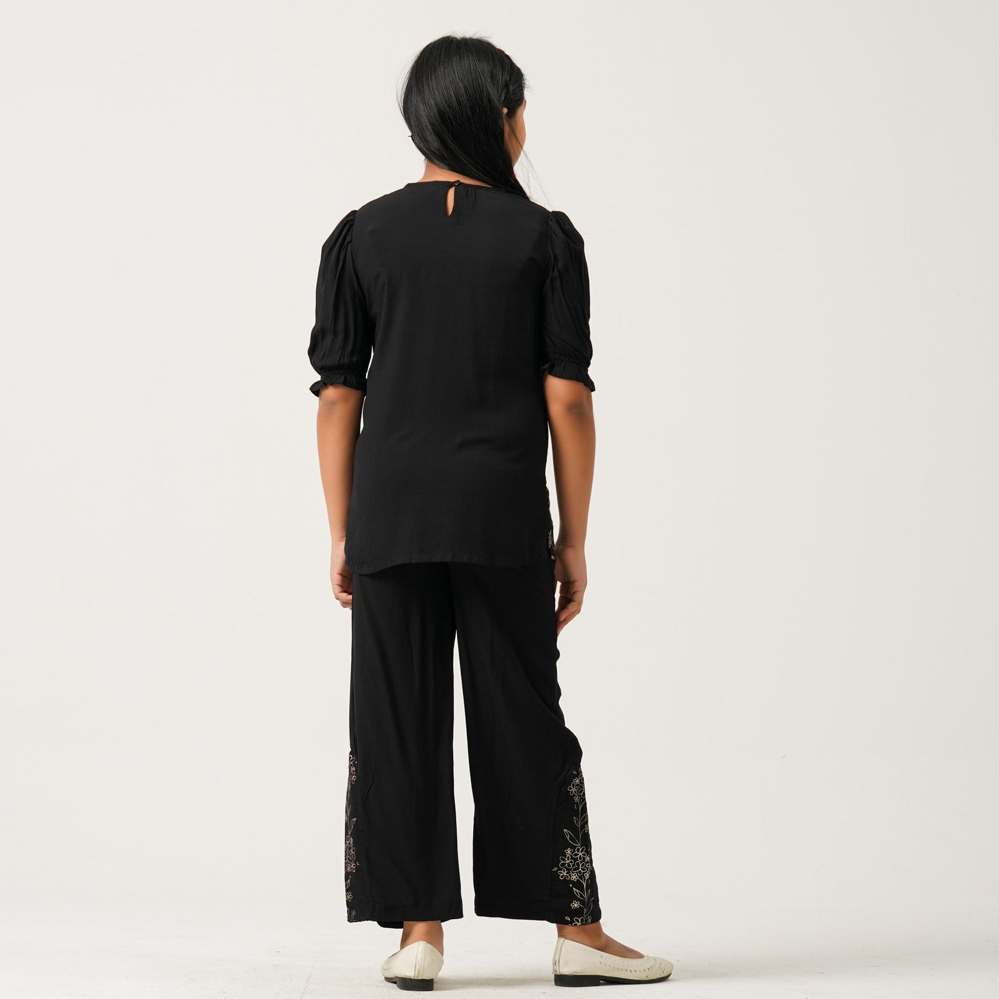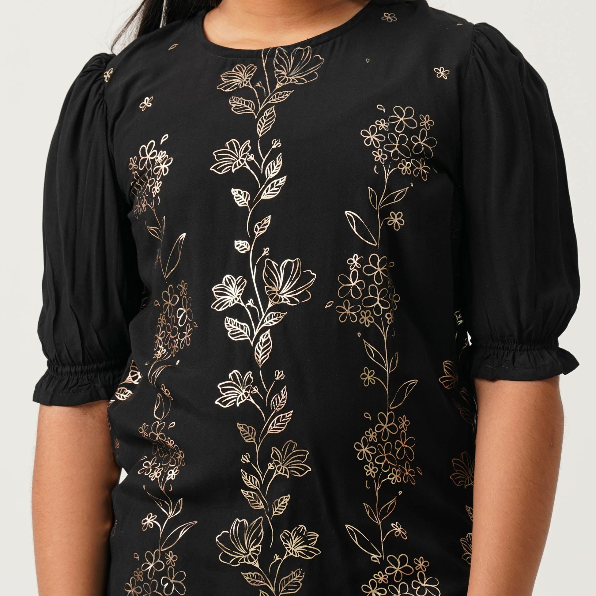 Charming two piece girls set crafted from soft linen, featuring elegant foil floral prints for a festive touch. Lightweight and breathable—perfect for any celebrations or special occasions.