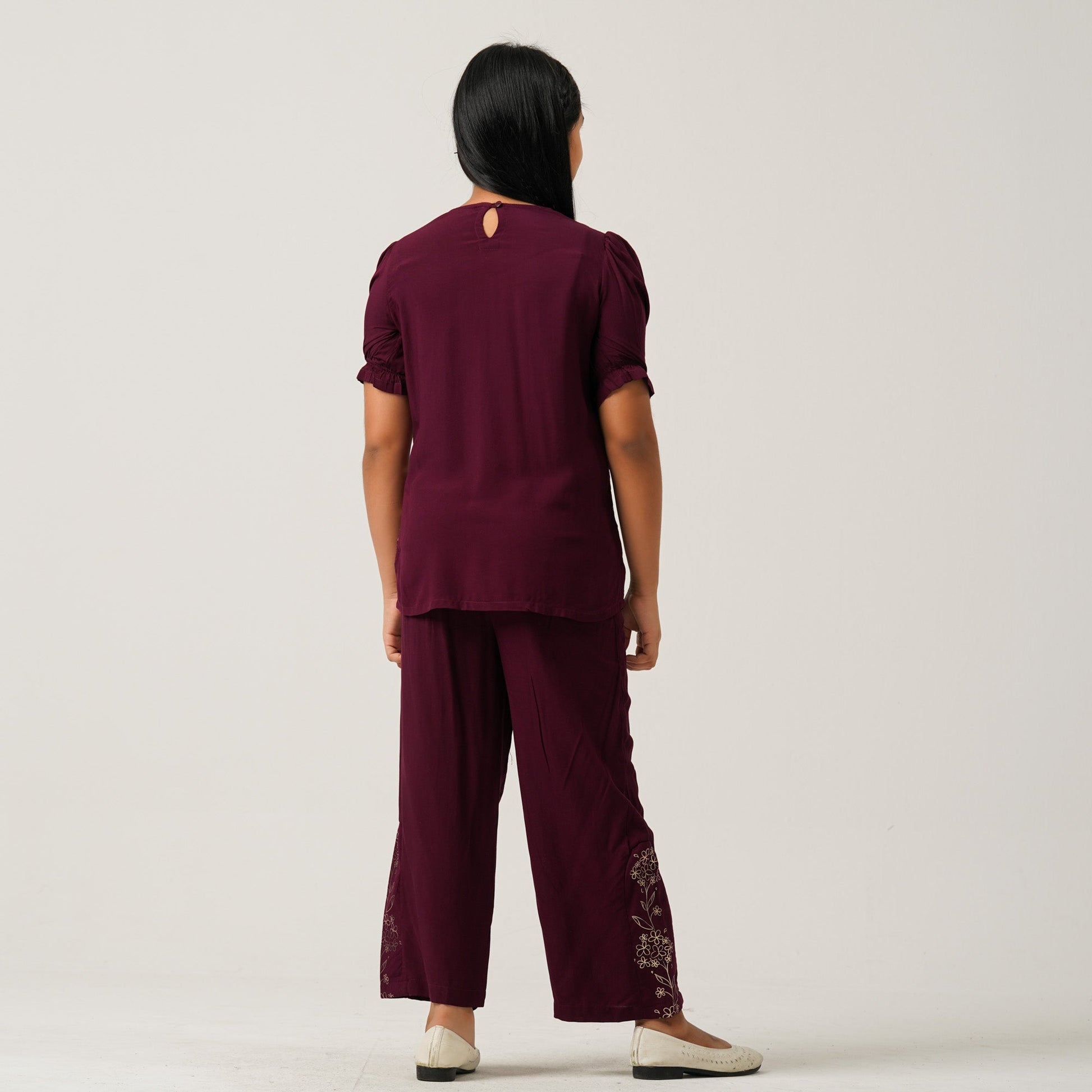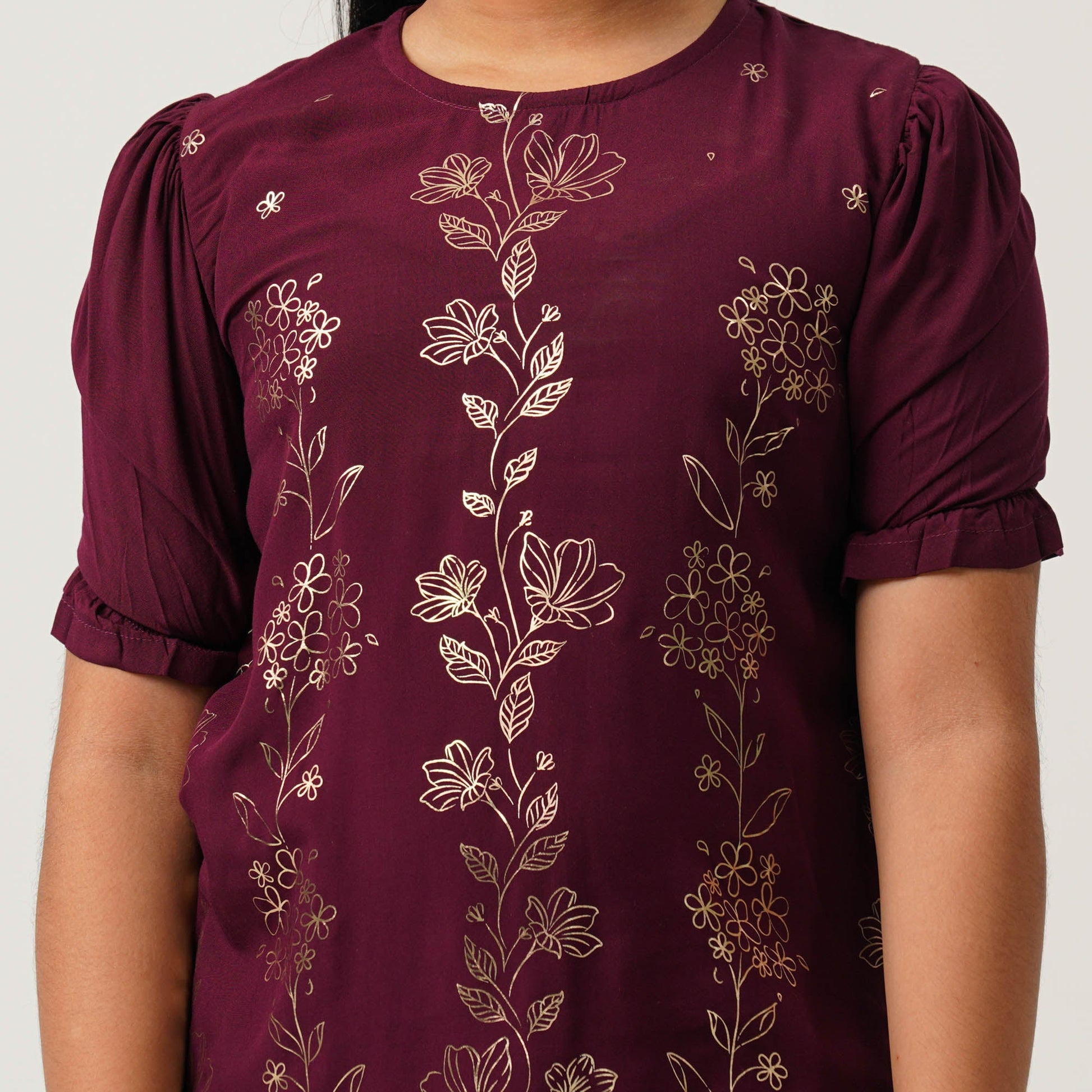 Charming two piece girls set crafted from soft linen, featuring elegant foil floral prints for a festive touch. Lightweight and breathable perfect for any celebrations or special occasions.