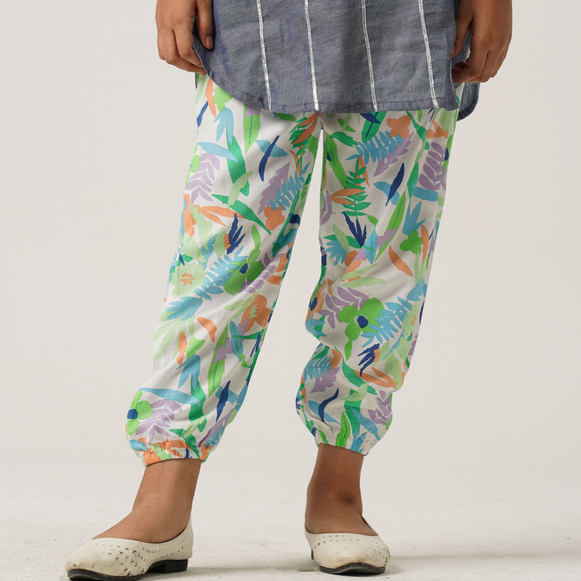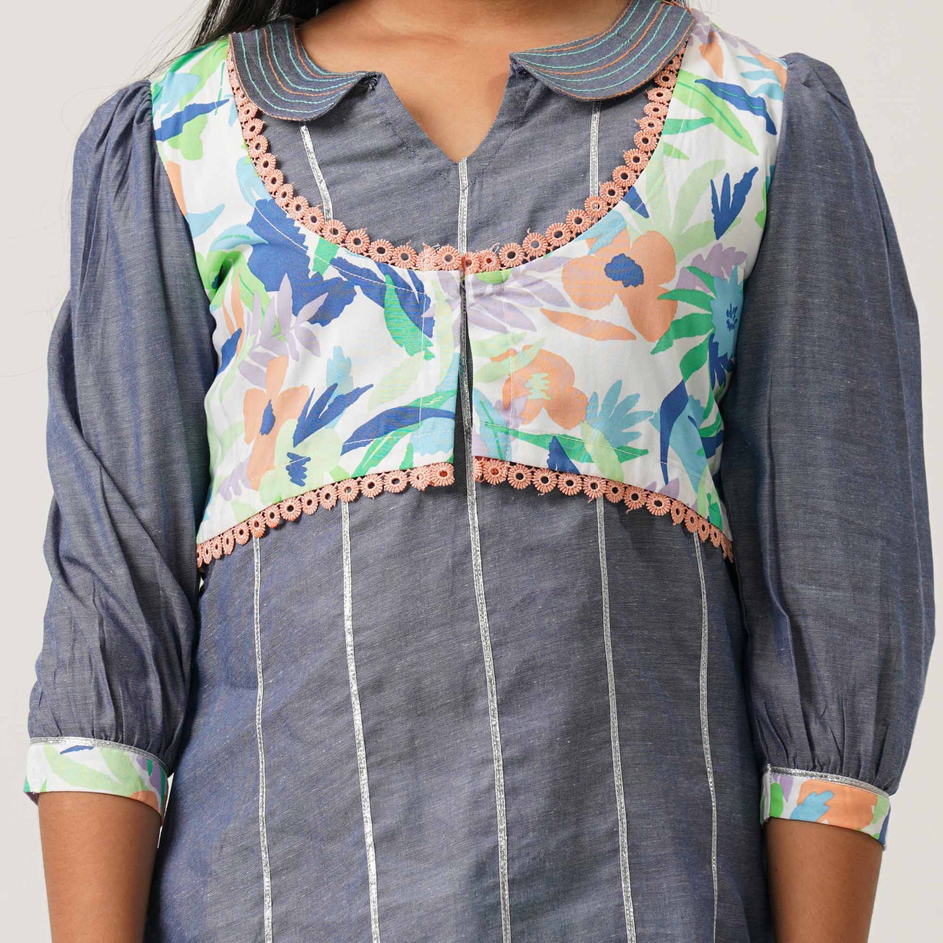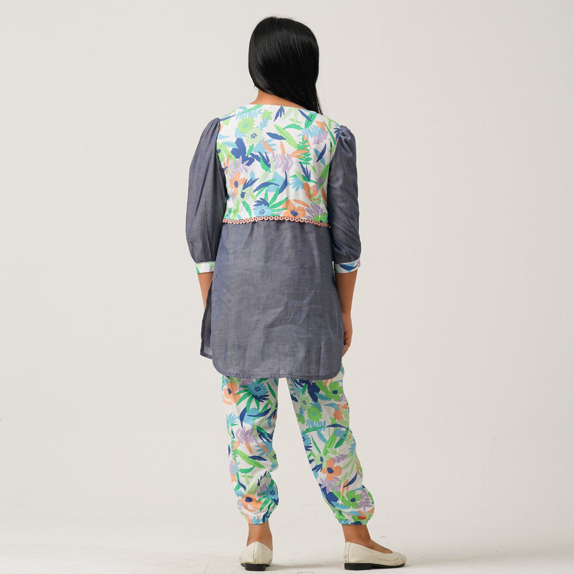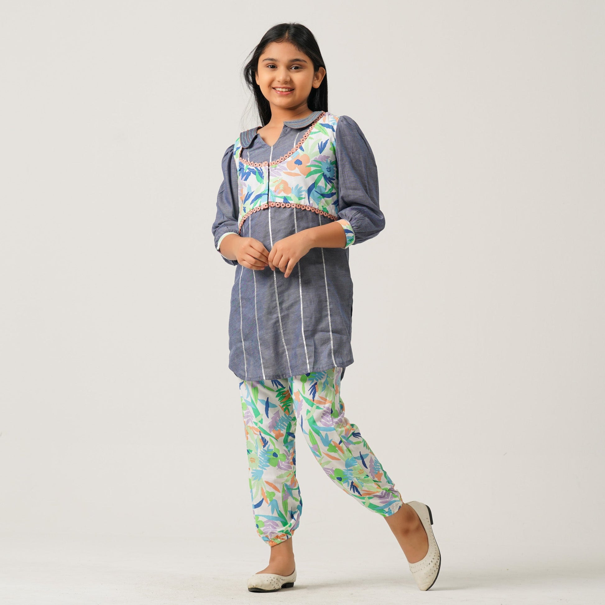 This stylish two piece set features a comfy chambray top layered with a printed linen koti for a trendy look. It comes with matching printed linen cuffed pants, making it a perfect blend of comfort and festive style for girls.