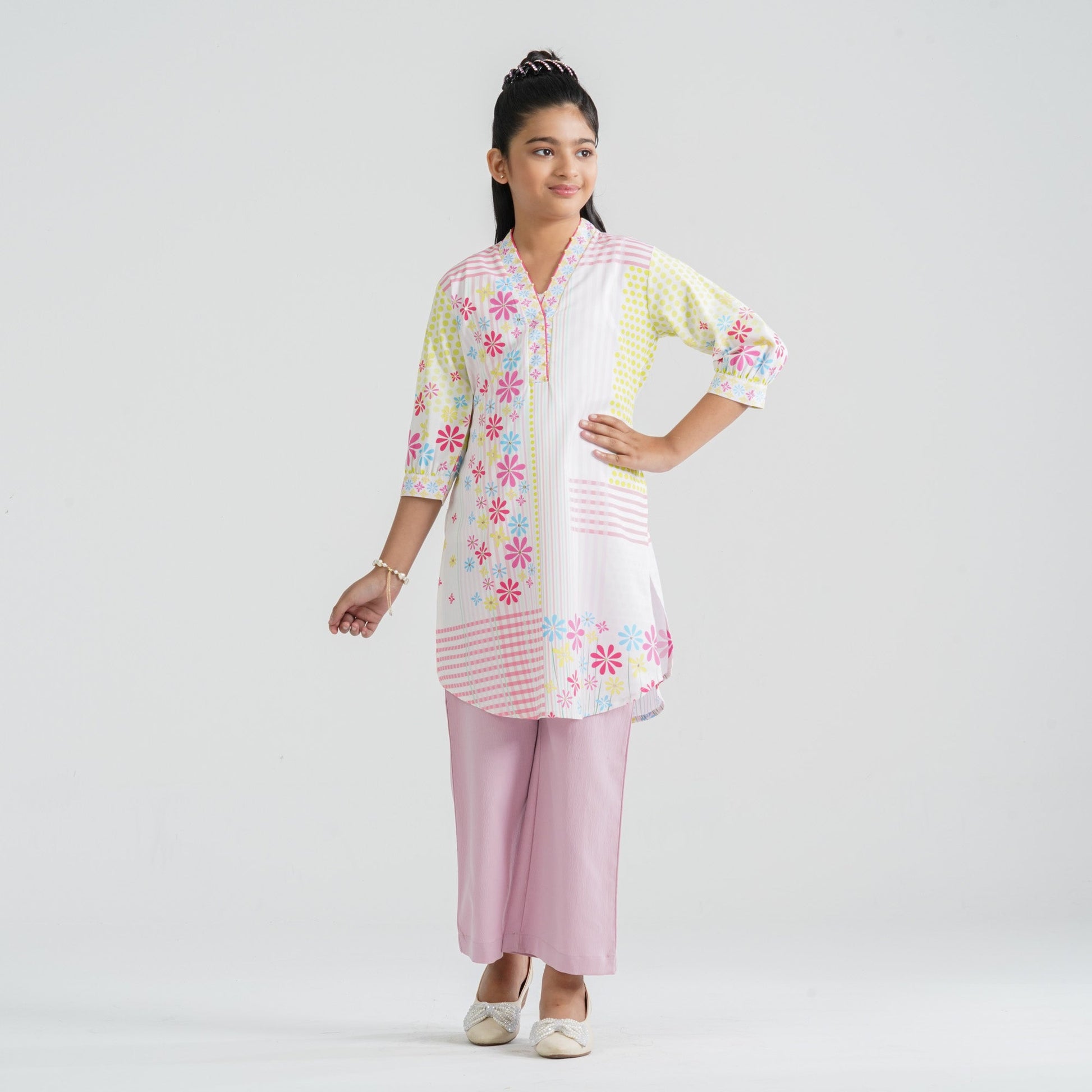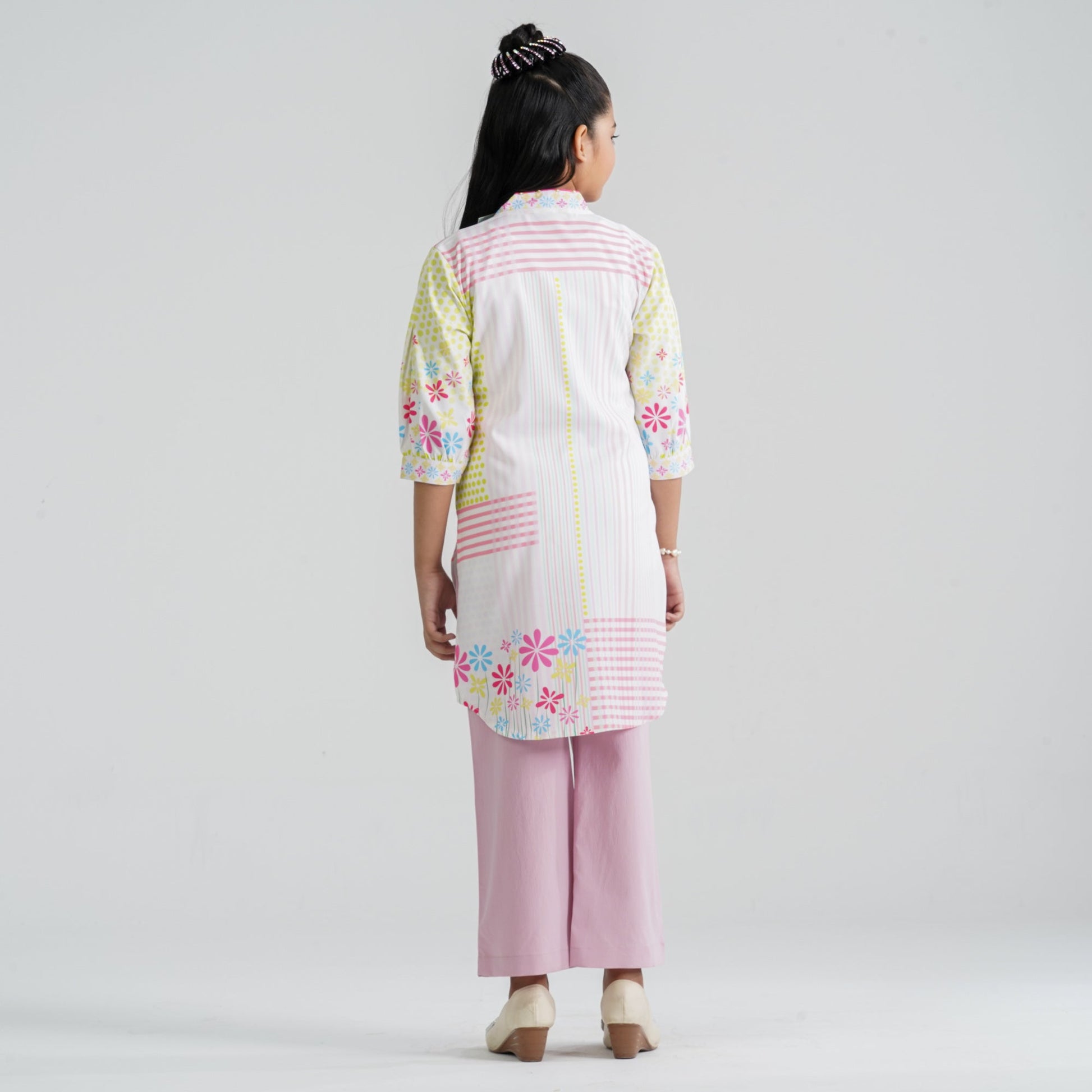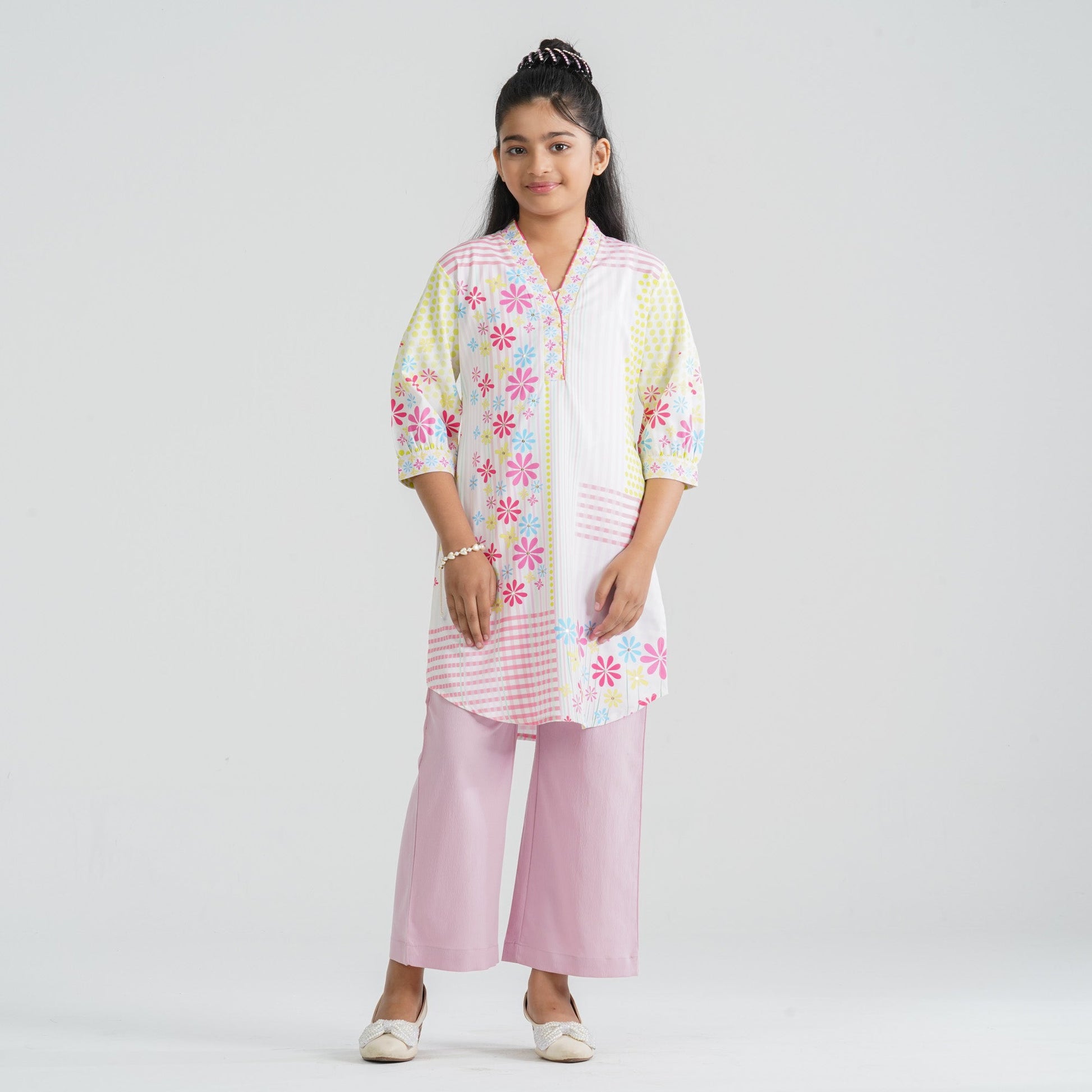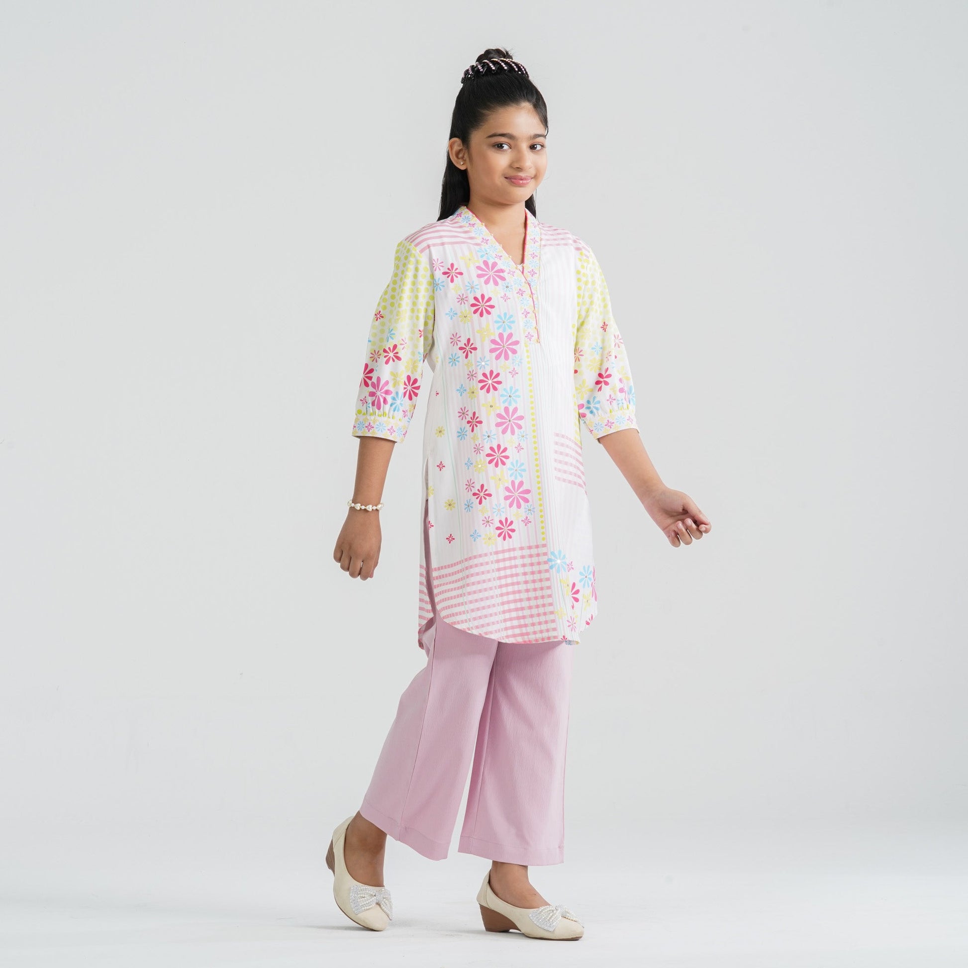 Crafted from lightweight crinkle georgette for the kameez and paired with a soft viscose pant, this girl’s pink two piece ethnic set ensures comfort with elegant style. The straight-cut kameez features vibrant digital prints enhanced with delicate sequin work for a subtle festive sparkle. The coordinated straight pant completes the smart and graceful silhouette. Perfect for festive occasions, cultural events, and family gatherings.