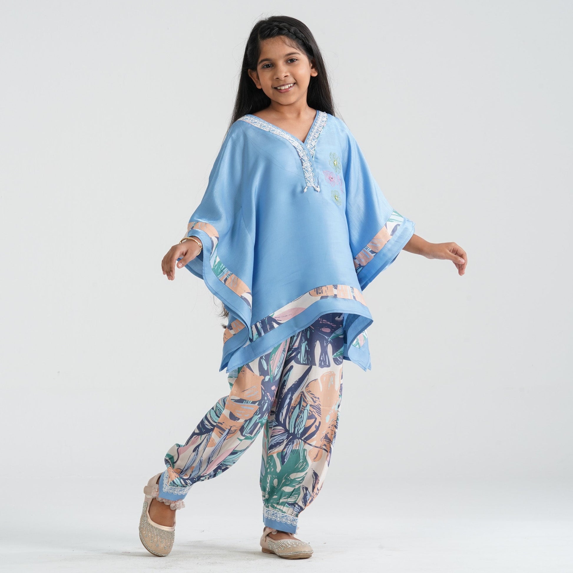 Crafted from shimmery woven fabric for the kaftan-style top and printed viscose for the baggy pant, this girl’s blue two piece ethnic set offers comfort with festive elegance. The flowy kaftan top is beautifully detailed with embroidery, sequin accents, and delicate lace for added charm. The relaxed baggy pant ensures easy movement while maintaining a trendy traditional look. Perfect for festive celebrations, cultural programs, and special occasions.