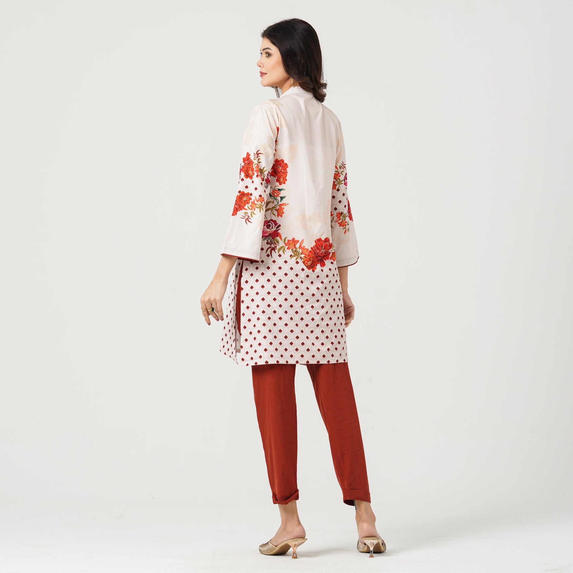 This festive two-piece set features a straight-cut top with geo and floral digital prints, enhanced with pearl-bead detailing at the drop neck. The straight-fit TC cotton pant has a folding hem, creating a comfortable and elegant ethnic look, perfect for festive occasions.
