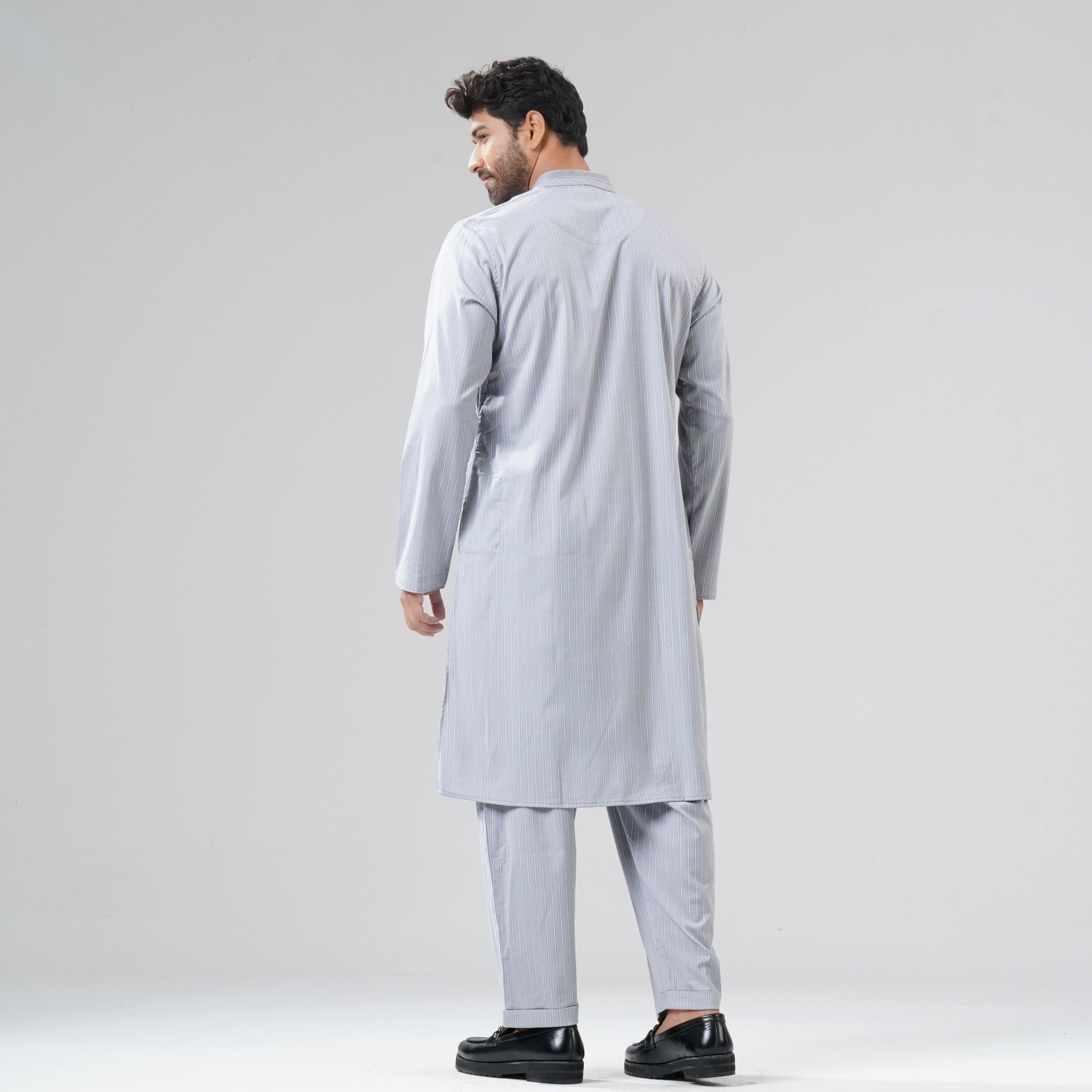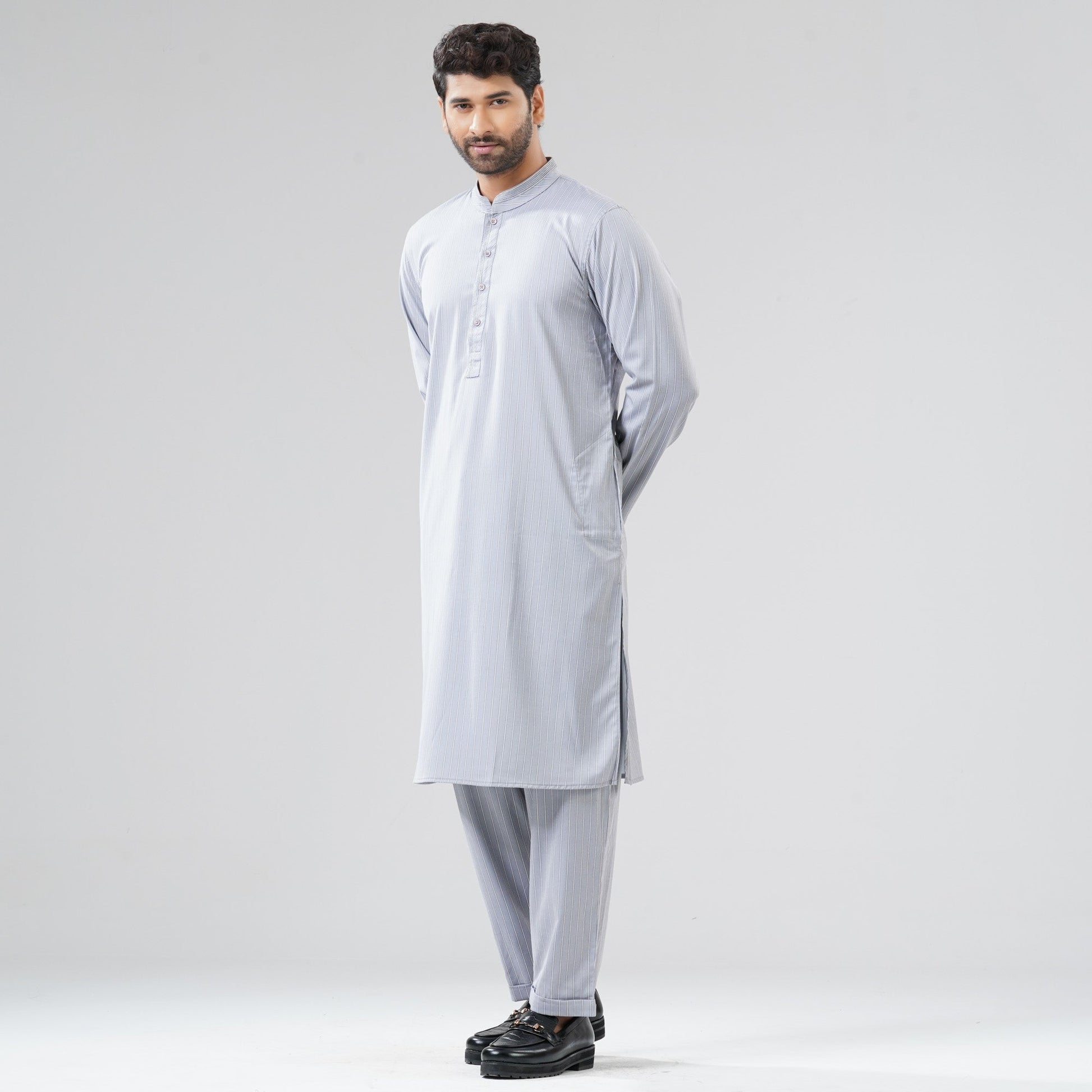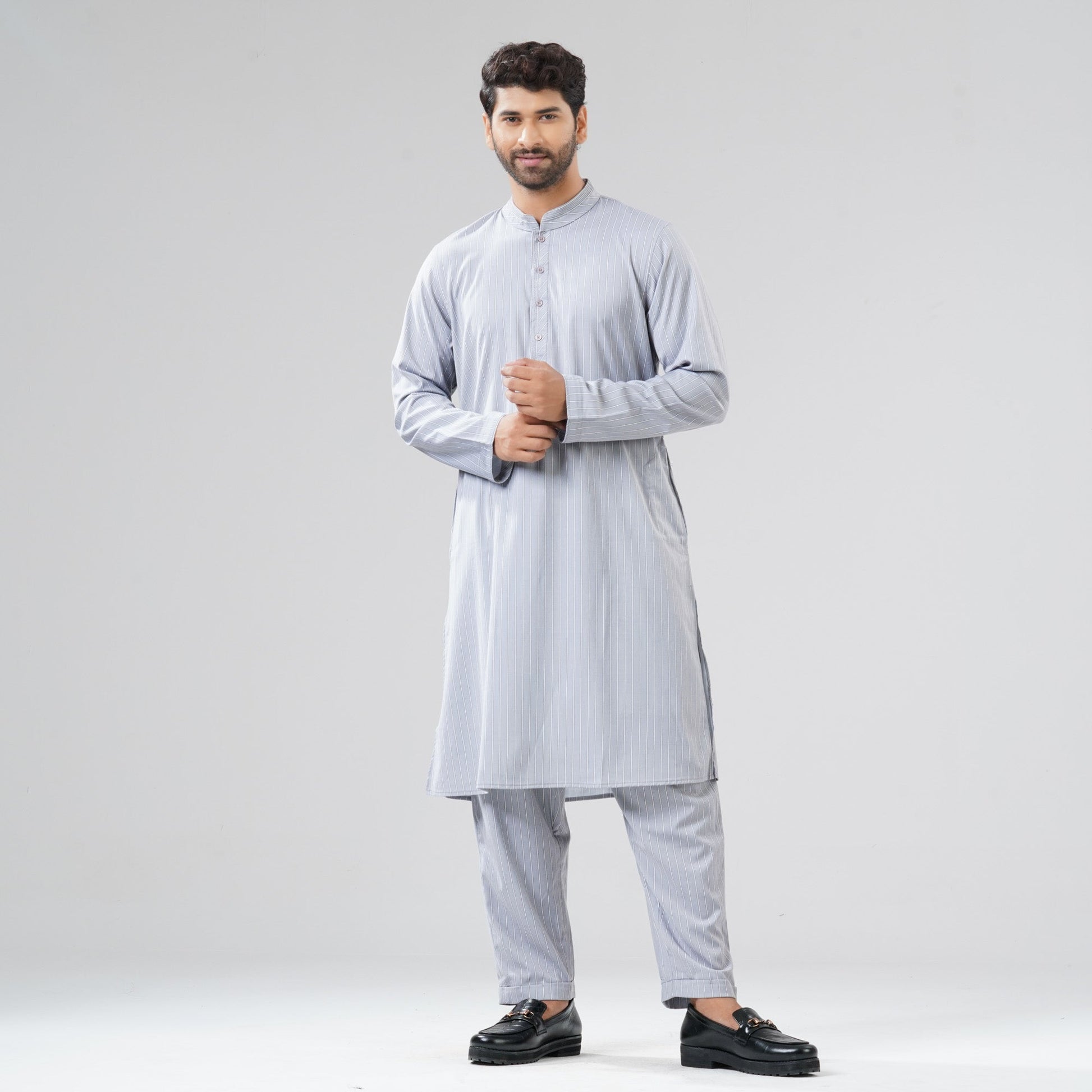 This men’s striped 2-piece panjabi set combines traditional charm with modern style. Made from premium fabric, it ensures comfort and a polished look. The panjabi features intricate pattern and stitch detailing on the collar, paired with a matching pajama for a complete, elegant ensemble. Perfect for festive occasions and formal events.