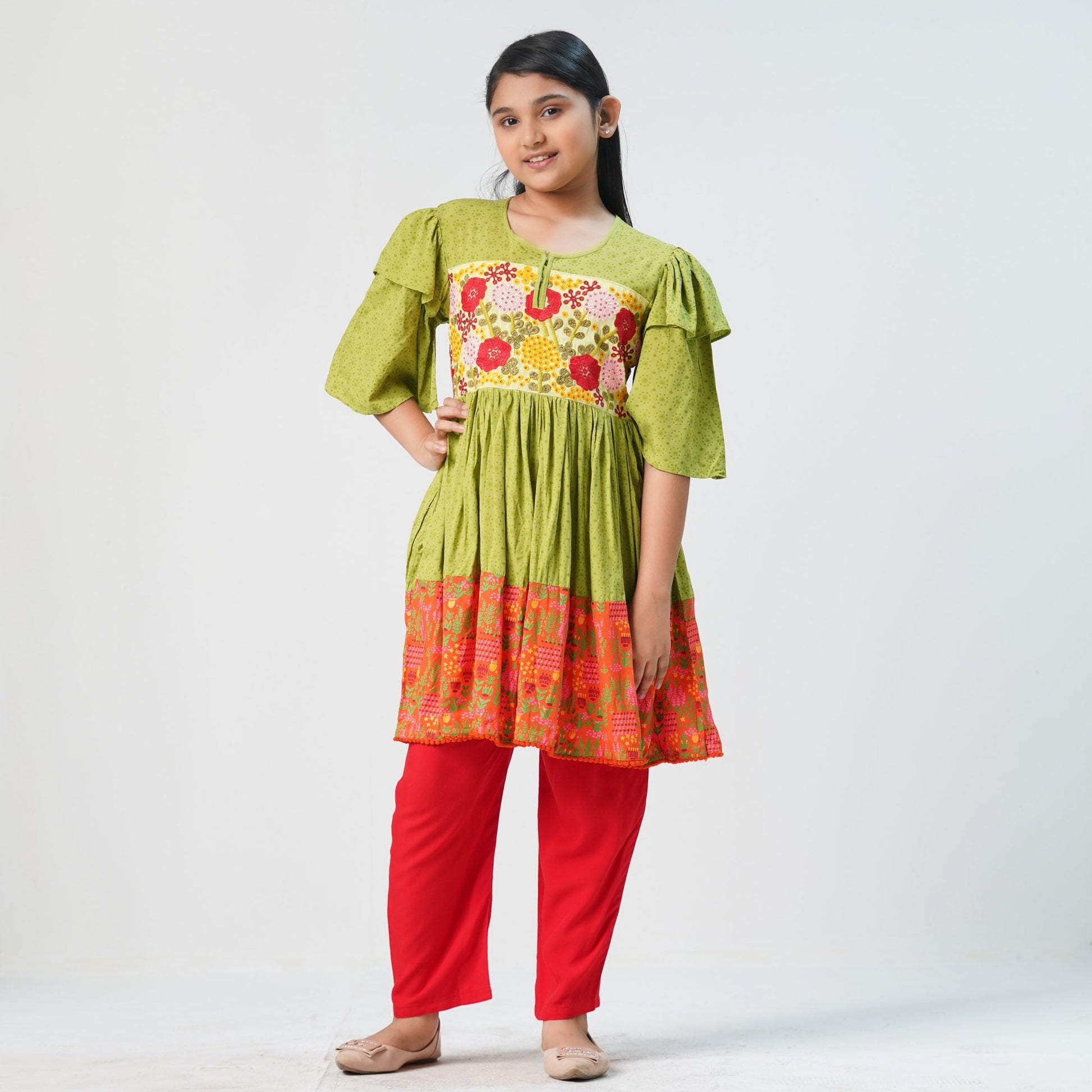 Indulge in luxury with our girl's three-piece set. This exclusive 3-piece ensemble features intricate embroidery and beading, adding a touch of sophistication and elegance. Made from a blend of premium cotton silk and printed linen, this fusion of fabrics promises comfort and style. Elevate your little girl's wardrobe with this must-have set.