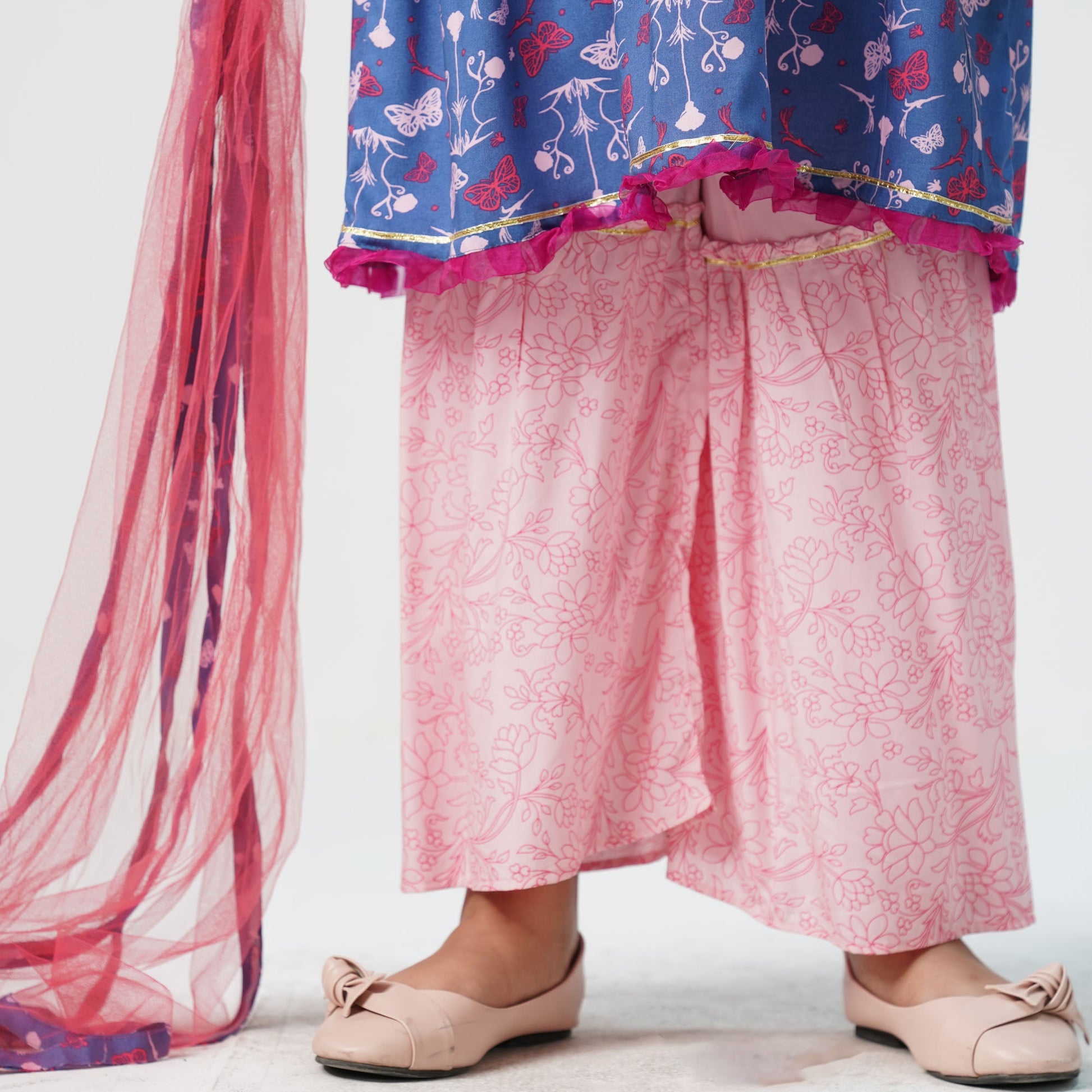 This charming three piece set is made from breathable printed linen fabric, ensuring comfort and style. Featuring delicate lace work on the chest, it adds an elegant touch to the design. Perfect for festive occasions or casual outings, this set blends traditional charm with modern aesthetics.