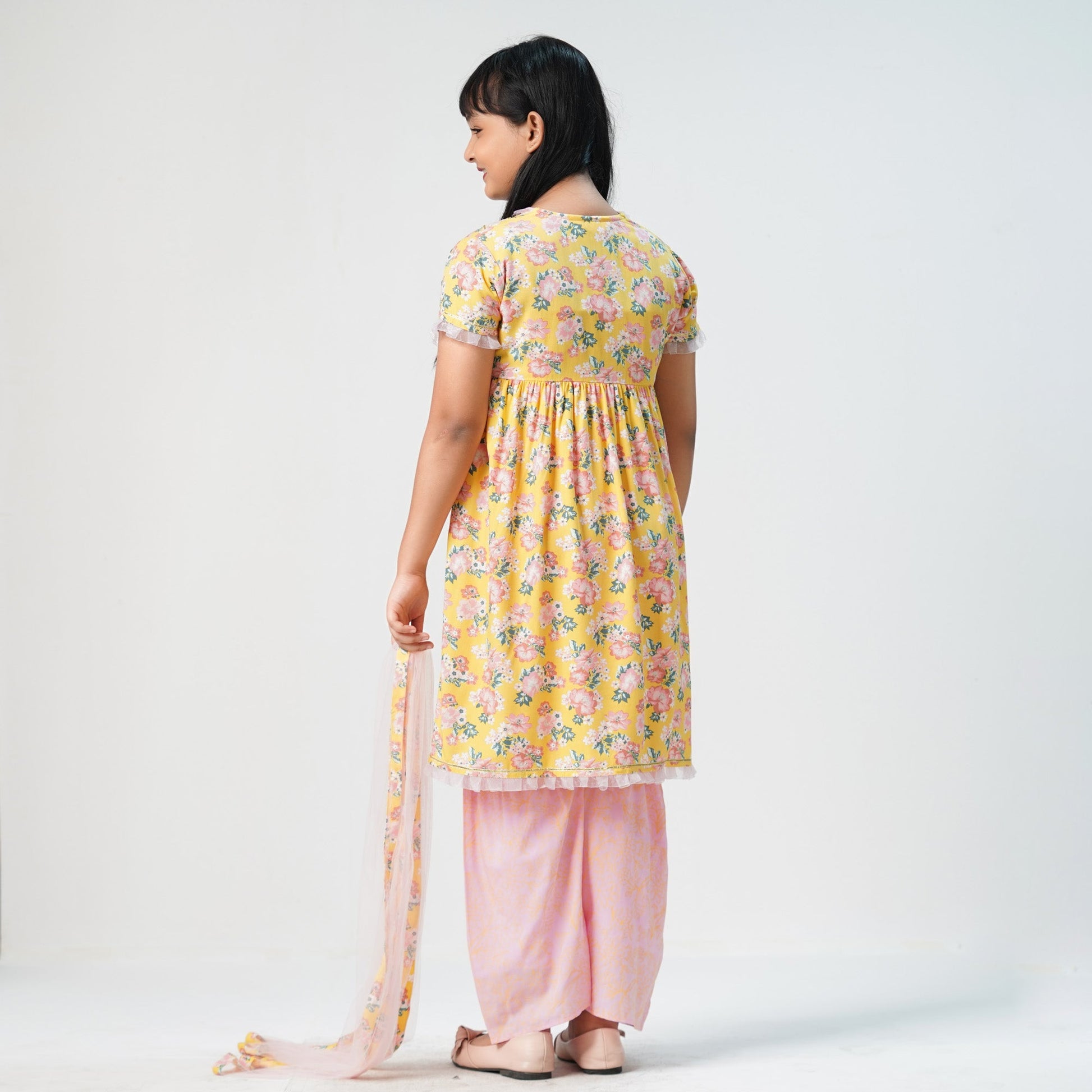 This charming three piece set is made from breathable printed linen fabric, ensuring comfort and style. Featuring delicate lace work on the chest, it adds an elegant touch to the design. Perfect for festive occasions or casual outings, this set blends traditional charm with modern aesthetics.