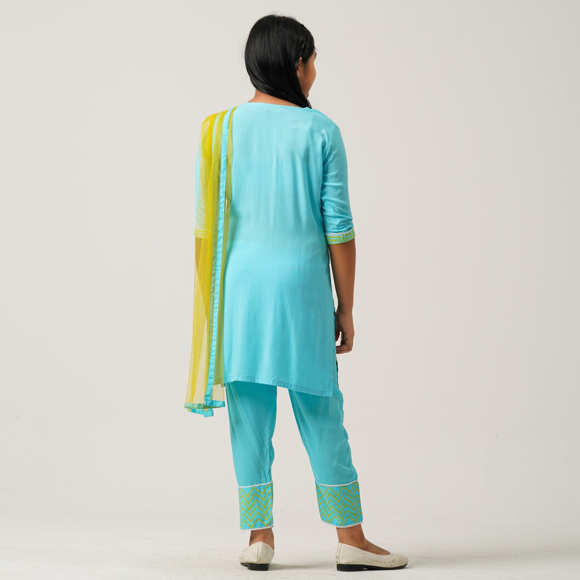Elegant three piece linen set for girls featuring placement block prints and delicate beadwork. The breathable fabric ensures all-day comfort, while the detailed design adds a festive charm perfect for any celebrations.