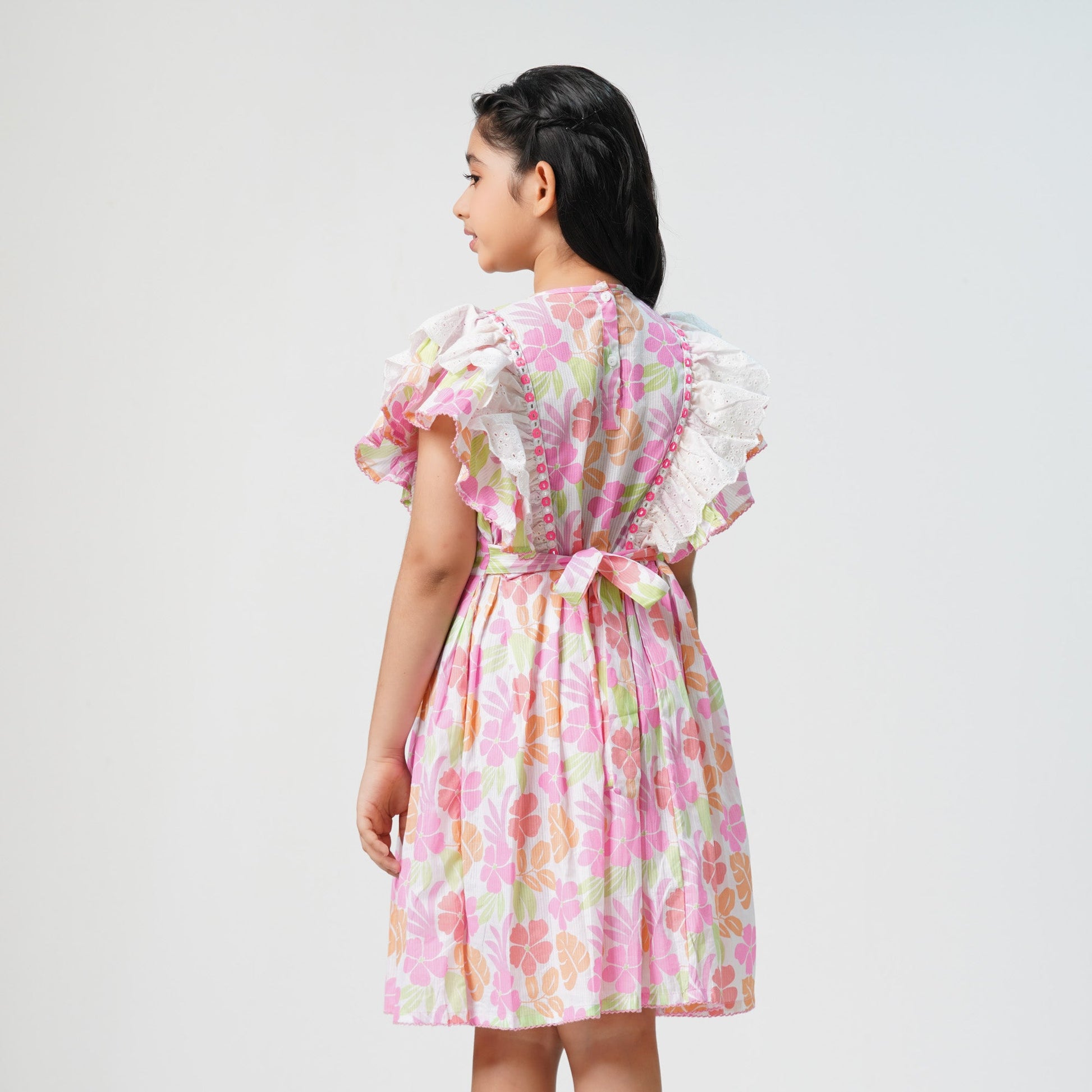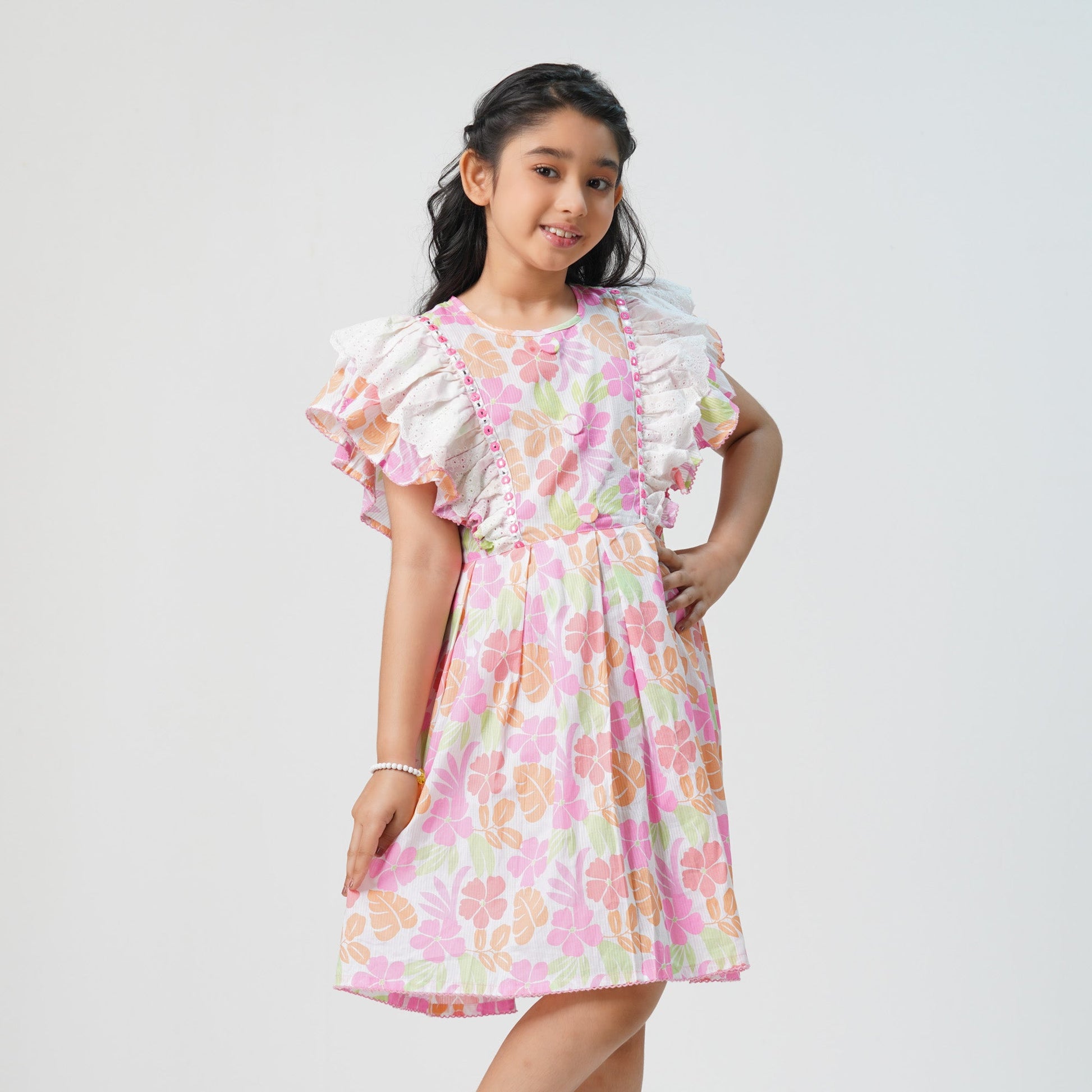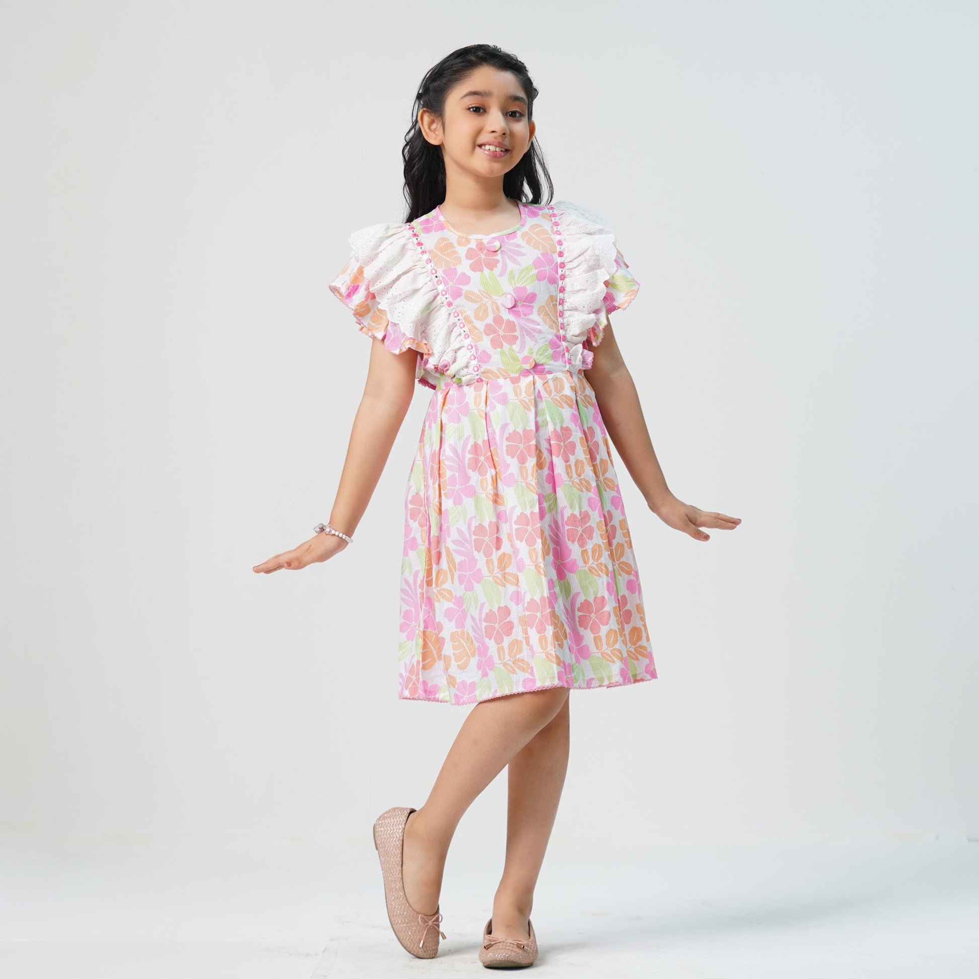 This charming cotton frock features a beautiful floral print, enhanced with delicate crochet lace and intricate embroidery details. Soft and breathable, it ensures all-day comfort while adding a touch of elegance. Perfect for any celebrations and special occasions, this dress is a delightful blend of style and comfort for your little one.